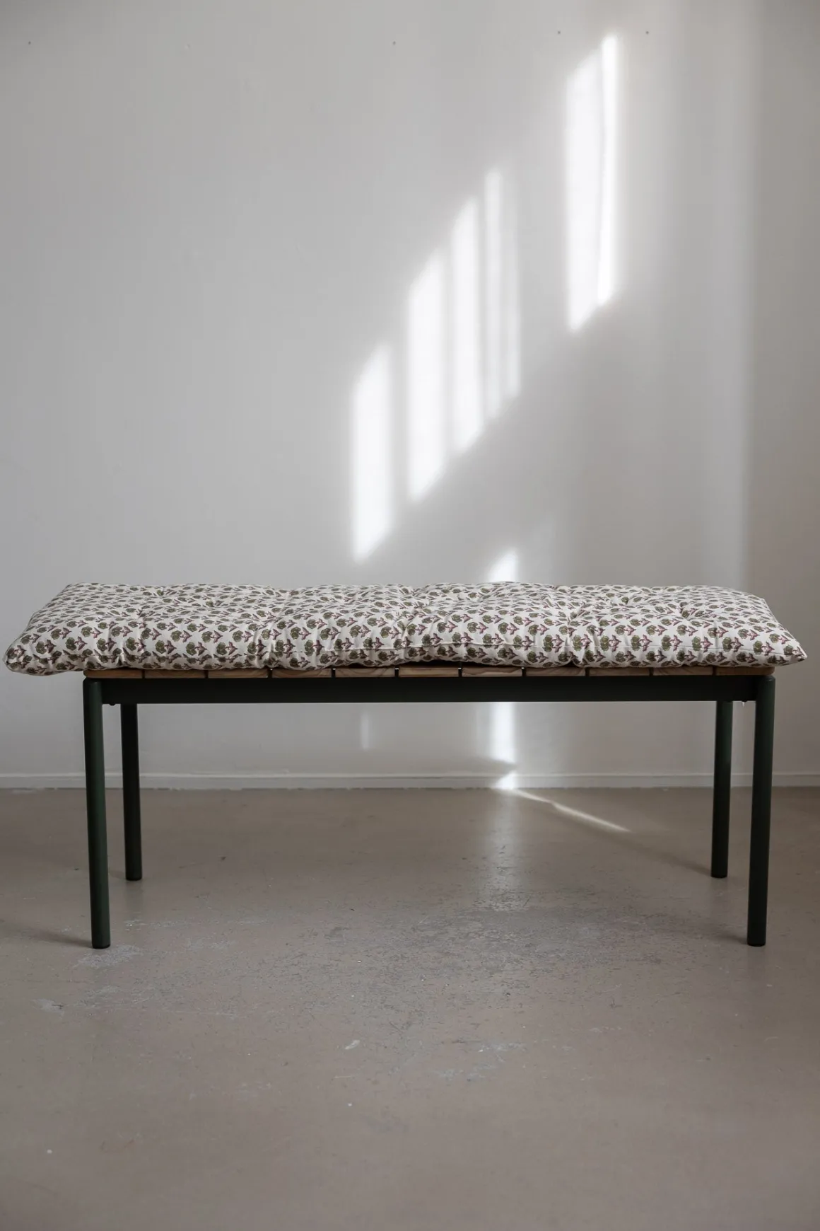 Fargerik bomullsmadrass med heldekkende trykk, inspirert av tradisjonelle indiske blokktrykk. Madrassen gir benken et nytt og levende uttrykk samtidig som den sørger for ekstra komfort. Den passer perfekt både inne og ute på terrassen, og tilfører en lun og innbydende stemning uansett hvor du plasserer den. Fyllet består av resirkulerte bomullsrester fra tekstilproduksjon, og det slitesterke bomullstrekket tåler rengjøring med en fuktig klut. Unngå å utsette produktet for direkte sollys, da fargene kan falme over tid.