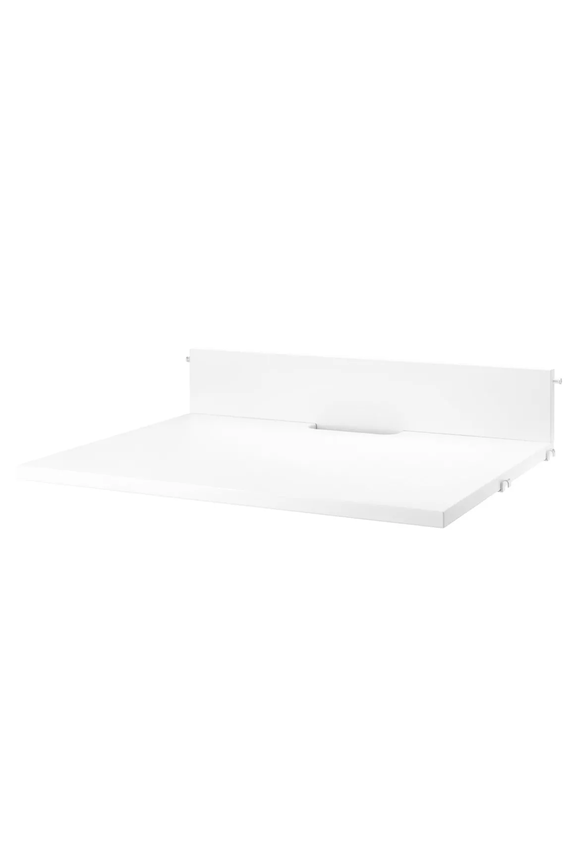 Mediehyllen er et tilbehør til String® System og er laget for å gi vinylspilleren eller macen et gitt sted i hjemmet. Hyllen måler b58 x d47 x h10 cm og passer til String hyllegavler med 30 cm dybde. Hyllen er designet for å passe kabler mellom hyllen og veggen uten å klemme dem. Mediehyllen kan også brukes som arbeidsplass eller kanskje en bardisk. Hver pakke inneholder en mediehylle, en stripe som plasseres mot veggen for å feste mediehyllen og en hylleholder.