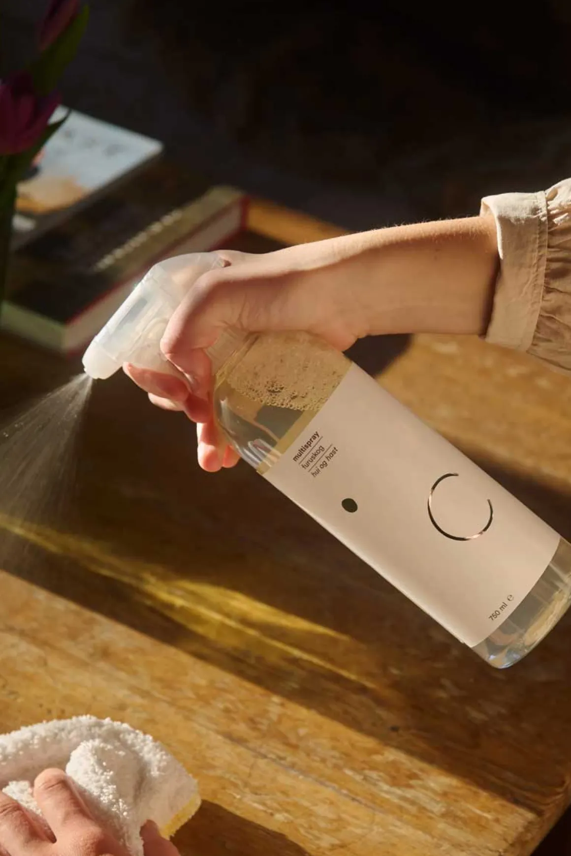 Multispray er en hushjelp på flaske som vasker bord, benker, bad og de fleste overflater i en fei. Det er heldigvis moderne tider, unna vei, her kommer nemlig en effektiv virvelvind. Hard mot de harde, som flekker og smuss, men fleksibel i sprayform og kommer til både hist og pist.