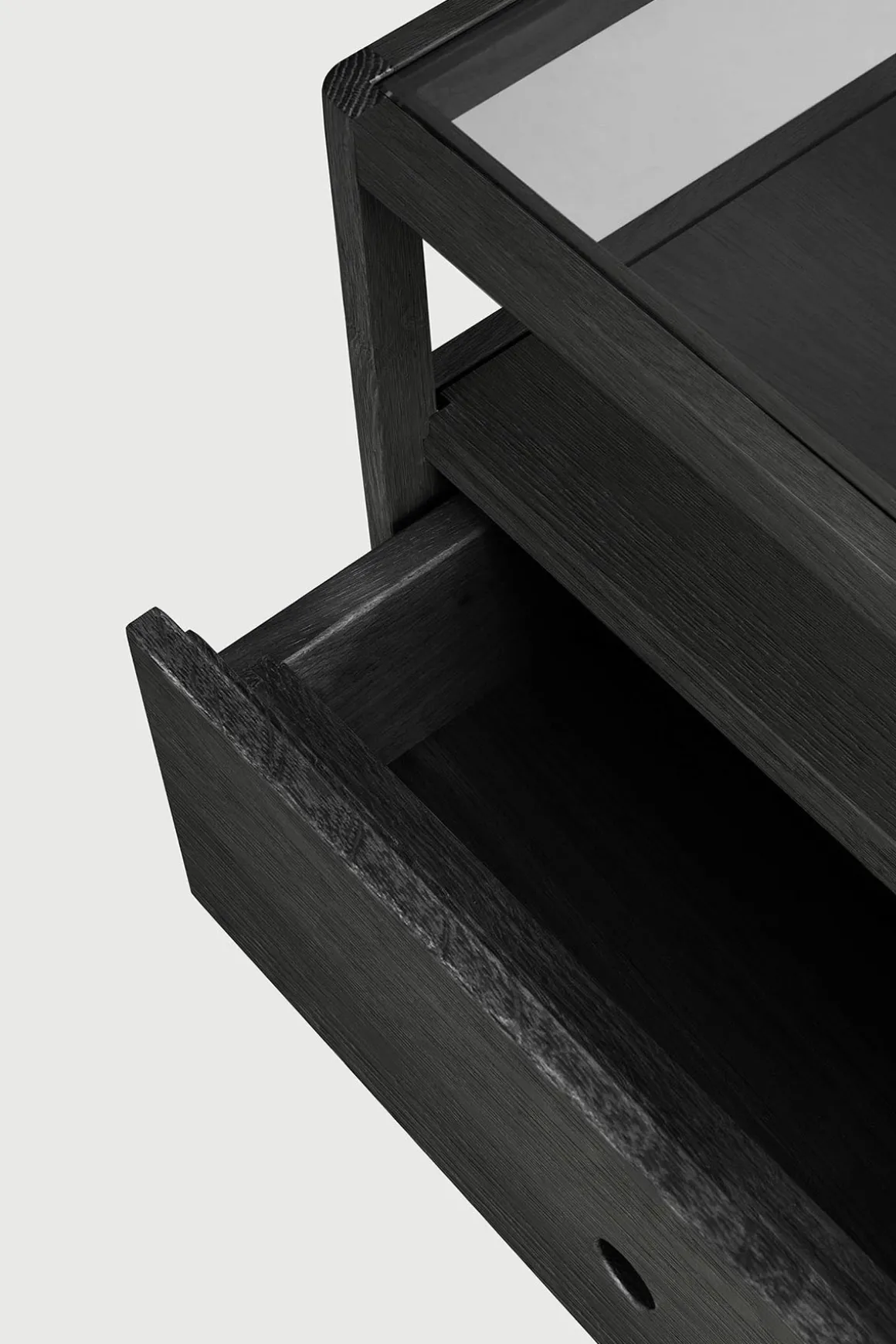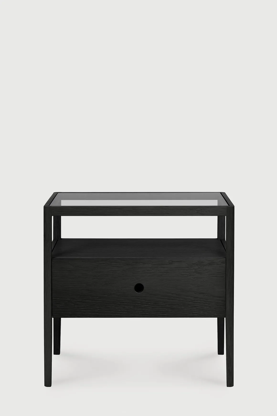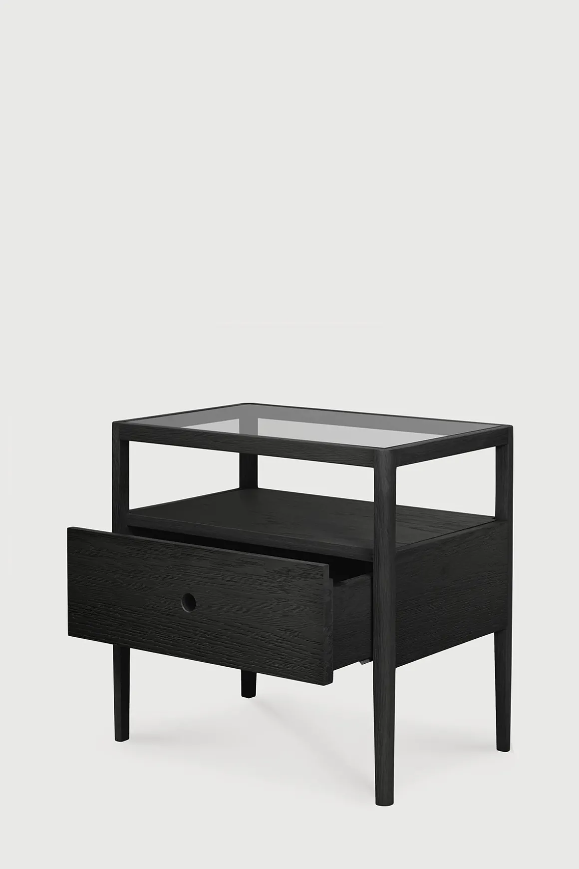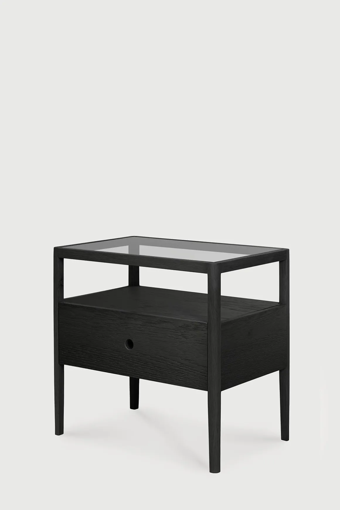 Spindle nattbord fra belgiske Ethnicraft. Spindle-kolleksjonen er inspirert av tradisjonelle spinnehjul og laget i solid, sortlakkert eik. Lette, smale ben og avrundede kanter gir en myk, sensuell kvalitet til denne vakre kolleksjonen. Nattbordet har en åpen hylle og romslig skuff hvor man kan oppbevare småting, og glassplaten på toppen har stor nok flate til at man får plass til en nattbordslampe, favorittboka og mobilen. Klassisk design med en moderne nordisk vri som understreker det minimalistiske uttrykket.