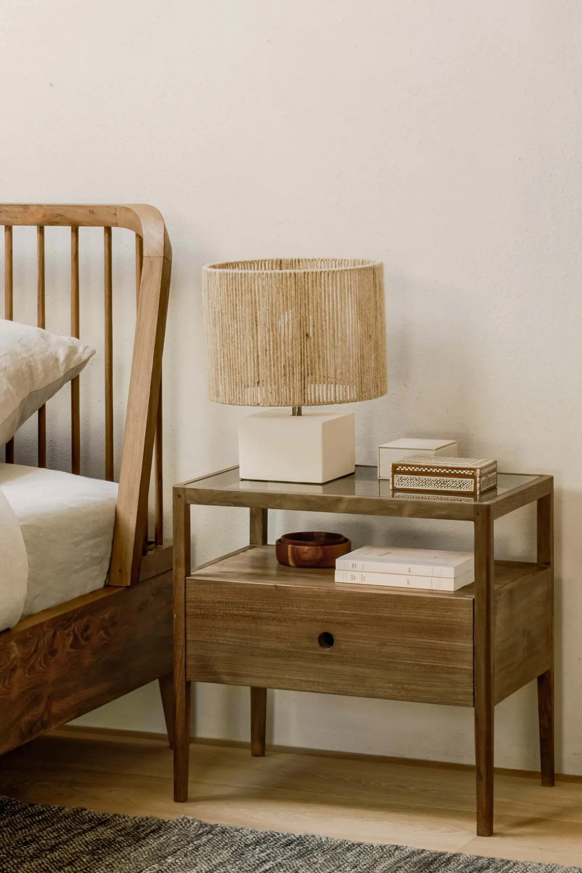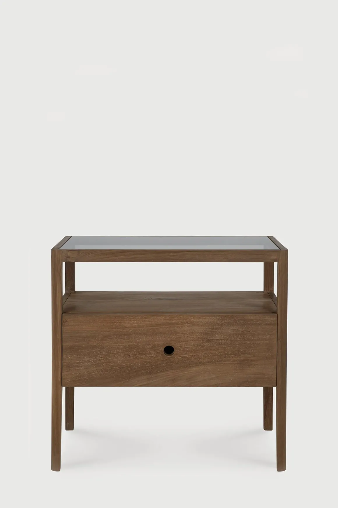 Spindle nattbord fra belgiske Ethnicraft. Spindle-kolleksjonen er inspirert av tradisjonelle spinnehjul og laget i solid, gjenvunnet teak. Lette, smale ben og avrundede kanter gir en myk, sensuell kvalitet til denne vakre kolleksjonen. Nattbordet har en åpen hylle og romslig skuff hvor man kan oppbevare småting, og glassplaten på toppen har stor nok flate til at man får plass til en nattbordslampe, favorittboka og mobilen. Klassisk design med en moderne nordisk vri som understreker det minimalistiske uttrykket.