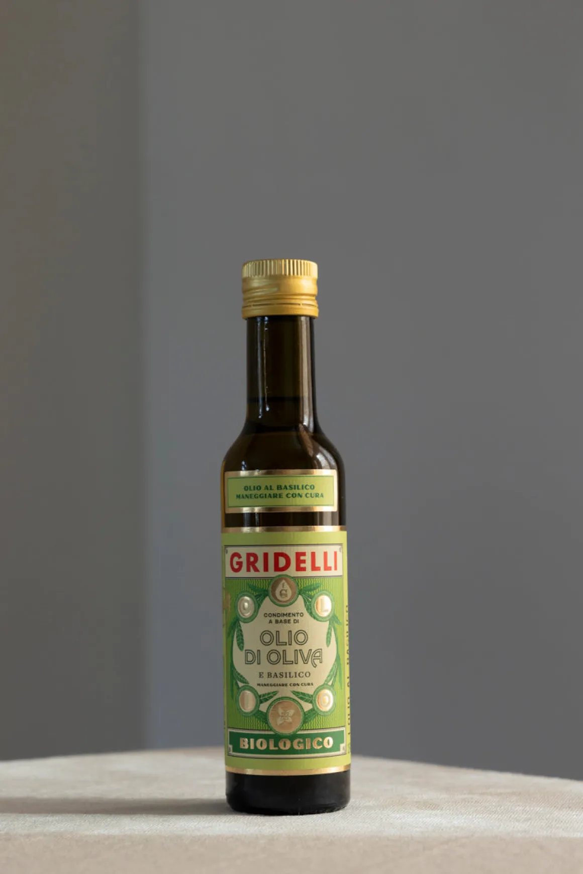 Organisk kaldpresset olivenolje av høy kvalitet smaksatt med basilikum fra favoritten Gridelli. Økologiske ingredienser. 100 ml