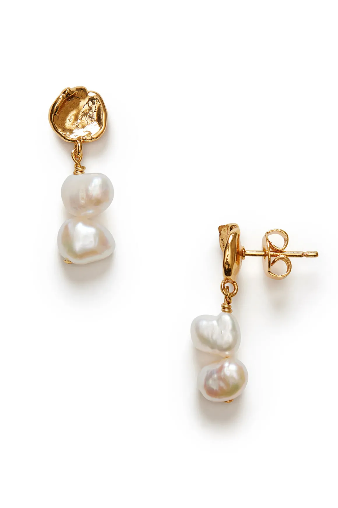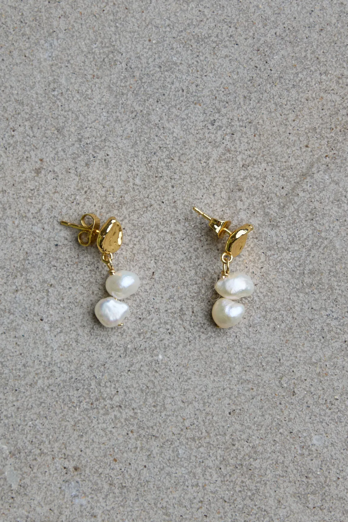 Pearly Drop øredobber fra Anni Lu. Øredobbene er laget av 18 karat gullbelagt messing og dekorert med kultiverte ferskvannsperler, som gir Pearly Drop et naturlig og unikt preg. Som en del av Club Mirage-kolleksjonen, henter de inspirasjon fra 70-tallets bohemske sjarm og frie ånd, samtidig som de har et moderne og tidløst uttrykk. Øredobbene har en vakker kontrast mellom perlestrukturen og den varme gløden fra gulldetaljene, perfekte for å tilføre et tidløst element til antrekket ditt.