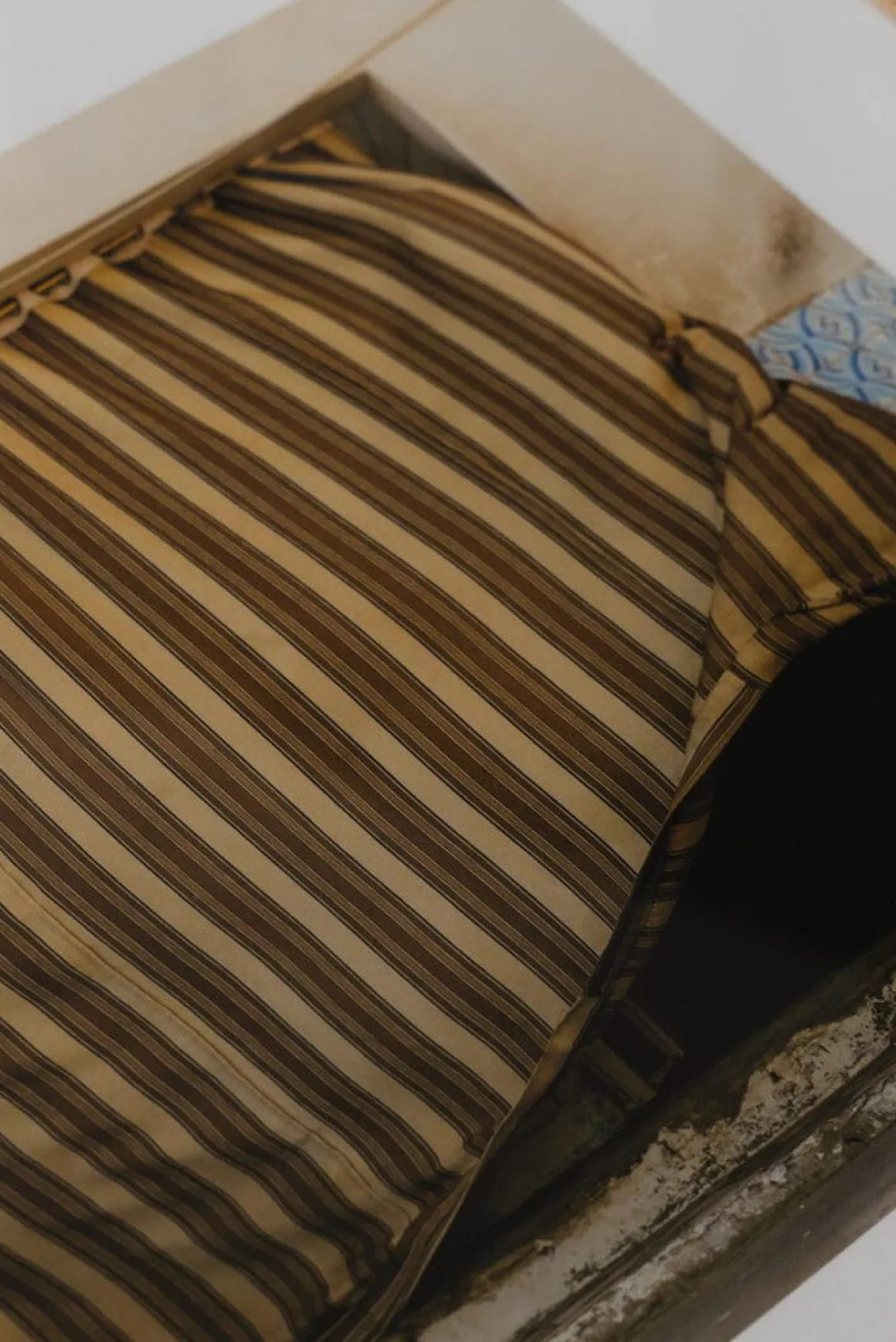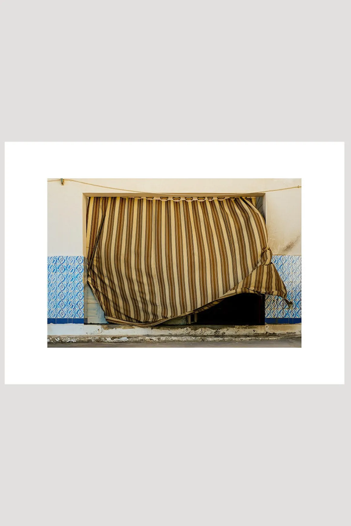 Plakaten av Julian Zerressen, laget eksklusivt for The Poster Club, er et fotografisk kunsttrykk som fanger en stemningsfull scene med en stripete gardin som delvis dekker en åpning, der lys og skygge spiller sammen på en harmonisk måte. De varme tonene og de teksturerte detaljene gir bildet en sanselig dybde, mens de subtile kontrastene mellom stoff, fliser og omgivelser skaper en balanse mellom det strukturerte og det organiske. Dette er et motiv som inviterer til undring og refleksjon, perfekt for en stilren og inspirerende innredning.