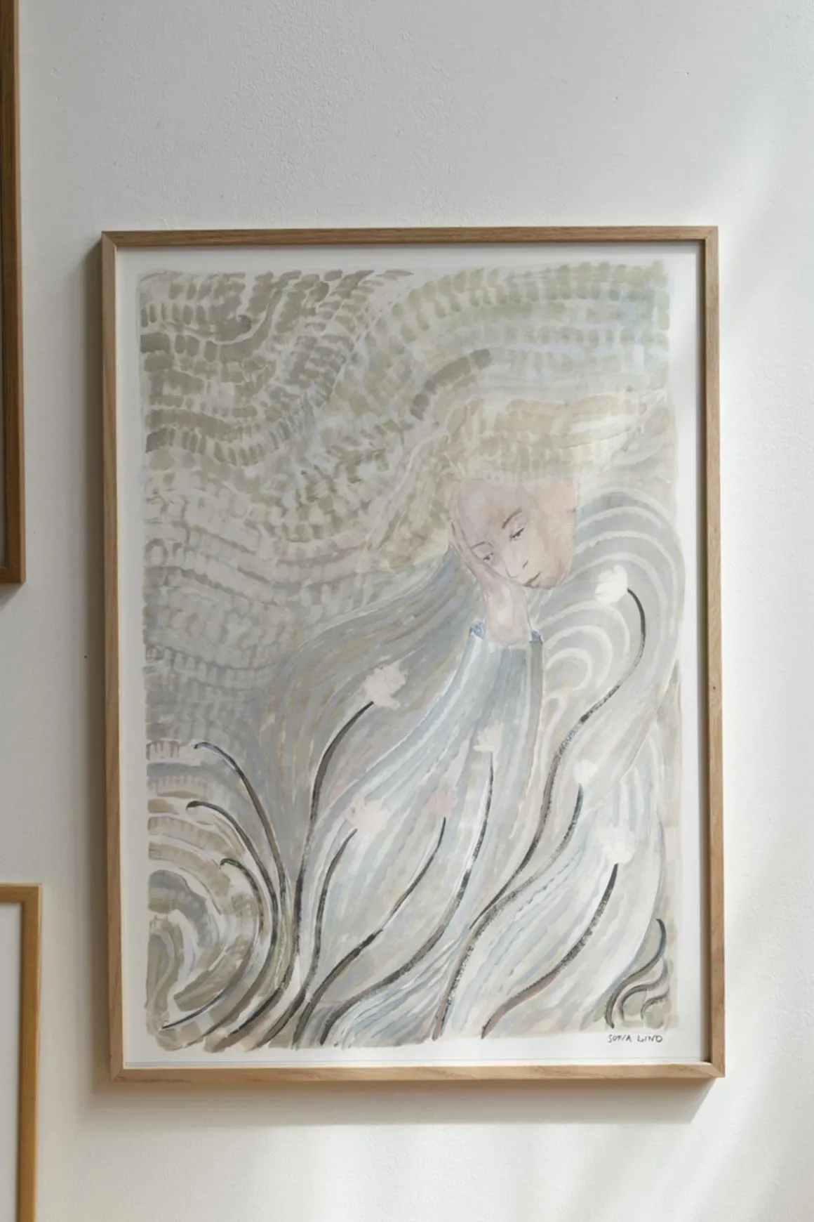 Grow plakat med trykk fra den svenske kunstneren Sofia Lind for Fine Little Day. Hun er kjent for sin bruk av forskjellige mønstre og lar børstestrøk og de originale materialene være synlig i trykket. Med dempede farger og livlige mønstre fanger den oppmerksomheten til seerne.
