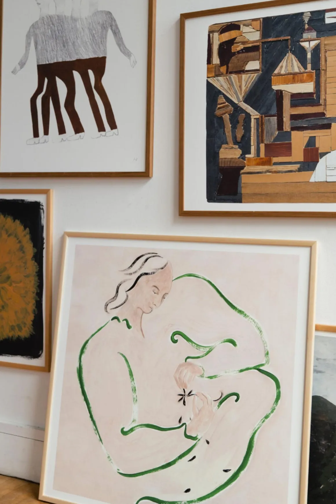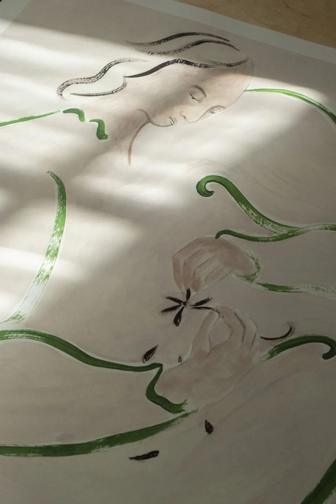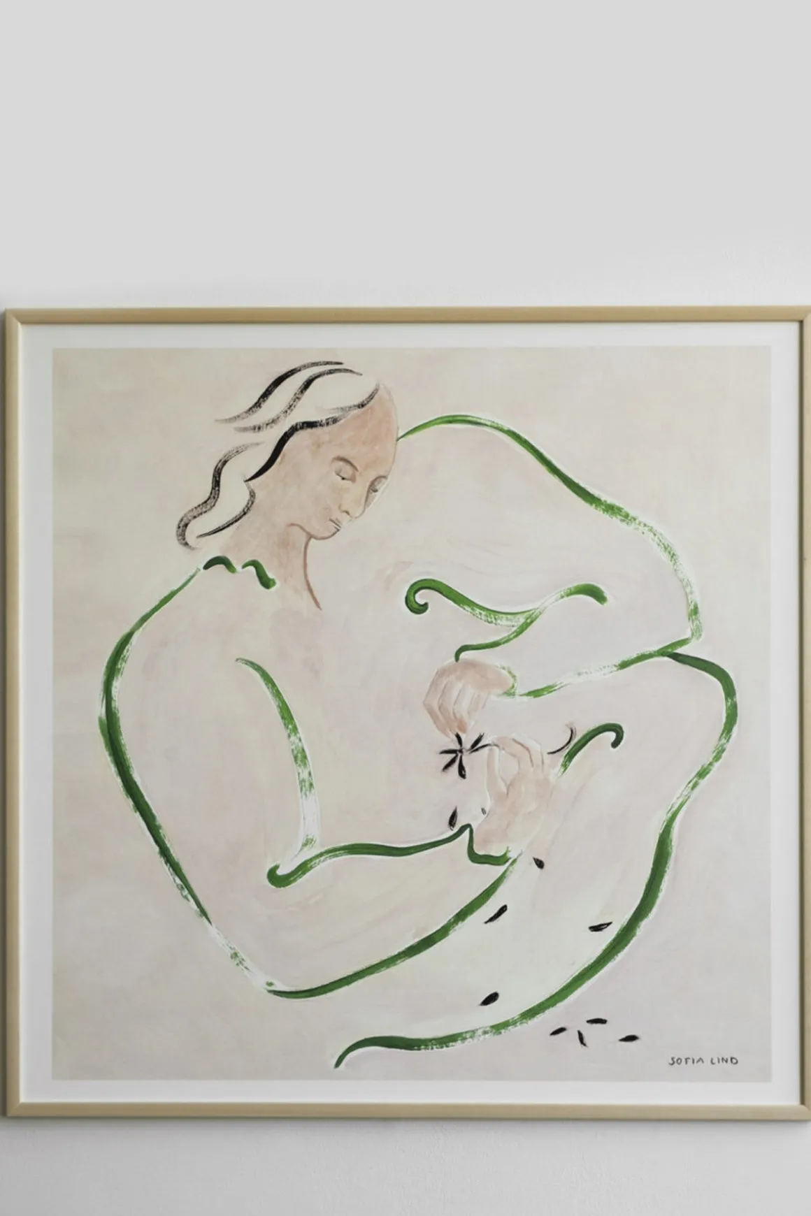 Love Me Not plakat med trykk fra den svenske kunstneren Sofia Lind for Fine Little Day. Hun er kjent for sin bruk av forskjellige mønstre og lar børstestrøk og de originale materialene være synlig i trykket.