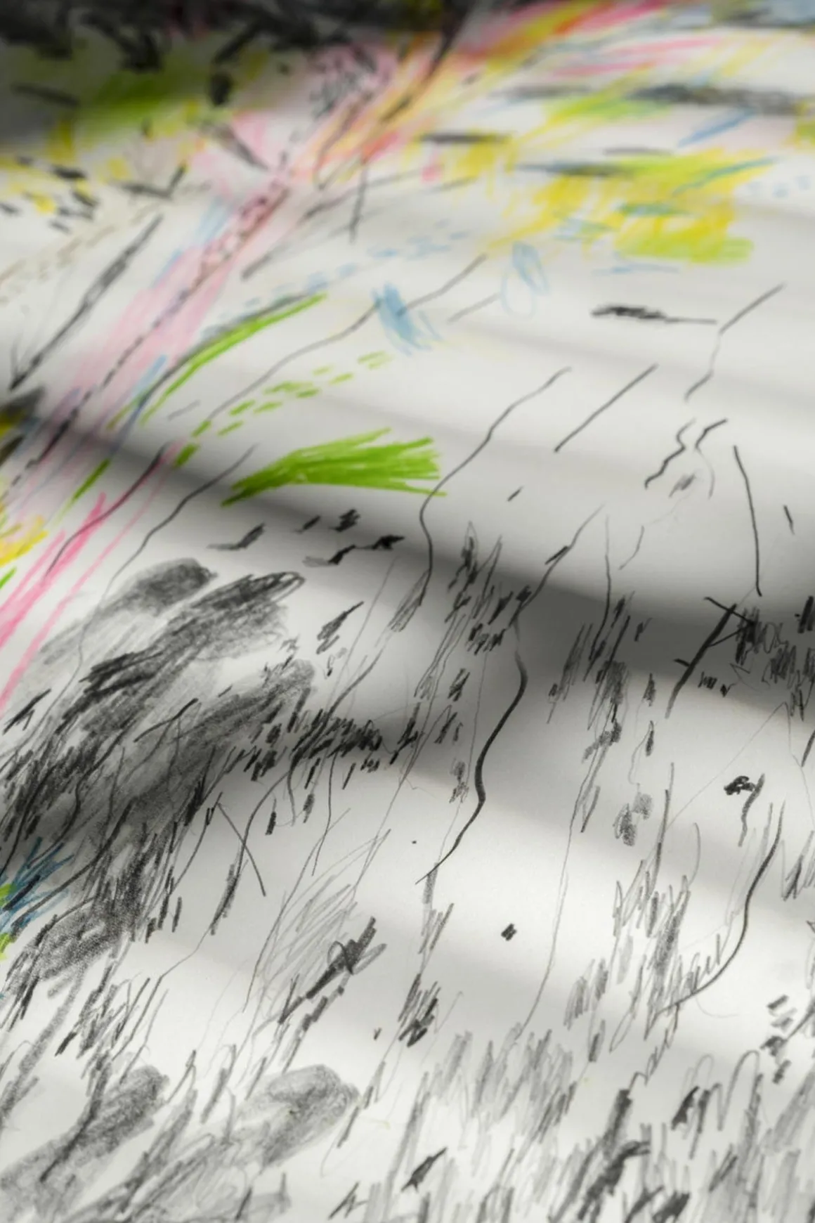 Plakat av Linda Holmer for Fine Little Day. Linda jobber på en unik måte ved å tegne lyder med lukkede øyne, sier hun. Under pandemien begynte hun med å lage sensoriske tegninger. Lyden av en nabo som lager lunsj, vann gjennom rør, en følelse av sol i pannen og lengselen etter tilhørighet. Ved å starte på et sted med det som skiller og holder oss fra hverandre, dukket det opp en kunnskap om at det som er mellom oss også er det som forbinder. Ved å tilbringe tid i dette grenselandet dukket det opp landskap som andre kunne komme inn i og ta del i.