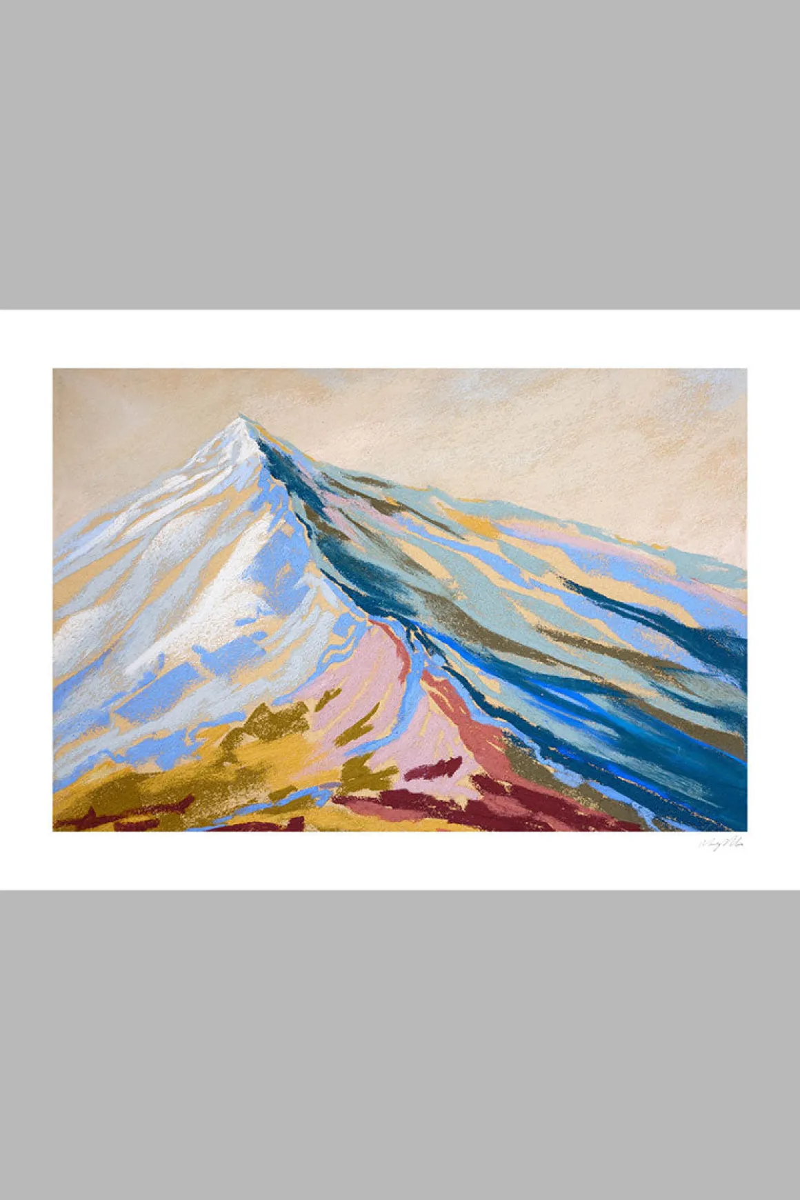 Plakaten av Mandy Maria, laget eksklusivt for The Poster Club, fanger den majestetiske skjønnheten i et fjellandskap med en ekspressiv bruk av farger og teksturer. De myke penselstrøkene og de levende nyansene av blått, oker og terrakotta gir motivet en dynamisk og drømmende kvalitet, samtidig som det gjenspeiler naturens rå uttrykk. Kontrasten mellom de kjølige og varme tonene skaper en følelse av bevegelse og dybde, som gir plakaten en kunstnerisk og tidløs appell.