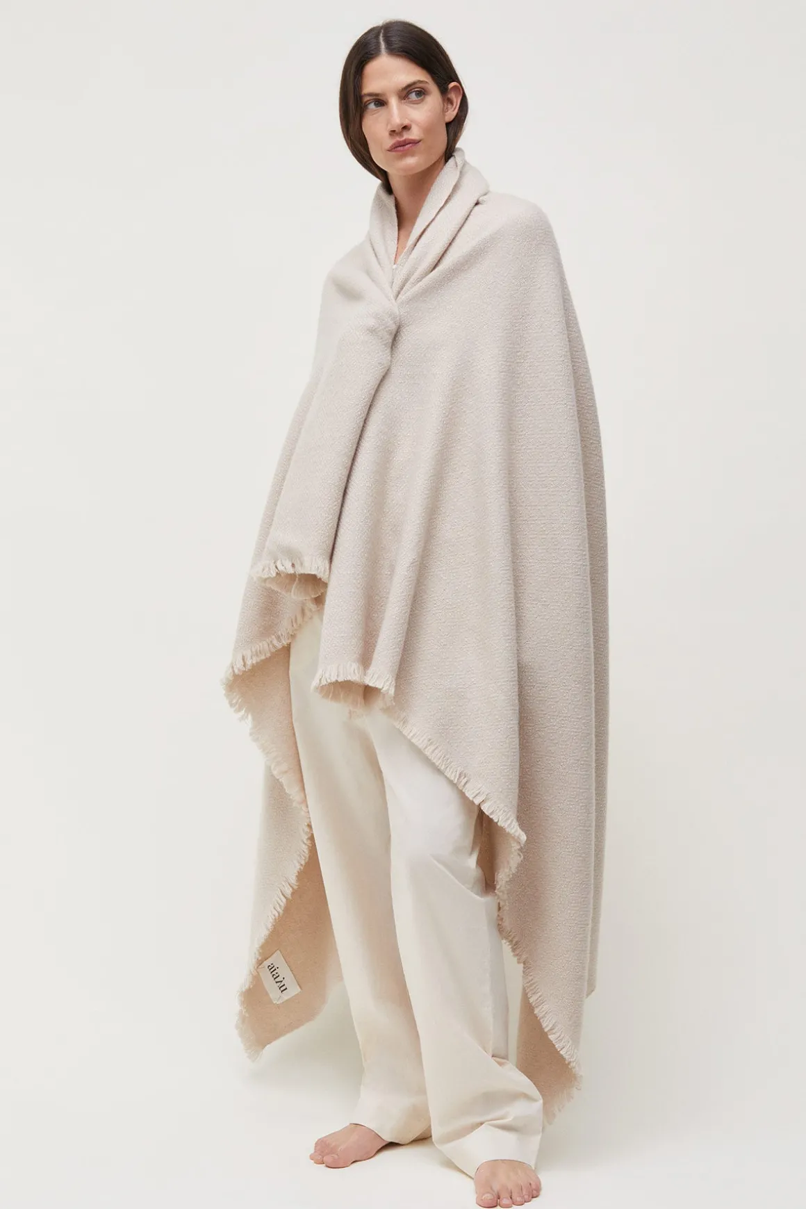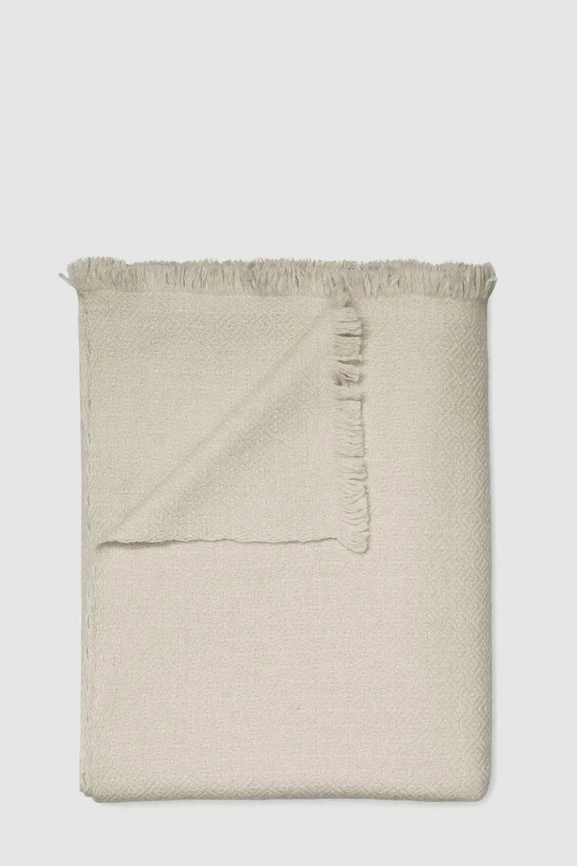 Haya ullpledd i fargen Aura fra danske Aiayu Domus. Pleddet er laget av ren Sartuul-ull fra Nepal – en slitesterk, varm og pustende naturfiber laget for å vare. Klassisk design i en lys, sober farge med tidløst jacquard strikkemønster og frynsedetaljer. Et perfekt pledd å svøpe rundt seg på kalde kvelder, oppi sofaen eller over sengen.