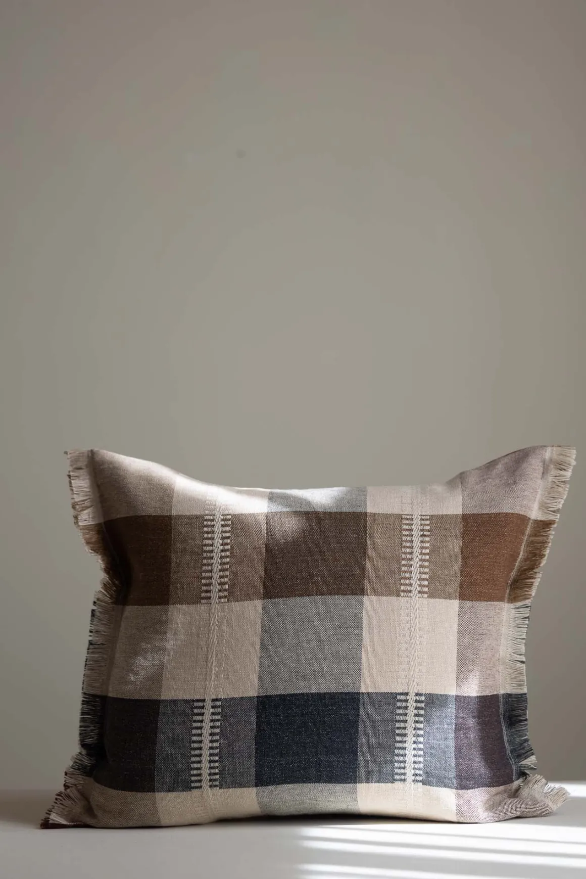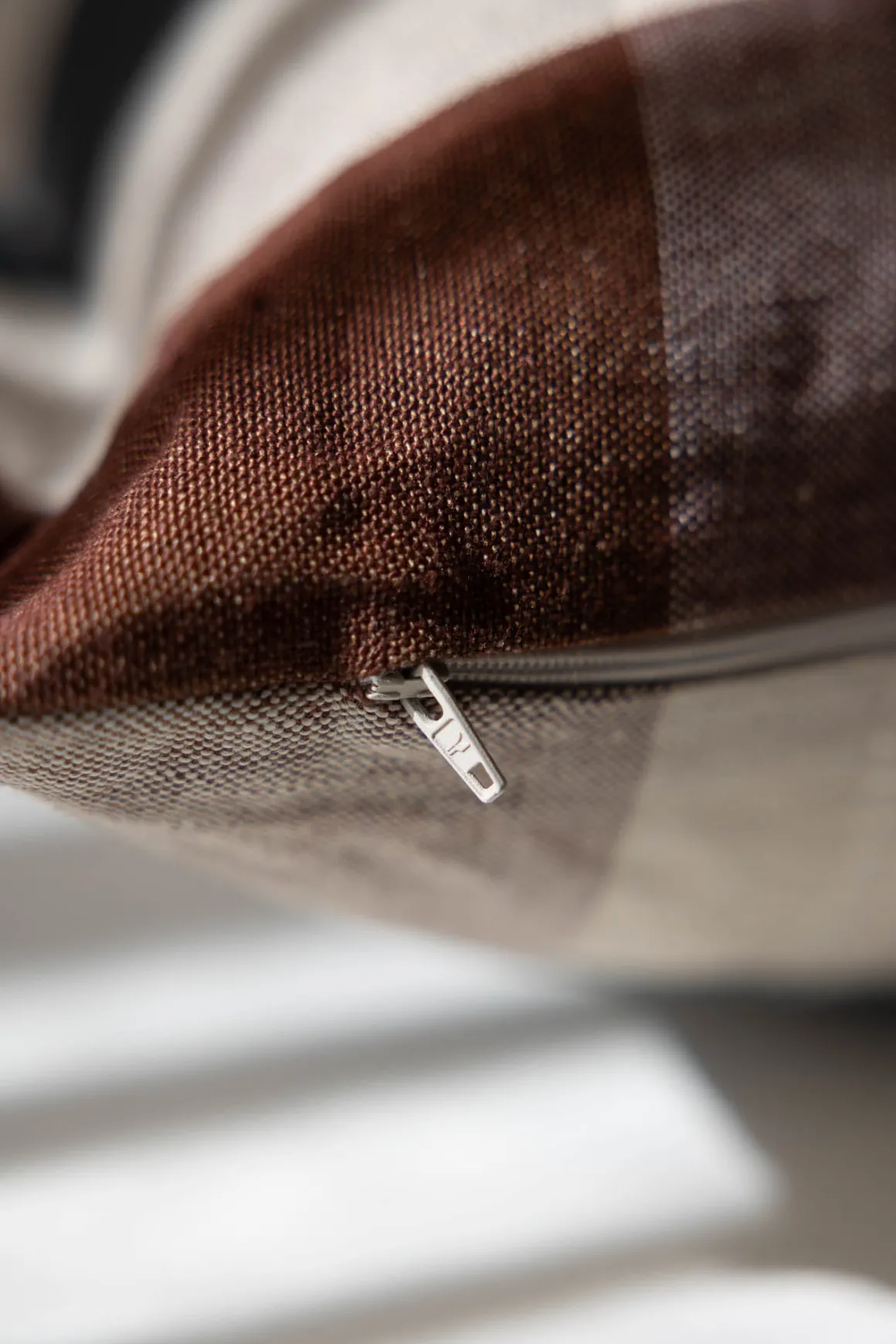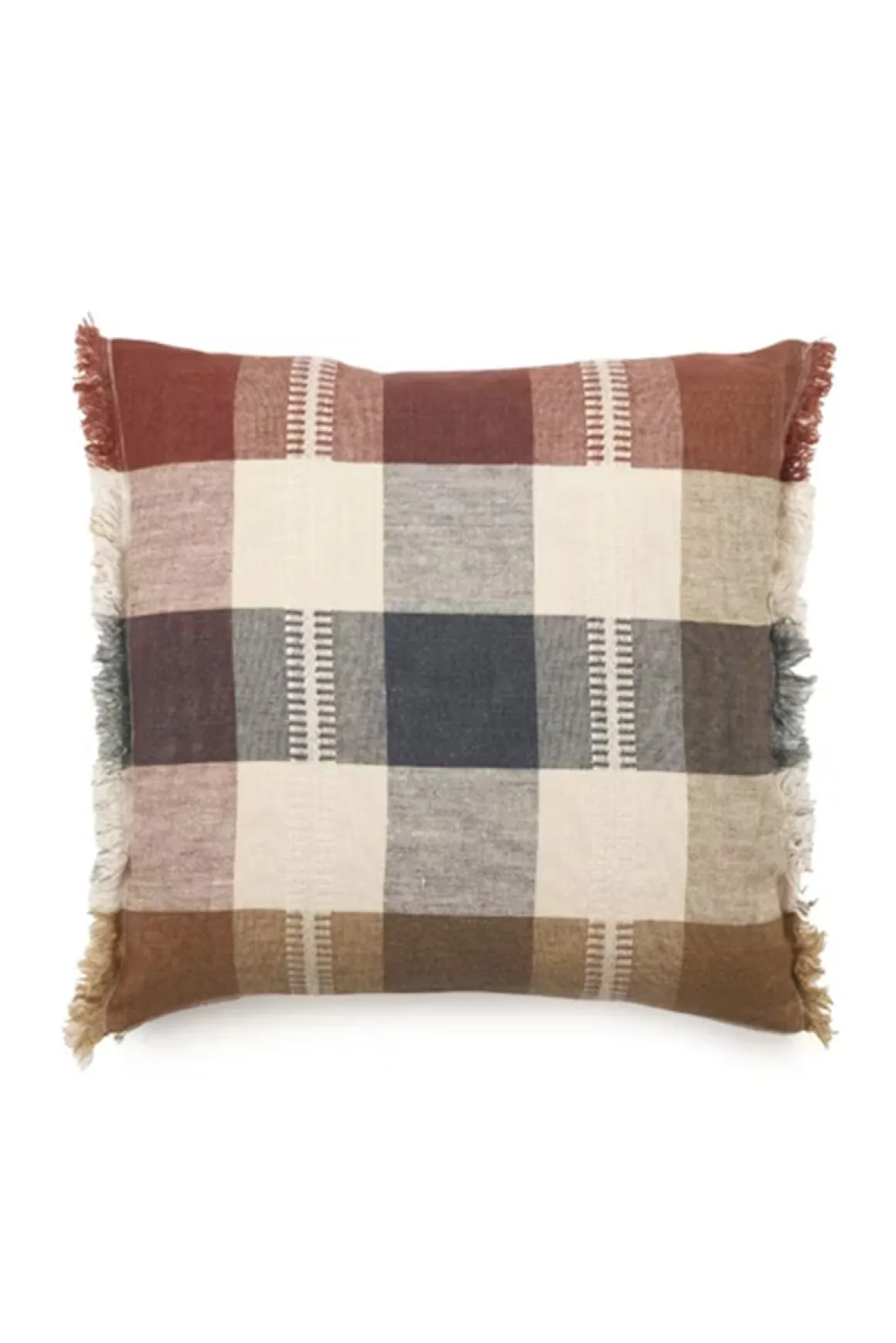 Maxine-putetrekket fra Libeco er et lekent innslag i interiøret med sitt store rutemønster og frynsete kanter. Fargepaletten består av varme toner som eik, rustbrun, blågrå og støvet offwhite, og det spesielle vevemønsteret gjør at hvert putetrekk får sitt eget uttrykk. Like fin i sofaen som på sengen.