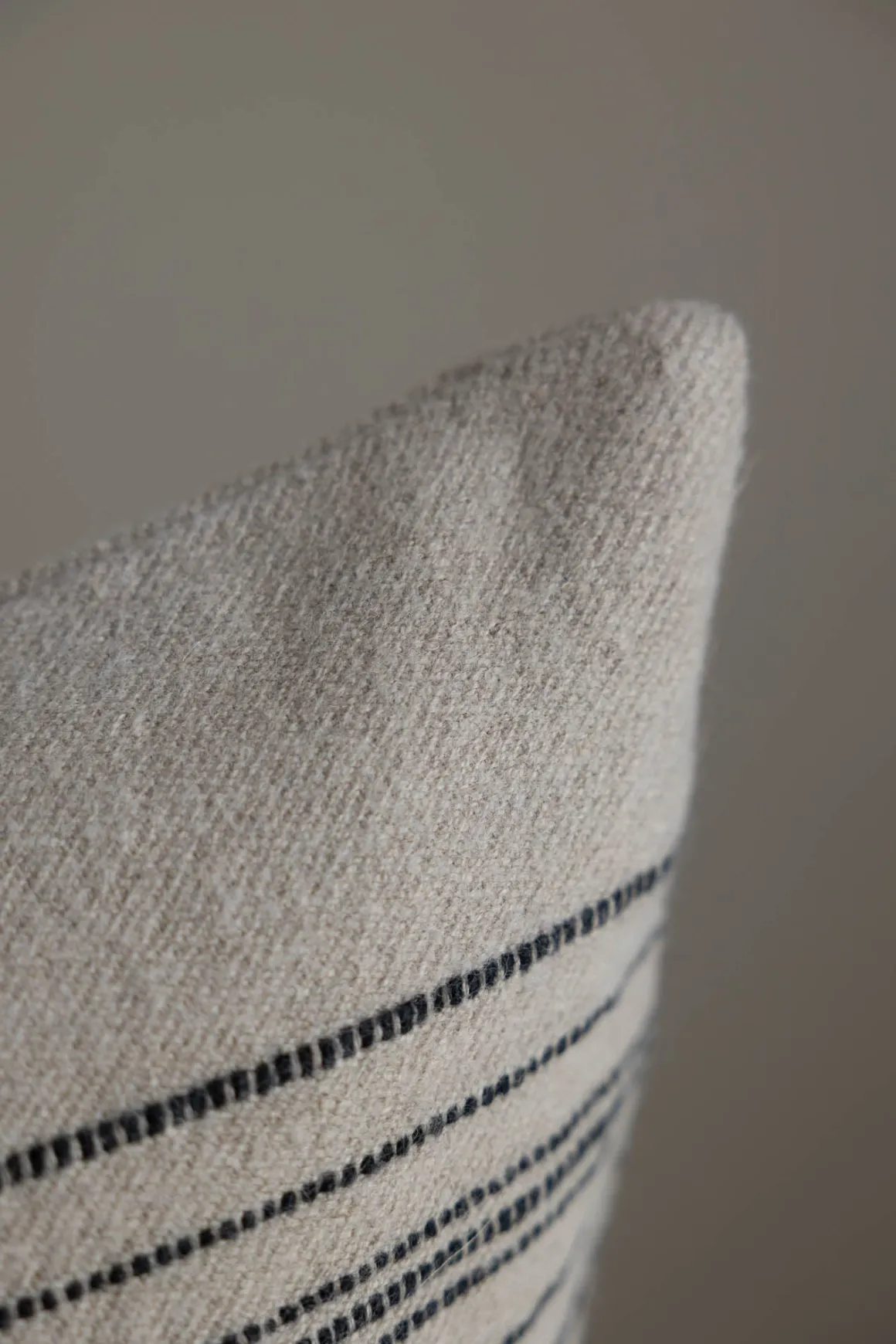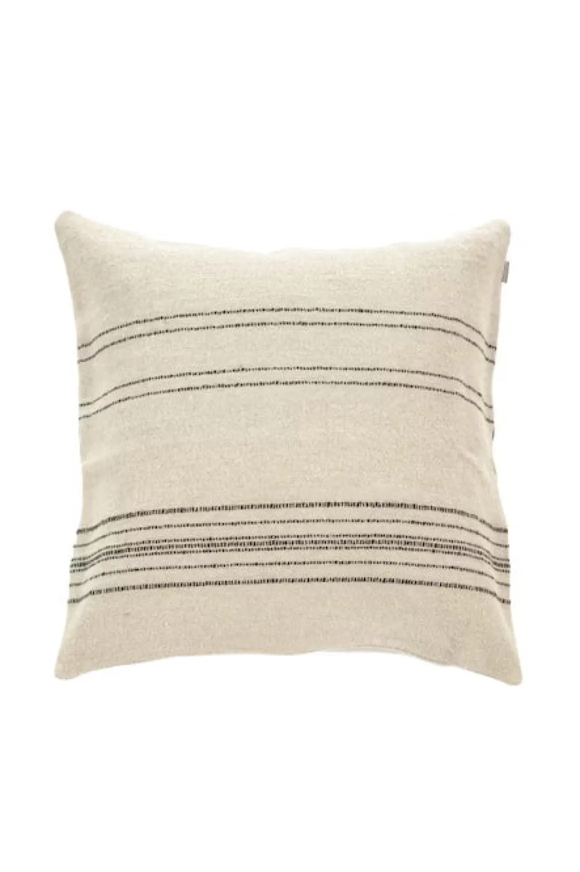 Marocco putetrekket fra Libeco er inspirert av marokkanske markedstepper og vevd i en kraftig kvalitet med mye tekstur. De asymmetriske stripene i svart står i fin kontrast til den lyse bunnfargen, mens baksiden er laget i fiskebensvevd lin. Like fint i sofaen som på sengen.