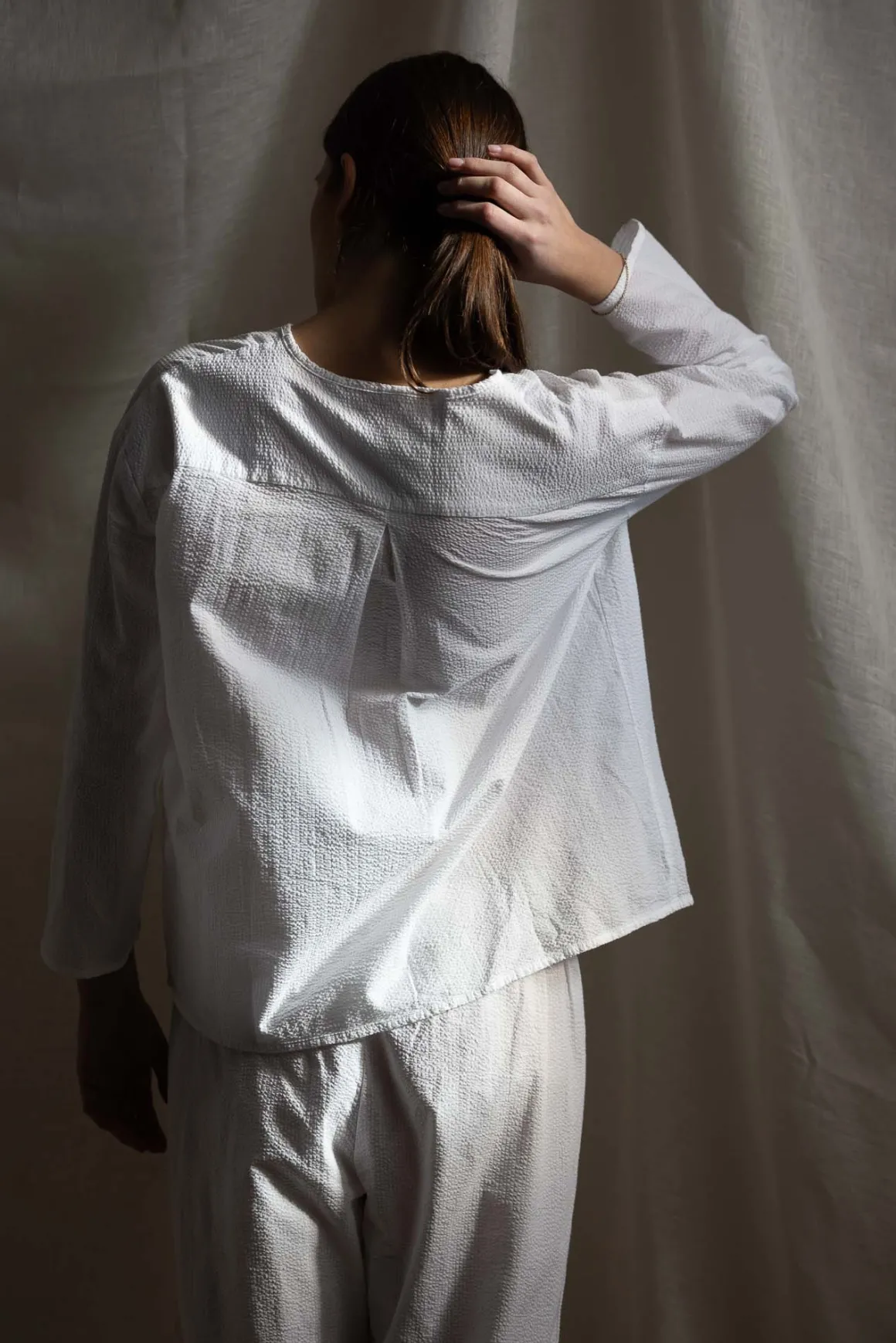 Aiayu Pyjamas – Seersucker White er en tidløs og behagelig pyjamas laget av lett, strukturert økologisk bomull i seersucker-veving. Stoffet gir en luftig følelse og et avslappet uttrykk, perfekt for både nattesøvn og late morgener hjemme. Skjorten har en klassisk krage, knappestolpe og brystlomme, mens buksene har en komfortabel strikk i livet og en løs passform for optimal bevegelsesfrihet.