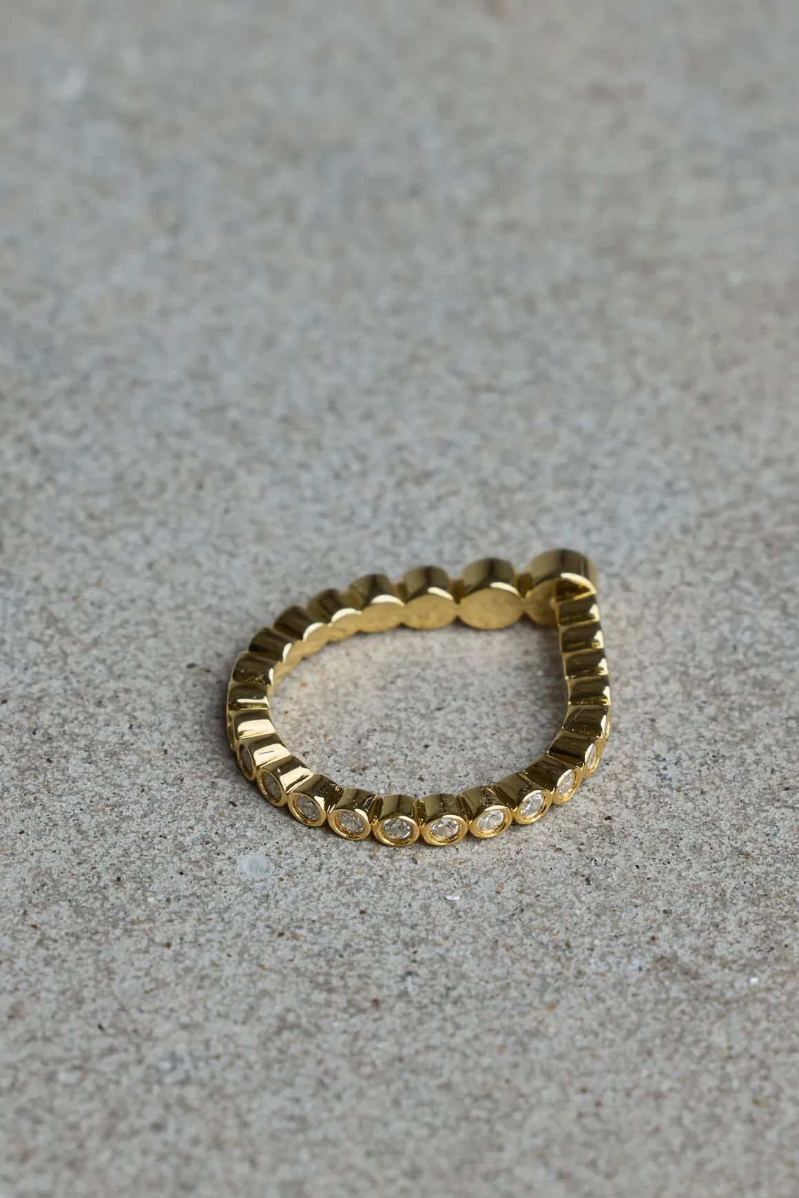 Odette ring fra Ragbag. Inspirert av kunst, arkitektur og naturens former, er denne klassiske ringen designet med en tydelig moderne vri. Odette er utsmykket med glitrende steiner i varierende størrelser som skaper et lekent uttrykk. Laget i gullbelagt sterlingsølv, tilfører den en subtil glød til ethvert antrekk. Ragbag, etablert i København i 2020, kombinerer tradisjonelt håndverk med moderne design for å skape smykker som balanserer tidløshet med en unik, kunstnerisk touch.