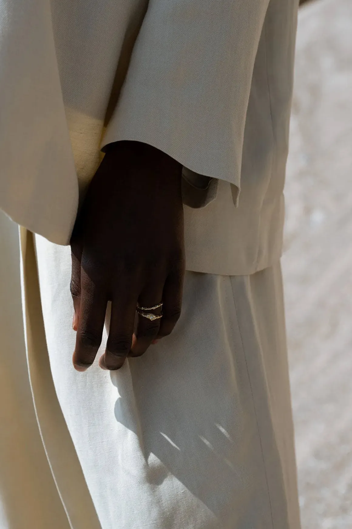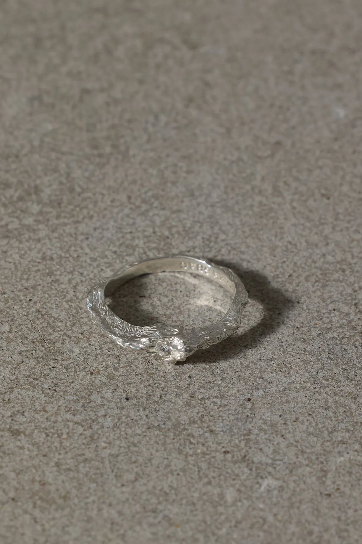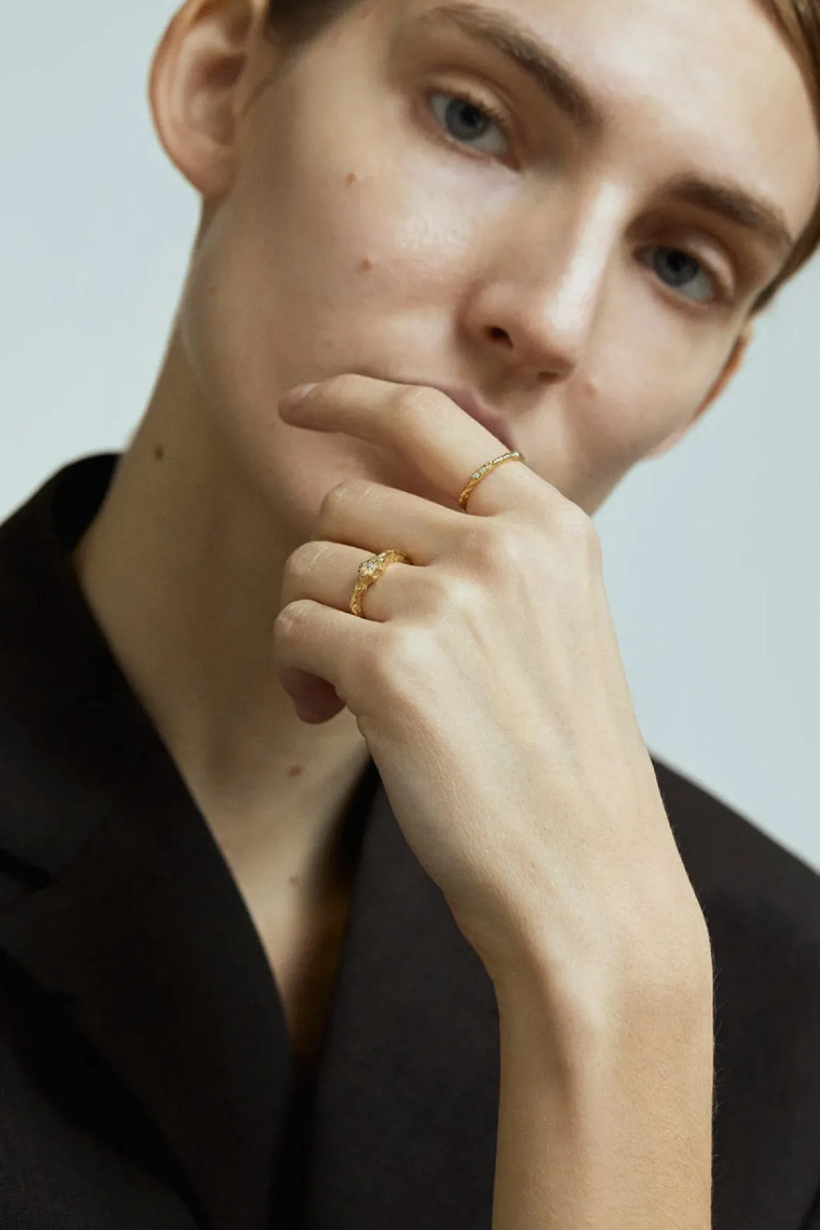 Shoreline ring fra Ragbag. Shoreline-ringen har organiske, uregelmessige konturer som gir et unikt uttrykk, sammen med en flush-satt, krystallhvit cubic zirconia-stein. Den balanserer et feminint preg med et rått og naturlig design, perfekt for deg som ønsker et smykke med karakter og personlighet. RAGBAG Studio kombinerer tradisjonelt håndverk og moderne inspirasjon for å skape smykker som dette, med en tidløs, men særegen følelse.