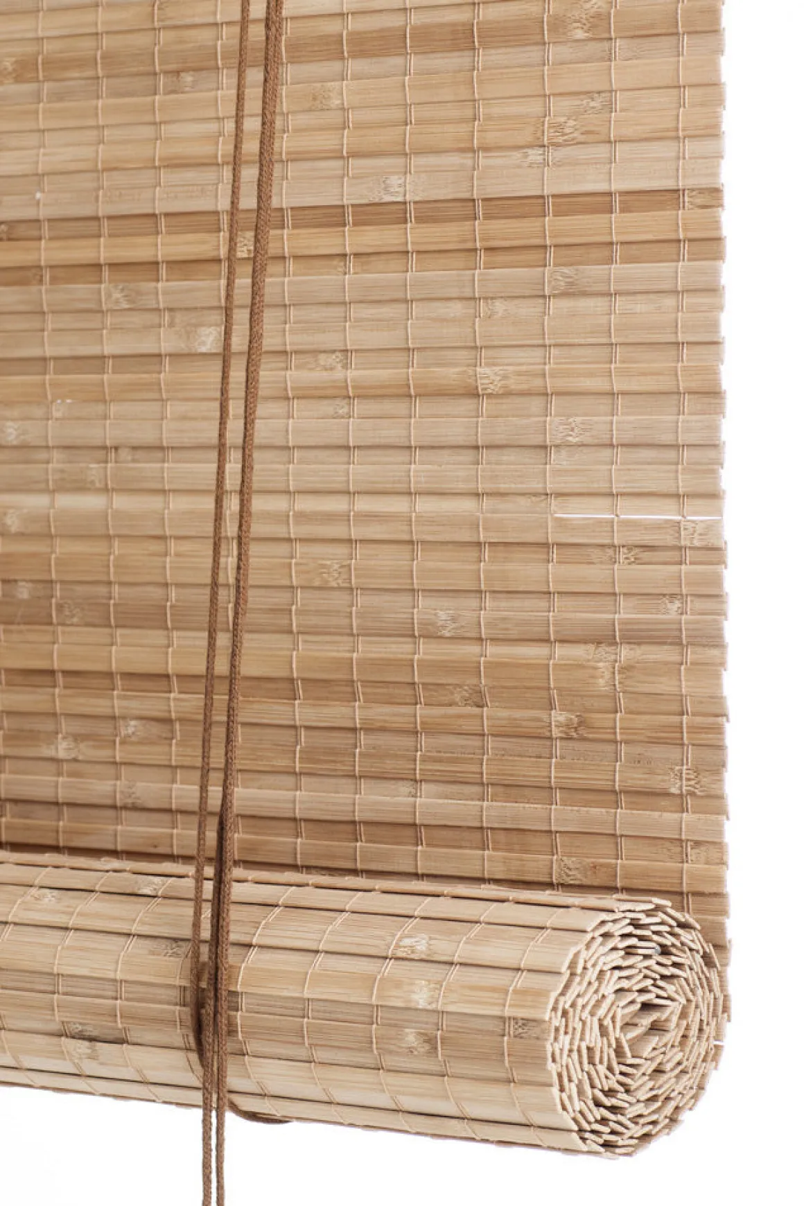 Brun Heldekkende Bambus rullegardin fra danske Color u0026amp; Co. En vakker gardin som består av bambuspinner på ca. 0,9 cm, som er vevd sammen på en overlappende måte som gir gardinen svært god solskjerming. Passer perfekt i rom som trenger god demping av sollys, som f.eks tv-stuen eller soverommet. Siden det er er litt avstand mellom karmen og rullegardinen, vil rullegardinen aldri være 100% lystett. Gardinen er laget av naturlig bambus, som har vært gjennom en varmeprosess som mørkner materialet – det betyr at gardinen er gjennomfarget.