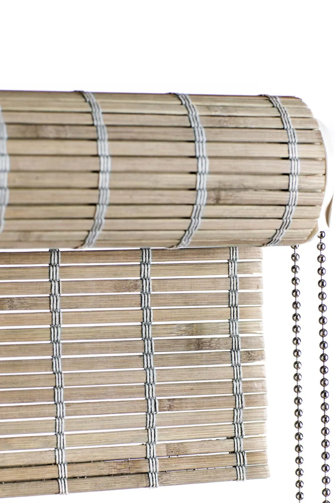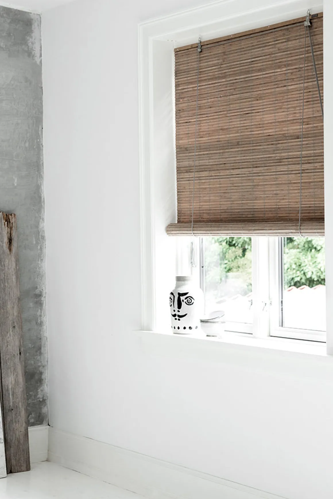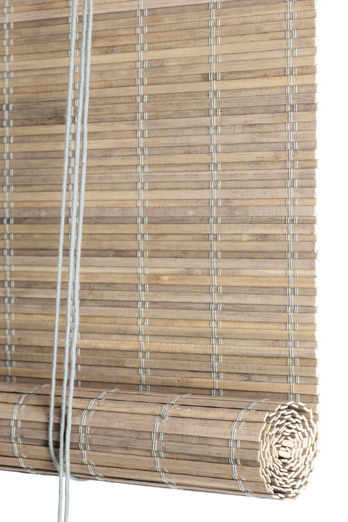 Skap lun stemning i hjemmet med rullegardiner i Gråbeiset Lysdempende Bambus fra danske Color u0026amp; Co. En vakker gardin som består av bambuslameller på ca. 0,7 cm som er vevd sammen på en overlappende måte som gir gardinen svært god solskjerming. Passer perfekt i rom som trenger god demping av sollys eller innsyn, som f.eks tv-stuen eller soverommet. Siden det er er litt avstand mellom karmen og rullegardinen, vil rullegardinen aldri være 100% lystett. Rullegardinen er beiset i samme farge som modellen Gråbeiset bambus (75% solskjerming), så disse gardinene passer perfekt hvis du vil ha samme design i hele huset. Denne modellen kommer med trådtrekk, men kan også spesialbestilles med kjedetrekk. Merk at bambus er et naturmateriale og kan variere noe i farge.