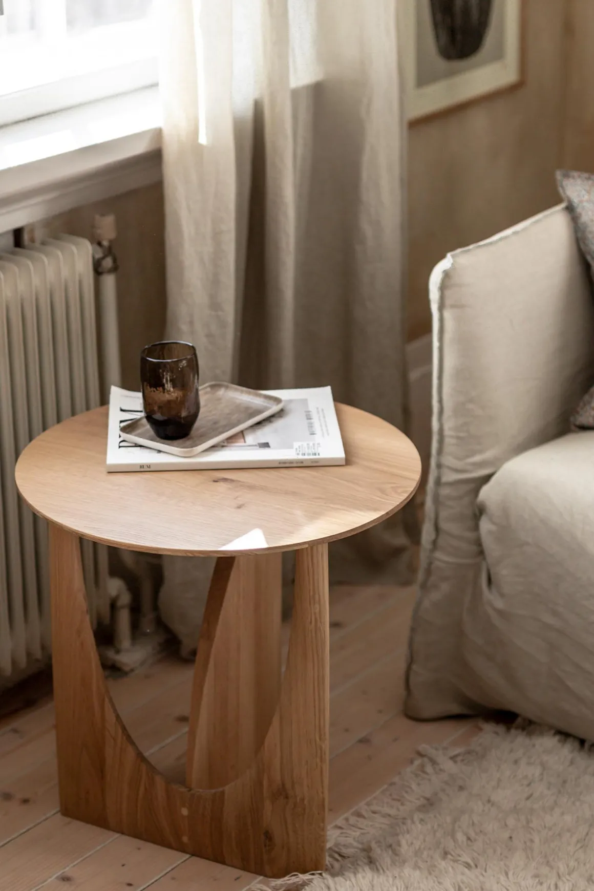 Geometric Side table, designet av Alain Van Havre for belgiske Ethnicraft. Et unikt, skulpturelt sidebord som endrer utseende og uttrykk alt ettersom hvilken vinkel man ser bordet fra. Bruk bordet i stua, som nattbord eller som avlastningsbord i gangen. Utført i varig og stilren, lakkert eik.
