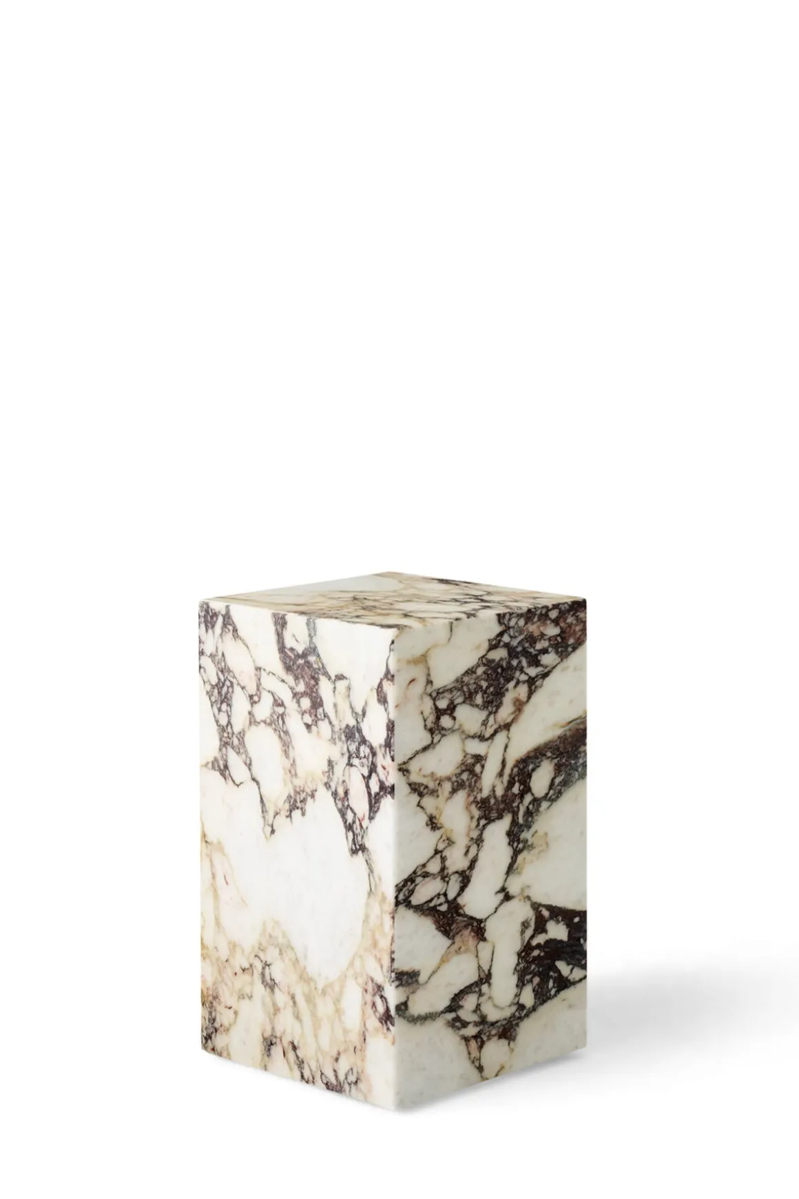 Plinth Tall sidebord i Rose Marble, også kalt Calacatta Viola marmor som er en nydelig marmortype med naturlige innslag av røde toner. Allsidig og tidløst bord håndlaget i en liten fabrikk i Portugal. Bordet har en lav sokkel som gjør at det nesten ser ut som om det svever over gulvet. Plinth har også fire små ben som kan justeres i underkant av en cm i høyden. Bena synes ikke da de er satt fire cm inn fra kanten. Den kubistiske formen er svært raffinert, myk og skulpturell. Til tross for at bordet er monumentalt har det et lett og luftig ytre. Hver marmordel er nøye utvalgt og montert for hånd for å sikre at sidene blir satt sammen perfekt. Resultatet er at dette vakre bordet er konsistent i form og kvalitet, samtidig unikt i marmormønsteret. Plinth bord kommer i flere marmorvarianter og i tre ulike størrelser. Designet av Norm Architects.