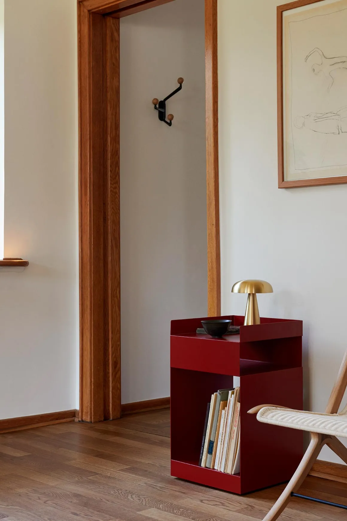 Rotate sidebord fra u0026amp;Tradition, designet av anerkjente Space Copenhagen. Rotates upretensiøse utseende motsier dets svært funksjonelle design. Laget for å oppfylle en rekke formål – bruk den på hjemmekontoret, som nattbord eller til oppbevaring på badet. Rotate kan brukes i alle rom og hjulene gjør bordet enkelt å flytte rundt der det trengs. Sidebordet er laget av stål, av ett stykke metallplate, som kuttes i to og bøyes etterpå. Til slutt sveises de to delene sammen og pulverlakkeres. Rotate kommer i fargene Terracotta, Hunter, Ivory og Merlot.