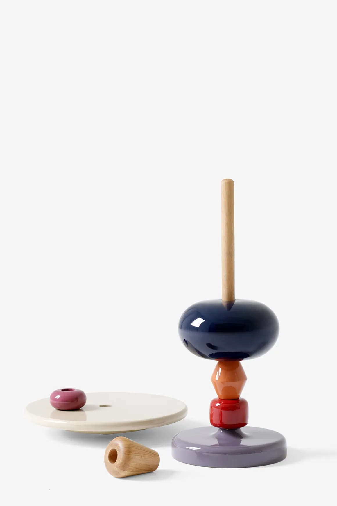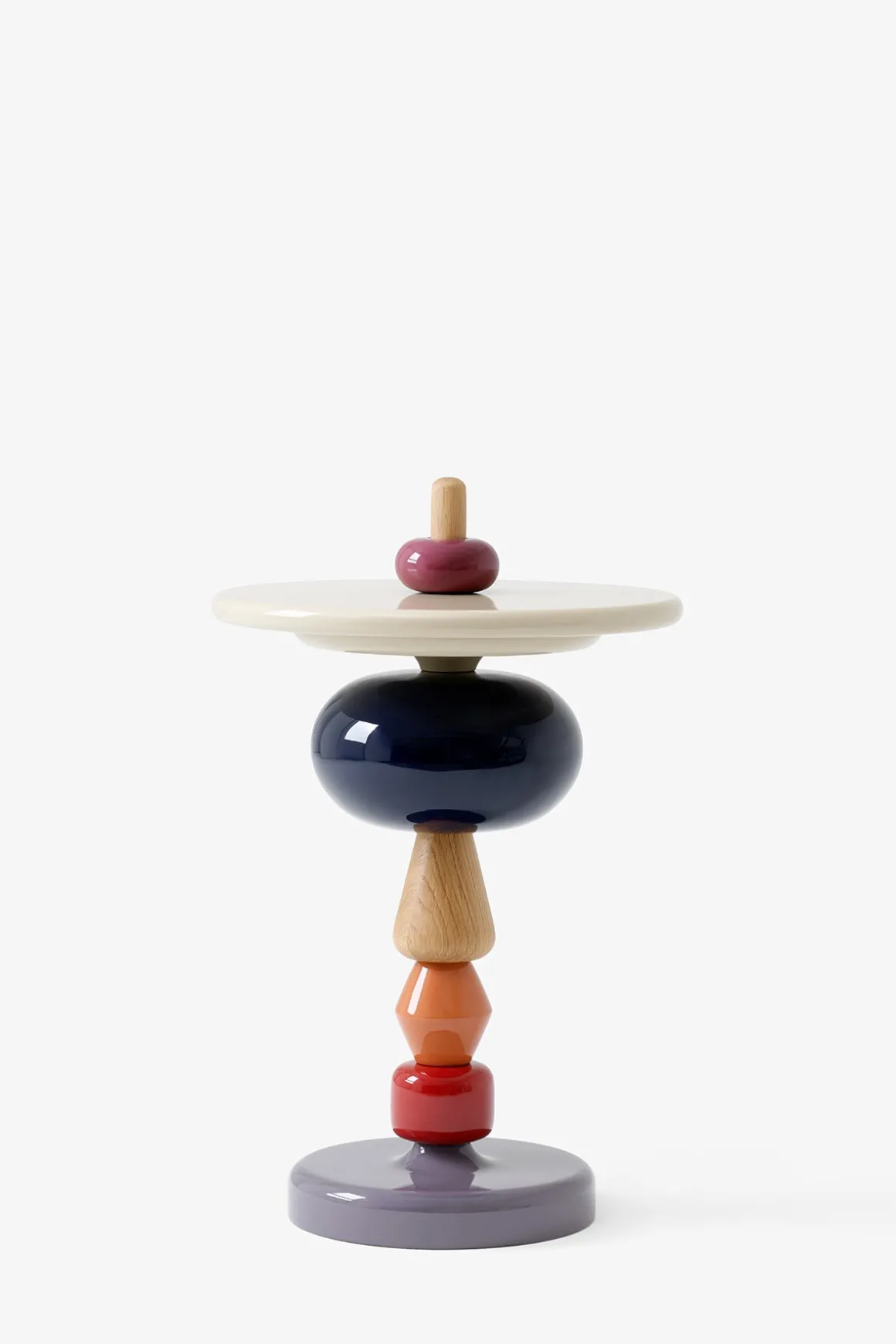 Shuffle sidebord fra u0026amp;Tradition, designet av den norske designeren Mia Hamborg. Shuffle-bordet minner om klassiske treleker i både valg av farger, form og konstruksjon og ideen kom fra Brio-klosser som Mia lekte med som barn. Den lekne konstruksjone gjør at man kan bestemme form, farge og høyde på bordet. Designet revitaliserer det nordiske håndverket med å dreie tre som kan dateres helt tilbake til vikingtiden. Hamborg kombinerer funksjonalitet med humor og vil at folk skal kjenne en følelse av glede når de opplever designet hennes. Bordet er laget av lakkert MDF og heltre. De lakkerte delene er PU-belagt for å sikre en slitesterk og høyglans overflate. Shuffle finnes i to fargekombinasjoner.