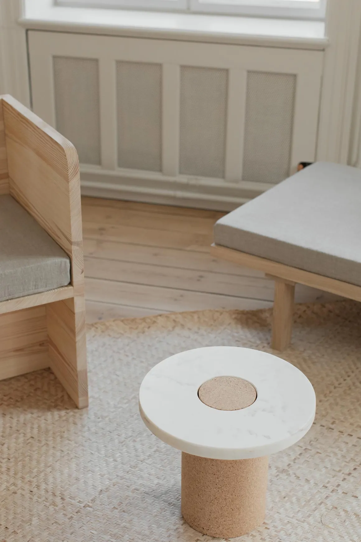 Sintra sidebord fra danske Frama, designet av Nicholai Wiig-Hansen. Sintra har base i kork og bordplate i hvit marmor, og tilfører et unikt særpreg som sidebord eller nattbord. Bærekraftig og luksuriøst – vi elsker kontrasten i materialene! Hardt og mykt, naturlig kork og hvit, eksklusiv marmor i skjønn forening. På grunn av de naturlige materialene, er hvert bord unikt. Sintra finnes i to størrelser og med hvit eller sort marmorbordplate.