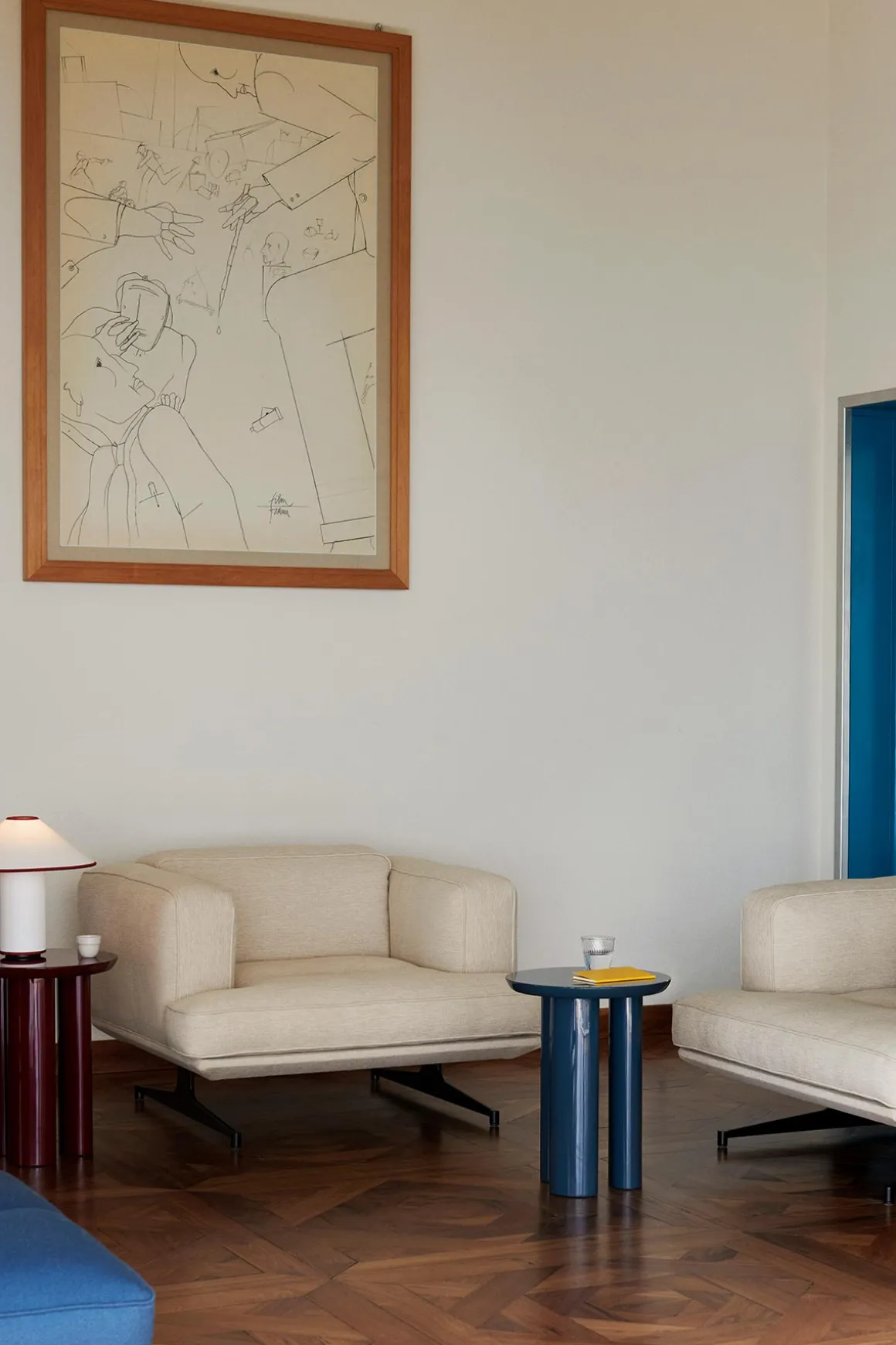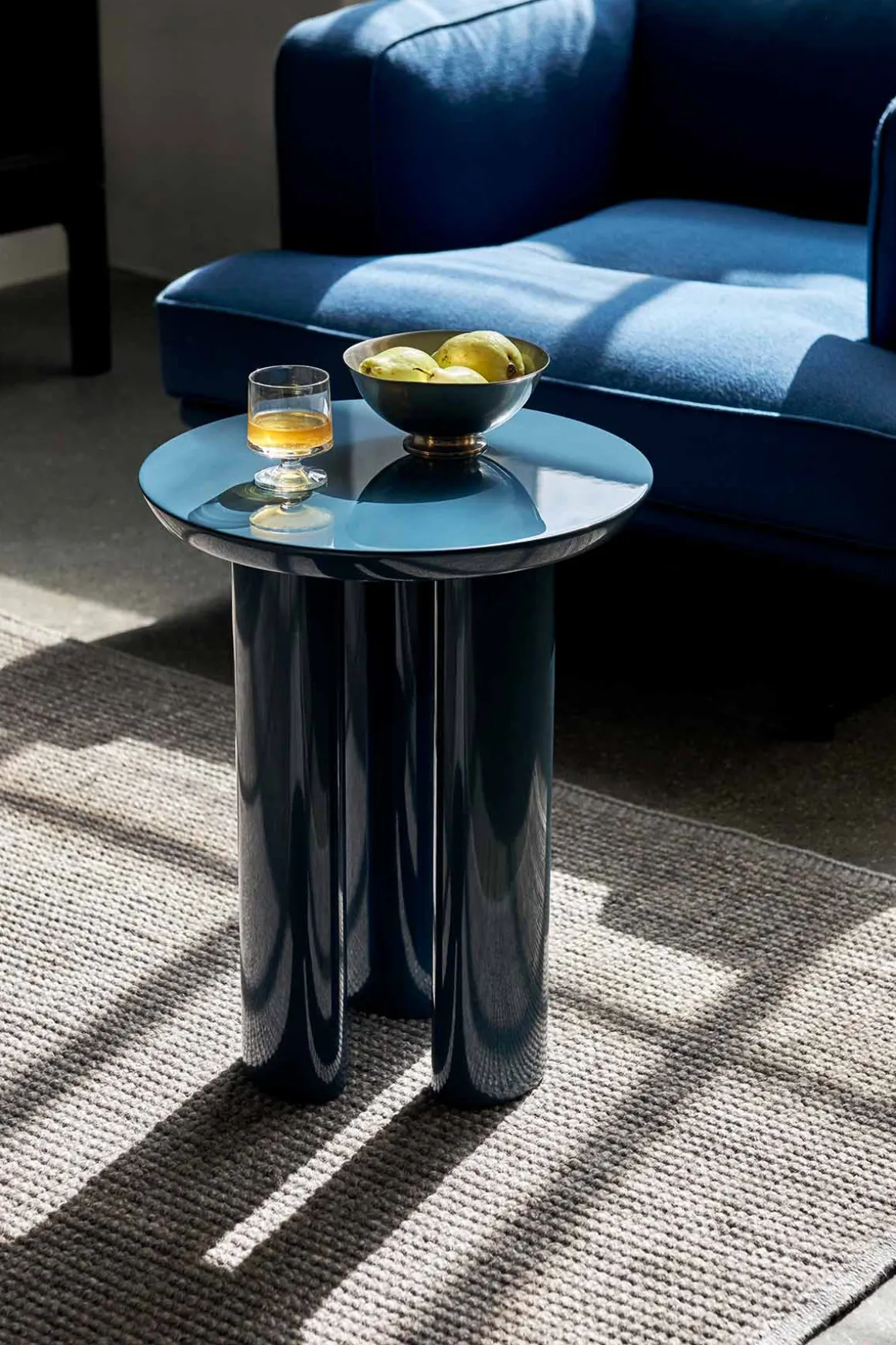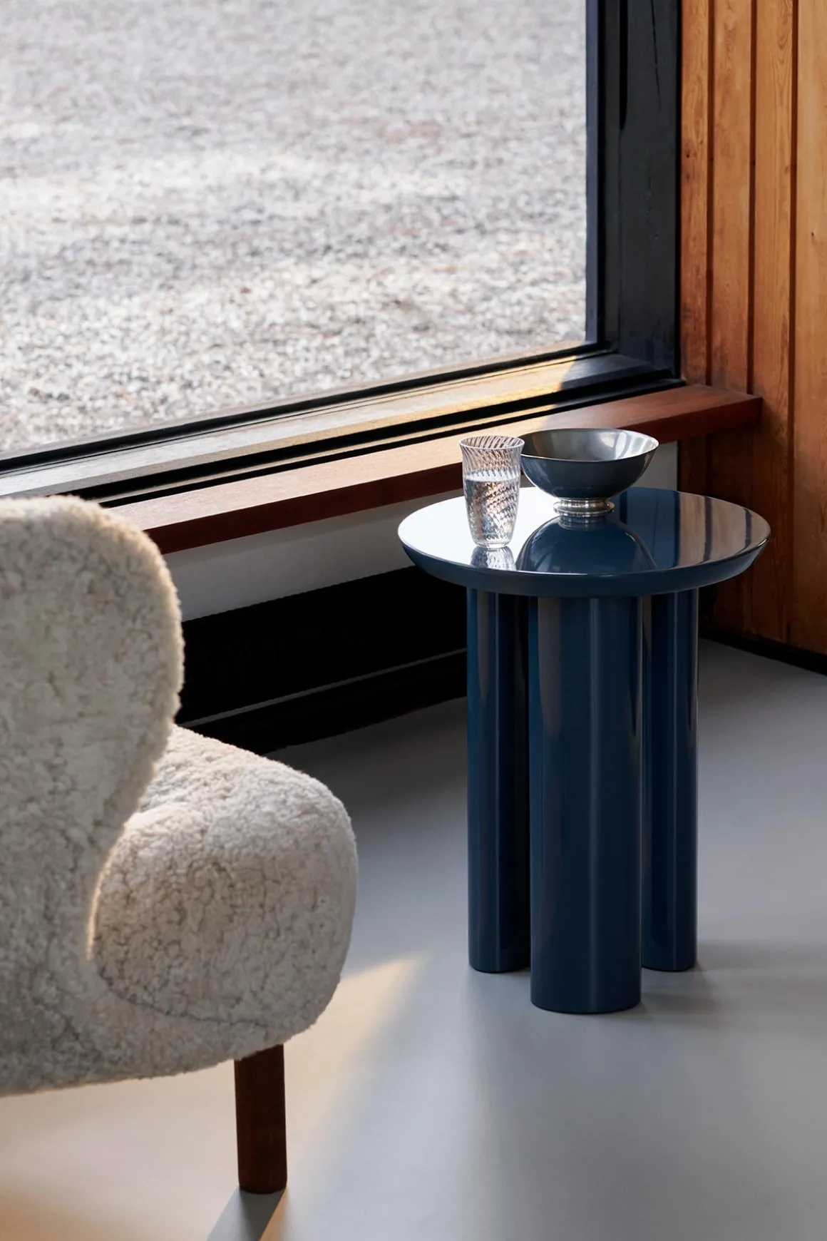 Tung sidebord fra u0026amp;Tradition, designet av den moderne britiske designeren John Astbury. Ønsket var å lage et sidebord med en følelse av monolitisk styrke. Resultatet ble Tung, et kompakt bord støttet av tre buede ben som henspiller på den arkitektoniske tilstedeværelsen av eldgamle søyler. Tung er laget av solid MDF som er frest og etterpå lakkert for en høyglans overflate. Sidebordet finnes også i en burgunderrød farge.