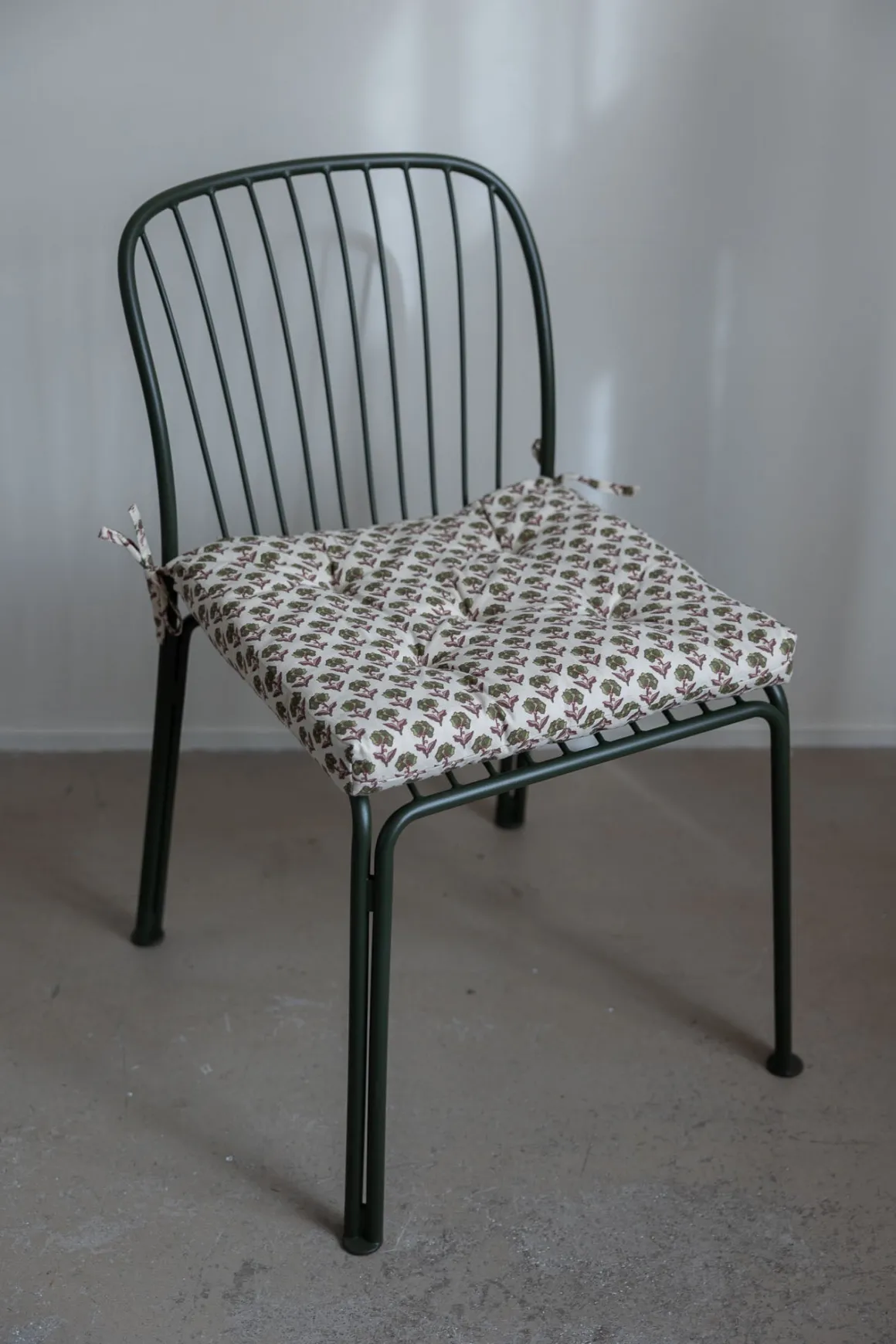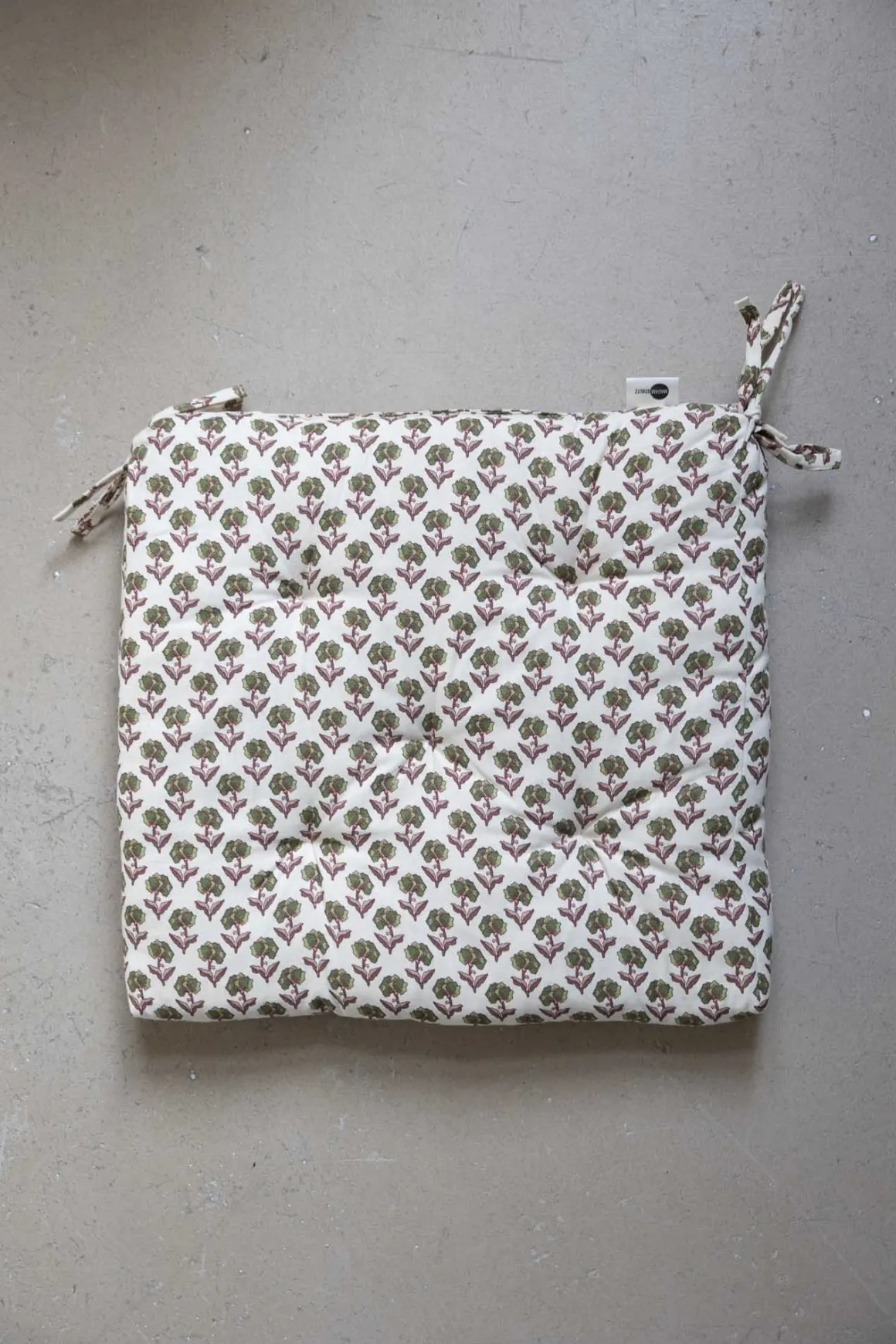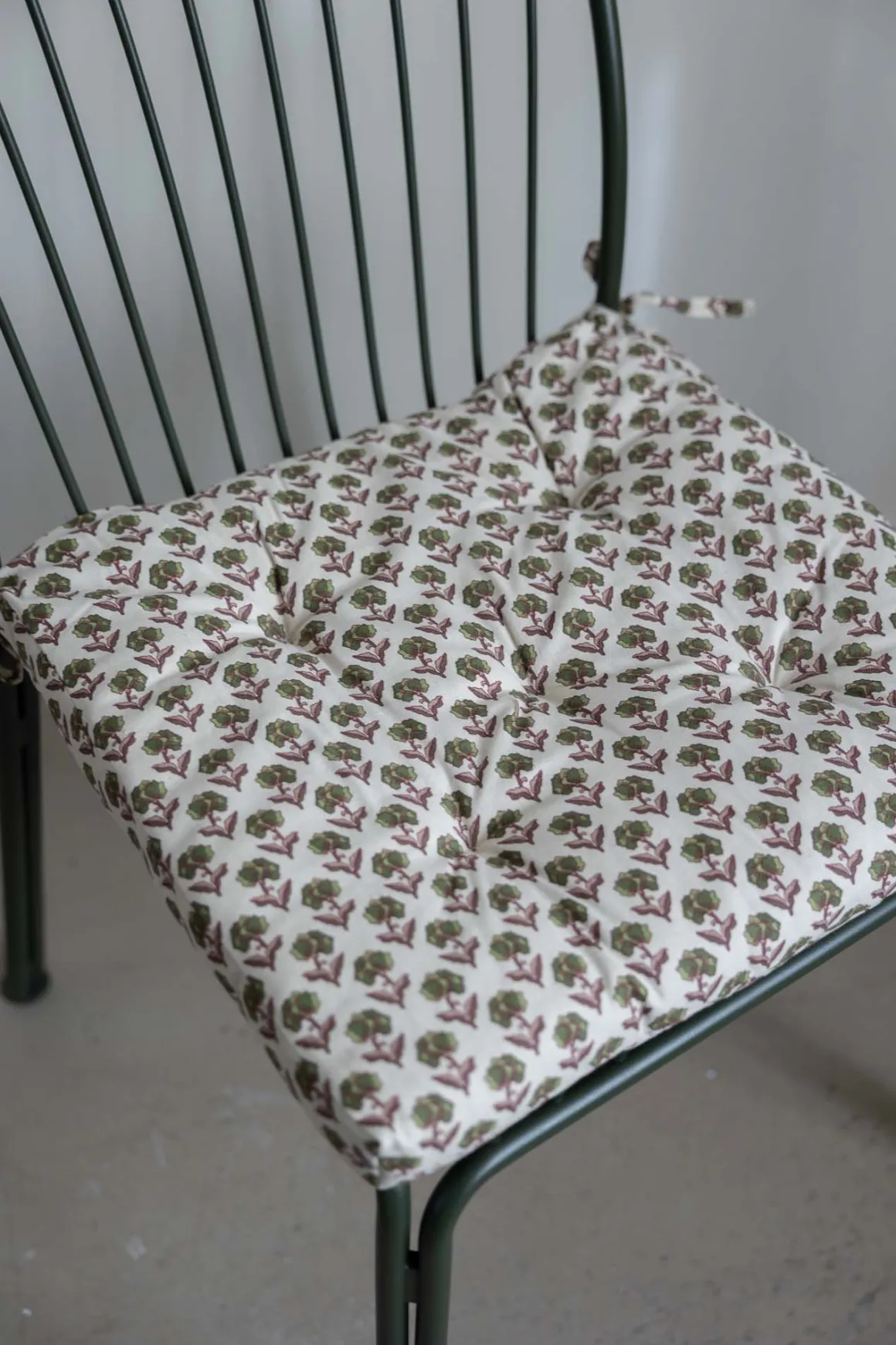Fargerik stolpute i off-white, grønn og burgunder med heldekkende mønster inspirert av indiske blokktrykk. Laget i slitesterk bomull med fyll av resirkulerte bomullsrester. Gir ekstra komfort på stol, terrasse eller rett på bakken, og knytes fast i hjørnene. Unngå direkte sollys, da fargene kan falme.