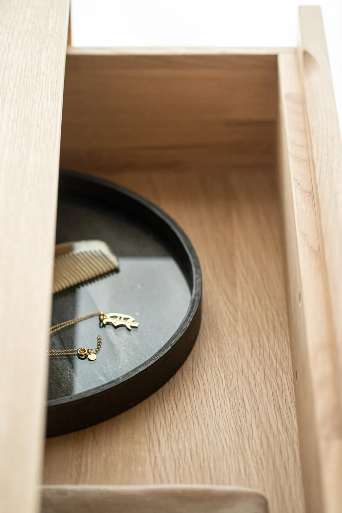 Wave sjenk i oljet eik fra Ethnicraft. De subtile konturene til dørene og den utpregede formen på føttene er det som gjør Wave-kolleksjonen så spesiell. Sjenken har 2 dører og 3 romslige skuffer. Dørene og skuffene er uten håndtak, laget av solid eik, og har en myk lukkemekanisme som framhever det solide og eksklusive håndverket. Et solid og romslig møbel som gjemmer unna tilbehør og ting og tang som kanskje ikke egner seg så godt på display.