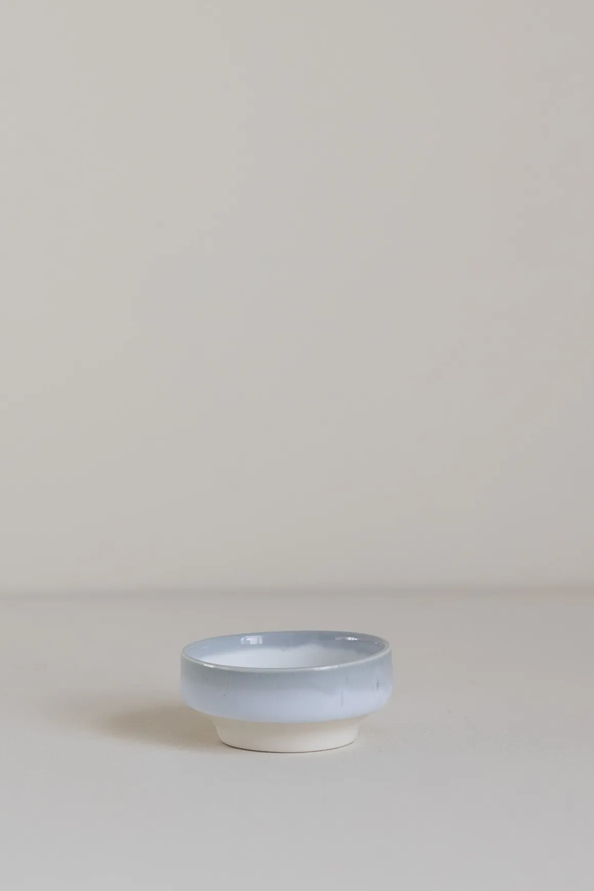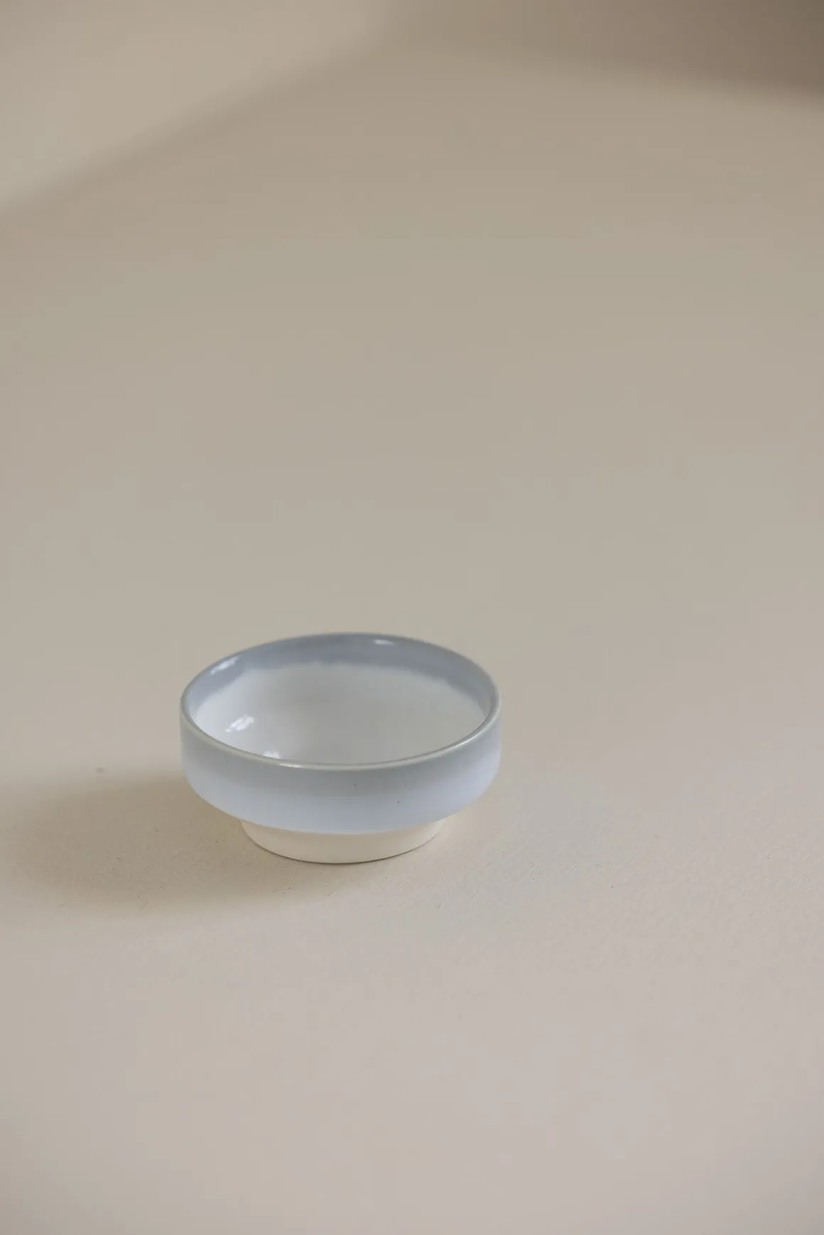 Dip Dish er en liten, håndlaget skål med en bred, flat fot som gir stabilitet på flate underlag. Hver skål er unik, med små variasjoner i form og glasur. Den passer perfekt til soyasaus, aioli, oliven og nøtter, eller som oppbevaring for smykker.