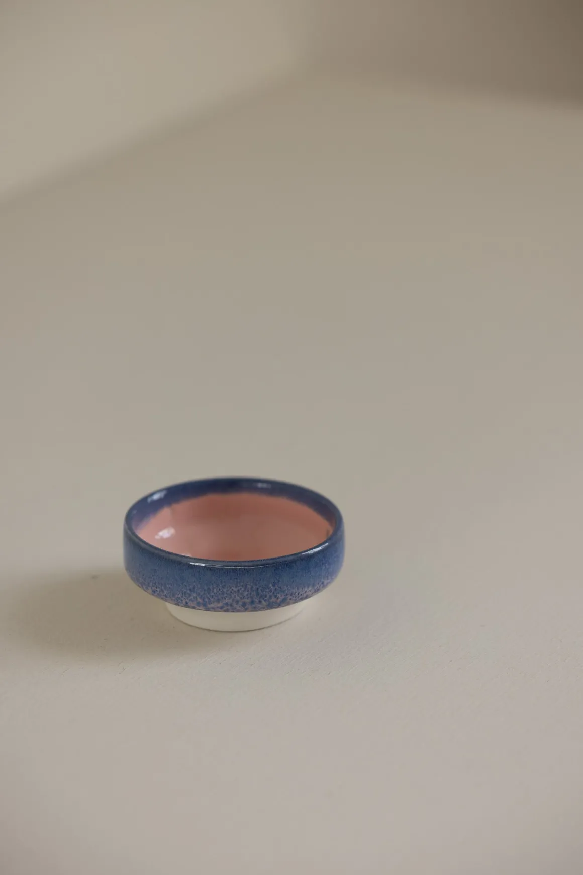 Dip Dish er en liten, håndlaget skål med en bred, flat fot som gir stabilitet på flate underlag. Hver skål er unik, med små variasjoner i form og glasur. Den passer perfekt til soyasaus, aioli, oliven og nøtter, eller som oppbevaring for smykker.
