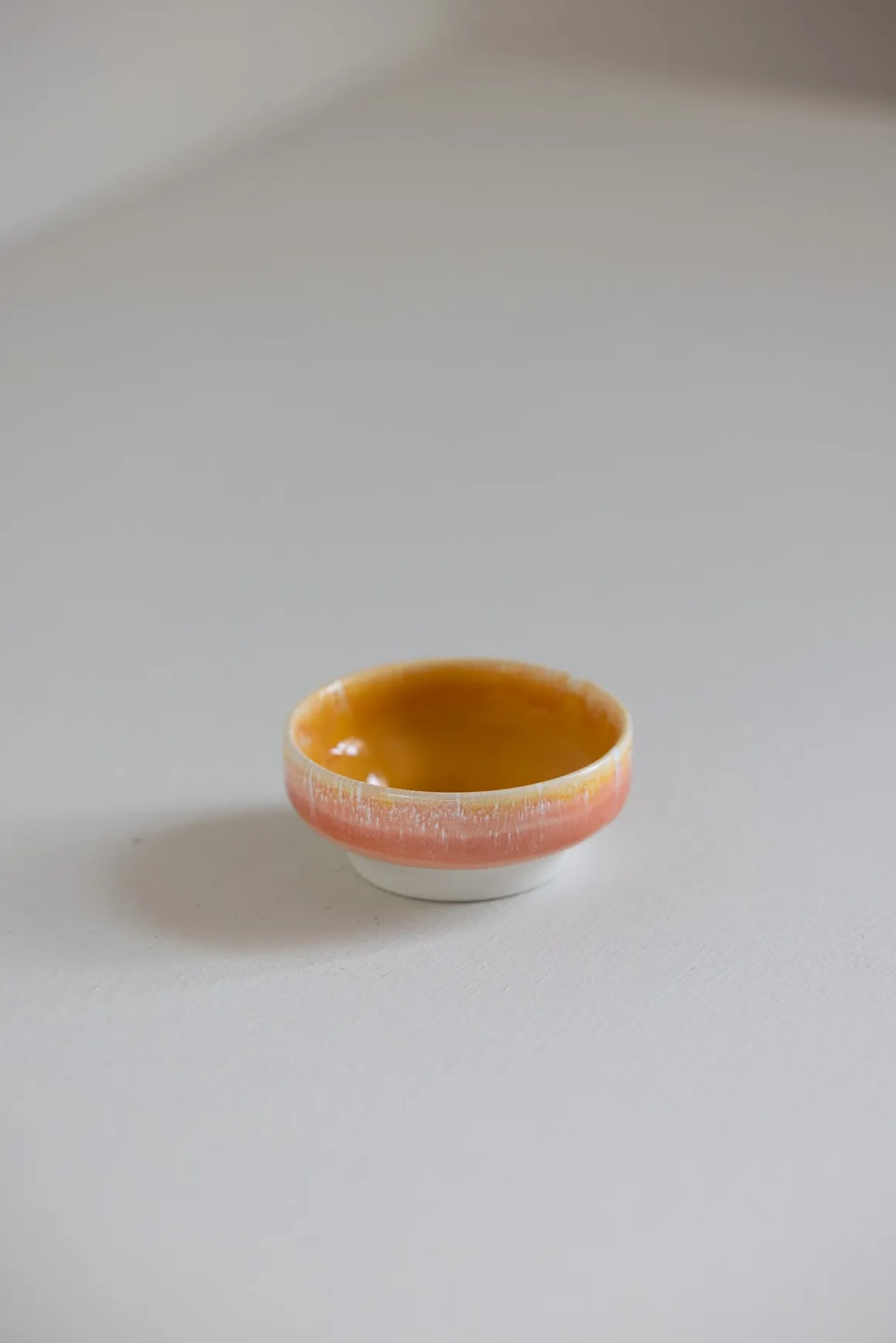 Dip Dish er en liten, håndlaget skål med en bred, flat fot som gir stabilitet på flate underlag. Hver skål er unik, med små variasjoner i form og glasur. Den passer perfekt til soyasaus, aioli, oliven og nøtter, eller som oppbevaring for smykker.
