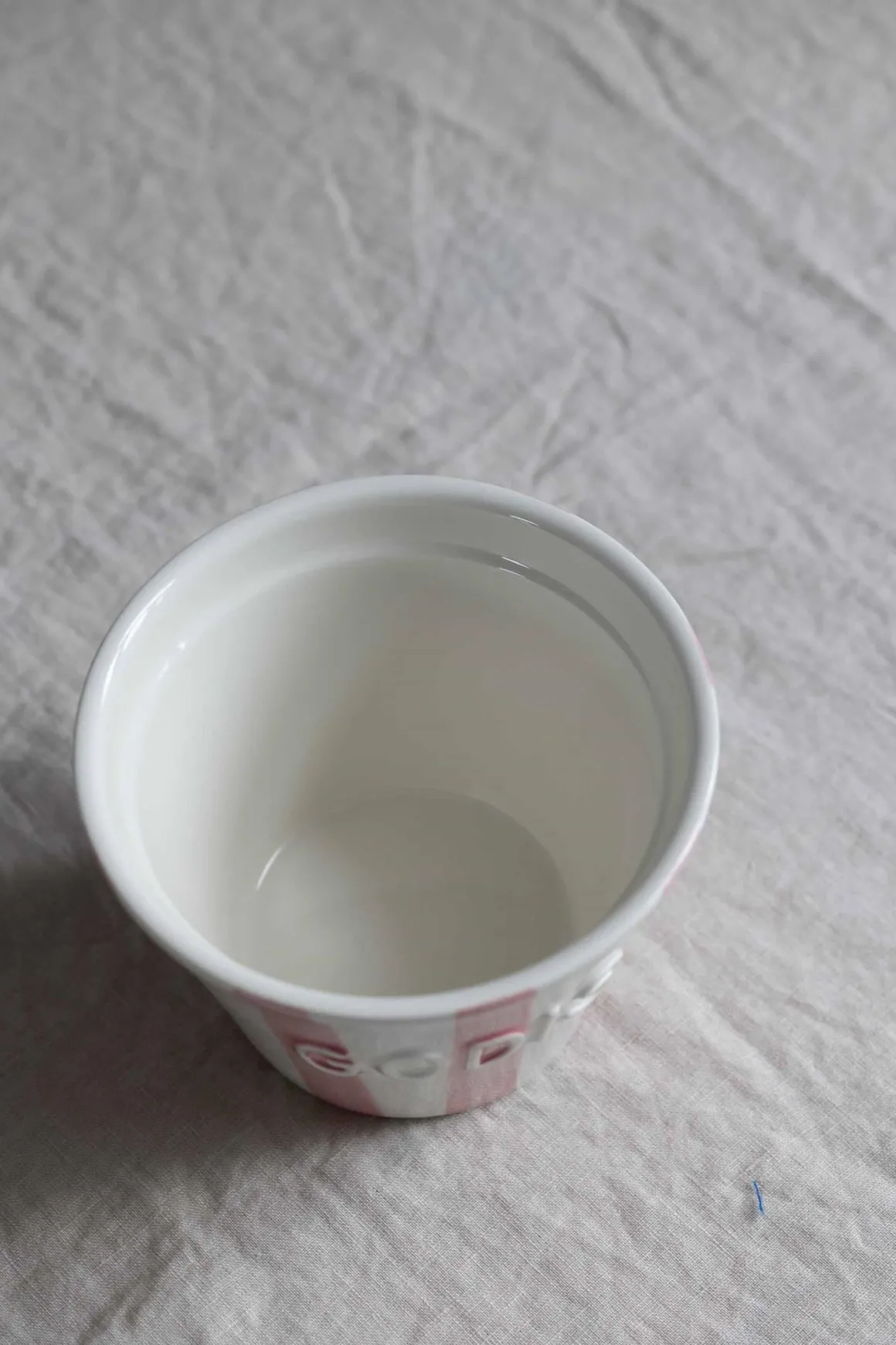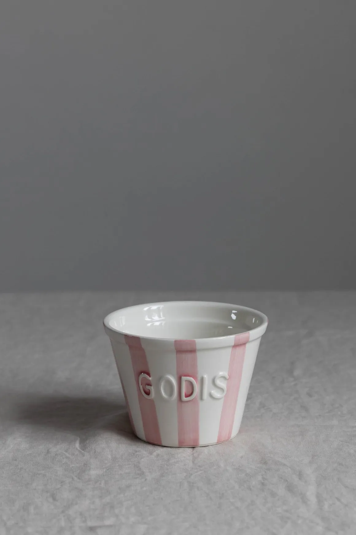 Liten søt godteri skål som gir en nostalgisk følelse fra svenske Bruka Design. Den har en perfekt størrelse og supersøt med håndmalte rosa striper.