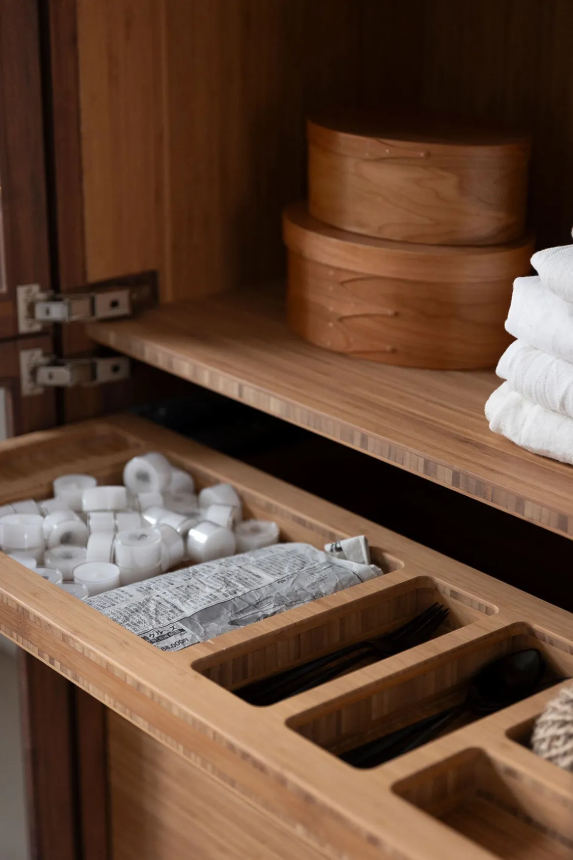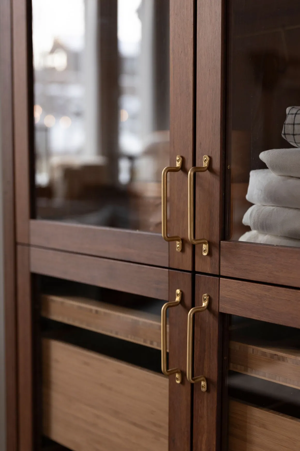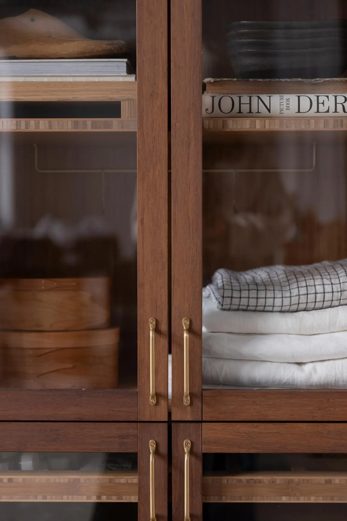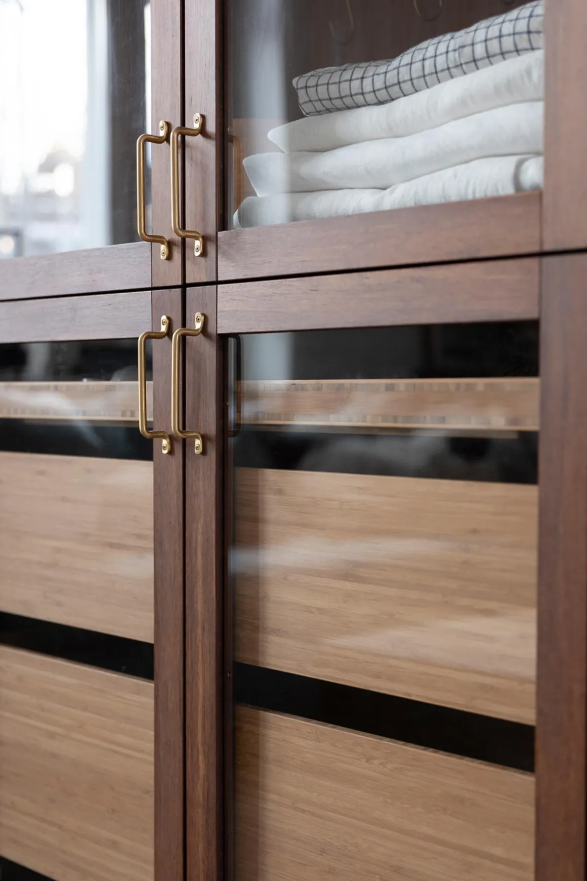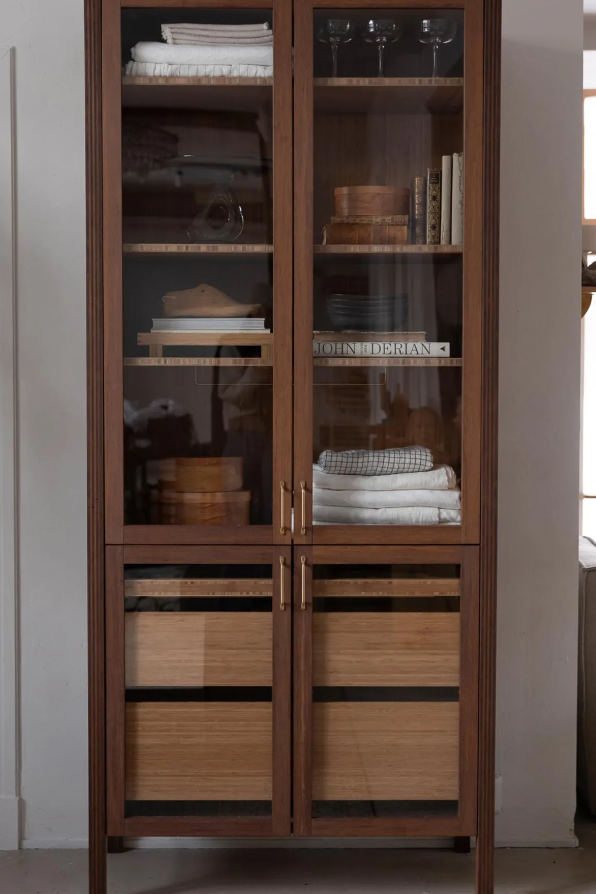 Vitrineskap i bambus fra norske Ask og Eng, laget i eksklusivt samarbeid med Bolina. Det skreddersydde, håndlagde skapet i solid, brun bambus har dører i glass og håndtak og detaljer i varm messing som harmonerer perfekt. Her er ingenting overlatt til tilfeldighetene og hver detalj er nøye gjennomtenkt. Skapet kan brukes som et frittstående møbel der du trenger det i huset eller du kan innlemme det som en del av kjøkkenet eller spisestuen for eksempel. Vis fram utvalgte skatter, serviser, vaser, objekter eller tekstiler og bruk skuffene til oppbevaring av andre ting som ikke trenger å synes. Skapet er designet og håndlaget på Ask og Eng・Workshop i Drammen. Skapet kan bestilles i et større utvalg farger/finisher og hardware og detaljer i ulike metaller- kom innom butikken for å se skapet live og snakk med oss så hjelper vi deg å finne den perfekte match til ditt hjem.