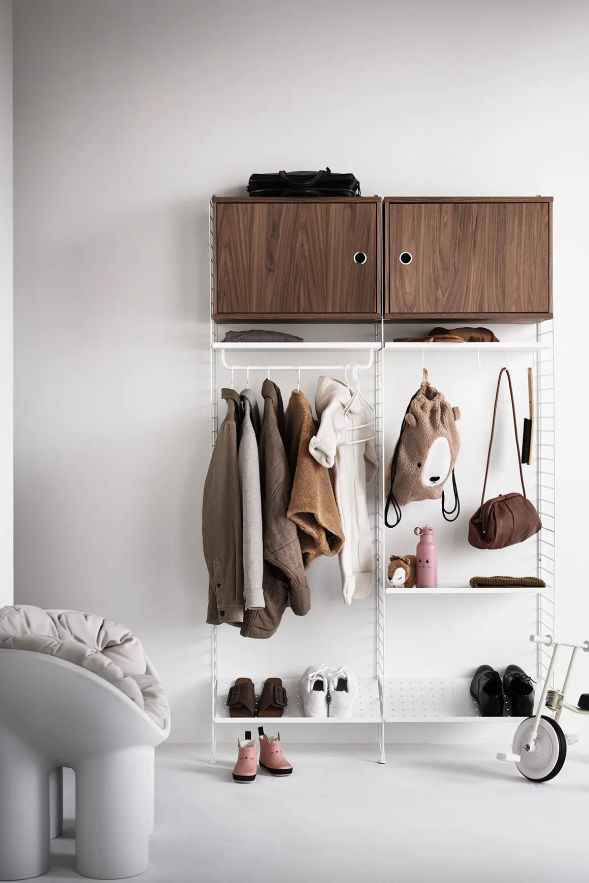 Dette skapet selges som en enkeltdel du praktisk kan kombinere i ditt String® System med gavler som er 30 cm dype. Tilgjengelige i én bredde, 58 cm. Visuelt er det fint å tilføre et større element til Stringhyllen din, som dette skapet, samtidig som det er praktisk med ekstra oppbevaring. Døren kan monteres på hver side av skapet. Den kommer med én justerbar indre hylle. Følger med opphengsbeslag.