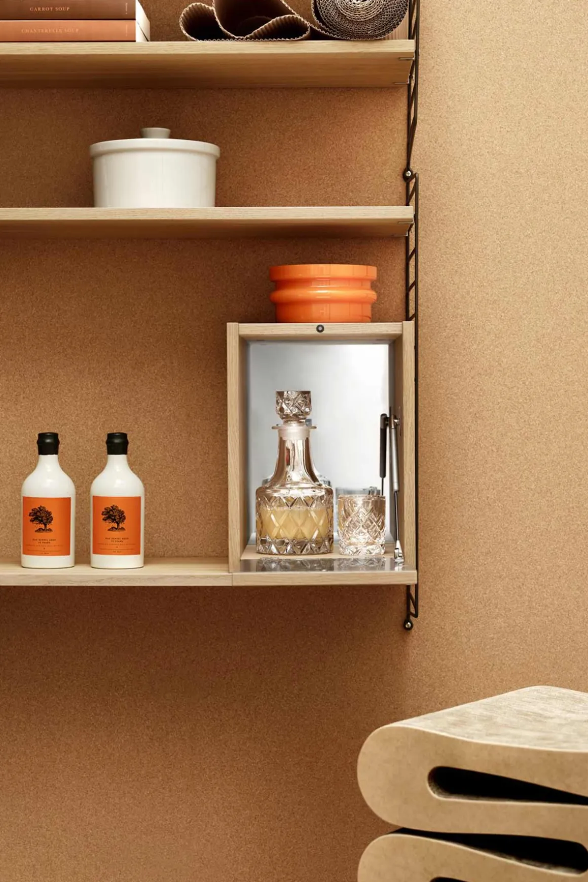 Tiny er et nett, lite skap som selges som en enkeltdel du praktisk kan kombinere i ditt String® System. Perfekt til å bryte opp hyllesystemet litt slik at det blir mer visuelt spennende, samtidig som skapet er superpraktisk til oppbevaring og lagring av mindre ting og tang. Tiny finnes kun i målene 28 x 38 x 30 og passer med gavler som er 30 cm dype. Den må enten plasseres på toppen av en trehylle eller et String-skap og festes inntil en av gavlene på siden. Innsiden av lokket er ikledd en plate i børstet rustfritt stål. Den indre bakveggen i skapet er ikledd en speilplate. Tiny leveres umontert og med opphengsbeslag i pakken. Selges pr stk.