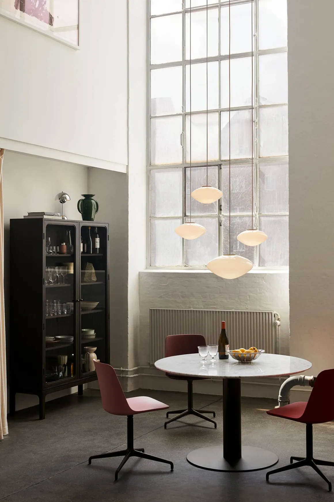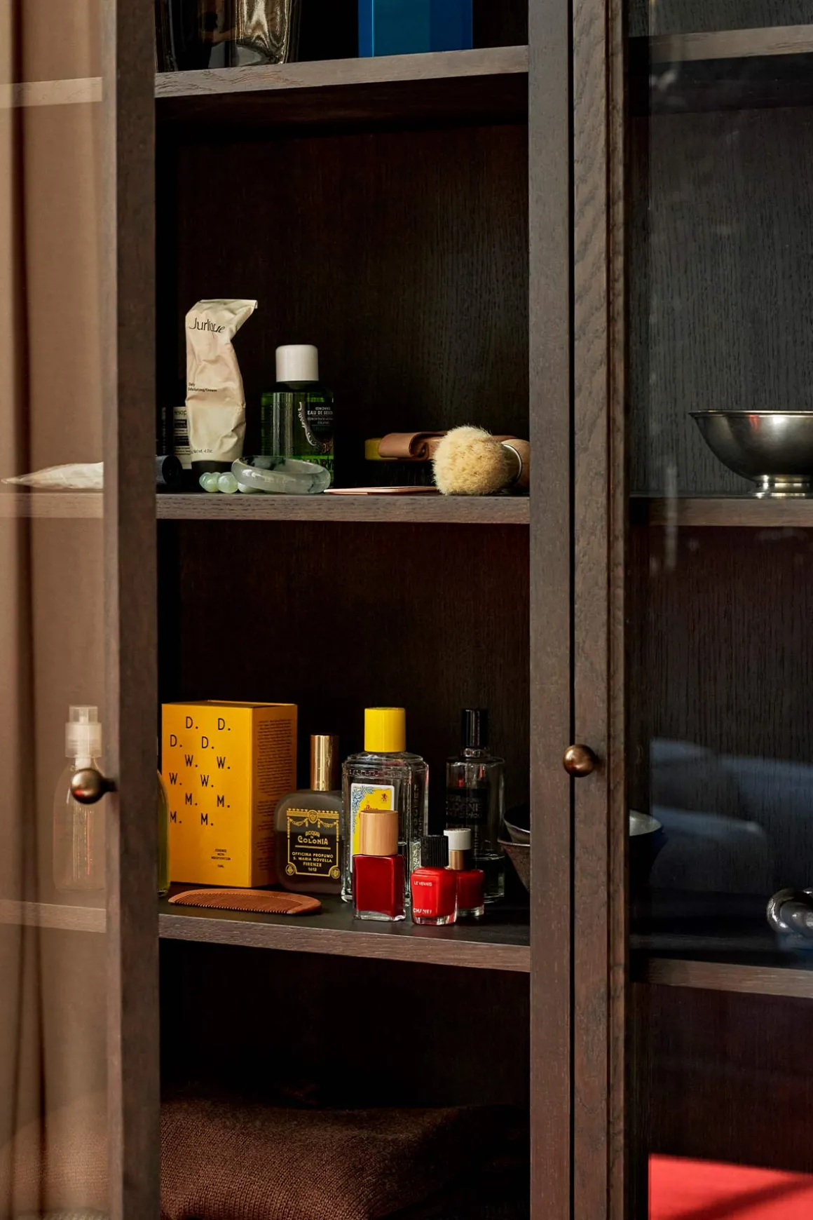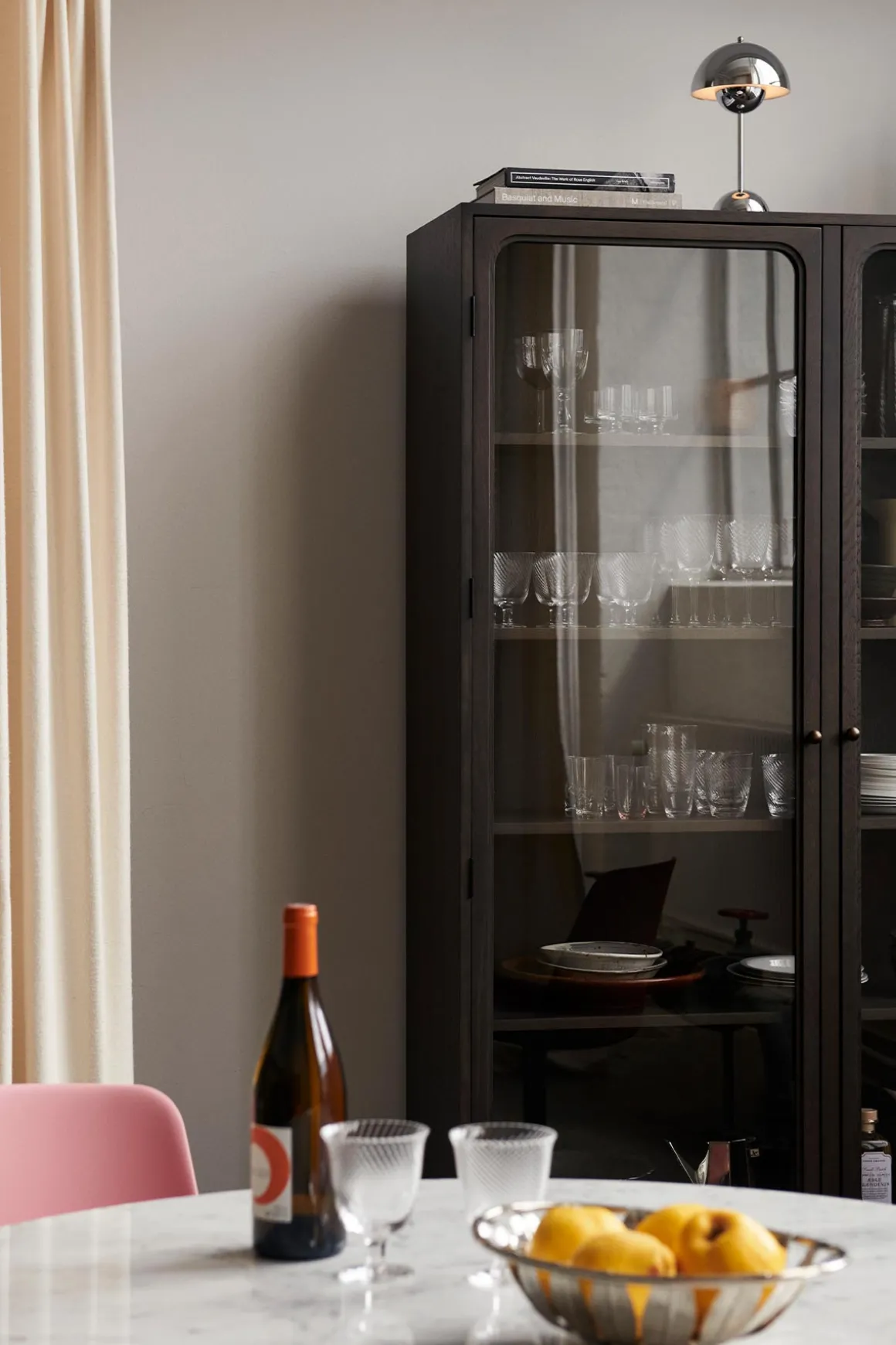 Trace Double er et vakkert, romslig vitrineskap som forener en moderne silhuett med et klassisk uttrykk, designet av Space Copenhagen for u0026amp;Tradition. Designstudioet valgte skapets navn for å gjenspeile konseptet med å samle små, sentimentale objekter fra livene våre – og sporene de etterlater seg. Skapet og hyllene er laget av MDF-plater, skåret til og dekket med eikefiner, deretter behandlet med mørkbeiset lakk. Dørene er laget av frest massiv eik og herdet glass. Trace passer sømløst inn i skandinaviske hjem, og er et tidløst utstillingsvindu til dine kjæreste eiendeler. Trace finnes også i en smalere variant og i naturlig eik.