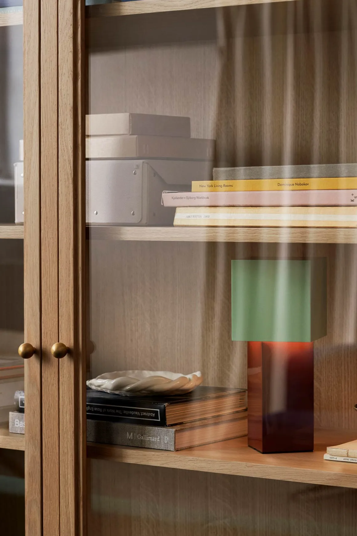Trace Double er et vakkert, romslig vitrineskap som forener en moderne silhuett med et klassisk uttrykk, designet av Space Copenhagen for u0026amp;Tradition. Designstudioet valgte skapets navn for å gjenspeile konseptet med å samle små, sentimentale objekter fra livene våre – og sporene de etterlater seg. Skapet og hyllene er laget av MDF-plater, skåret til og dekket med eikefiner, deretter behandlet med vannbasert klar lakk. Dørene er laget av frest massiv eik og herdet glass. Trace passer sømløst inn i skandinaviske hjem, og er et tidløst utstillingsvindu til dine kjæreste eiendeler. Trace finnes også i en smalere variant og i mørkbeiset eik.