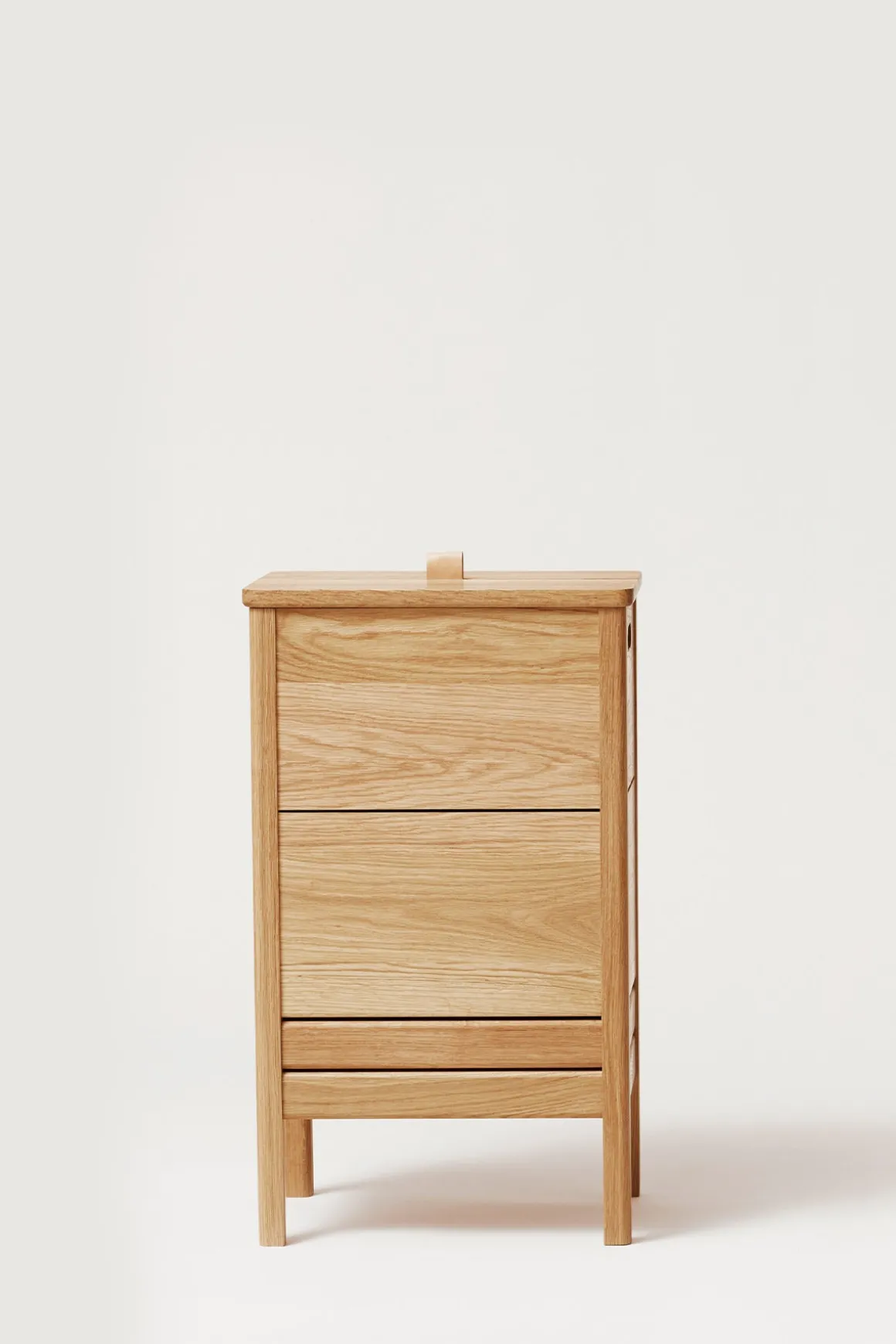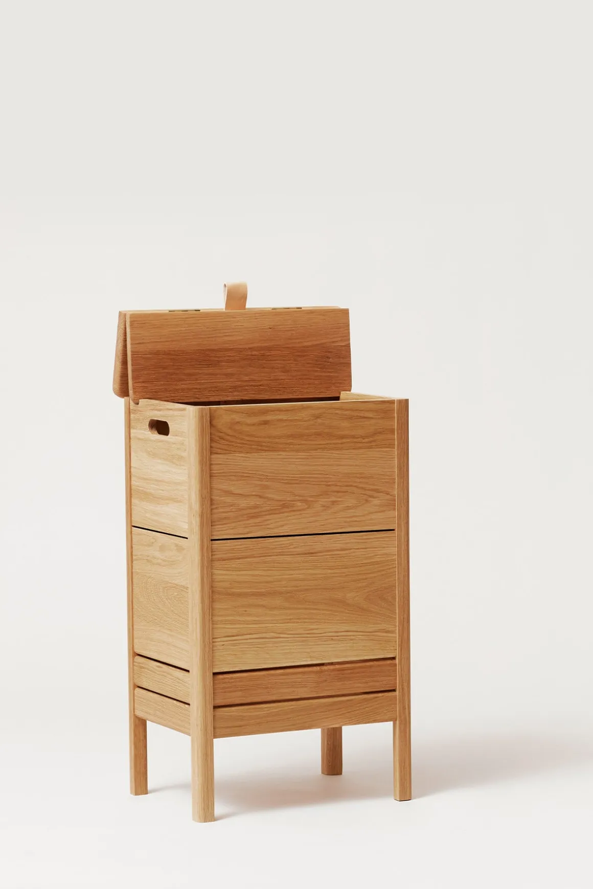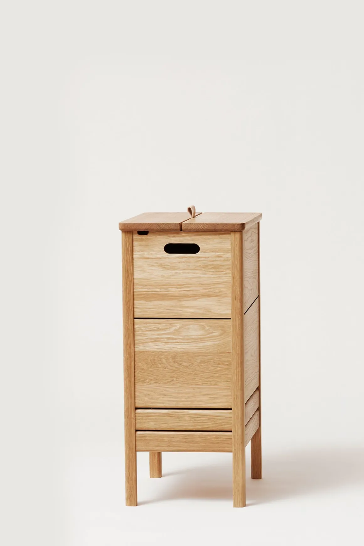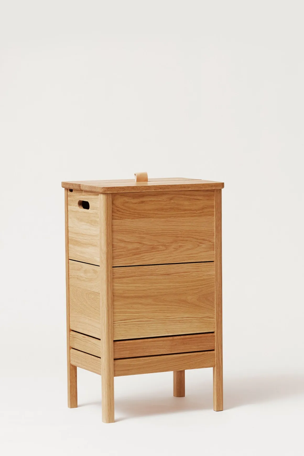 A Line Laundry Box fra Form u0026amp; Refine er både stilsikker, romslig og praktisk. Designet av duoen fra Herman Studio, som kjennetegnes av balanserte kombinasjoner mellom funksjonelt og overraskende design. Skittentøyskurven er laget av solid og slitesterk, oljet eik med mye lagringsplass. Lokket løftes med et lite skinnhåndtak på toppen og håndtakene på hver side gjør det mulig å flytte den rundt. De to parallelle sporene lar luften inne i boksen ventilere naturlig, en viktig funksjon for en skittentøyskurv. Det nedre snittet på de to bena vinkler stykket for å gi det en følelse av å bli løftet opp, noe som gjør den generelle designen solid og robust, men også stilig. Det tidløse designet i naturlig oljet eik vil skli rett inn i alle interiørstiler.