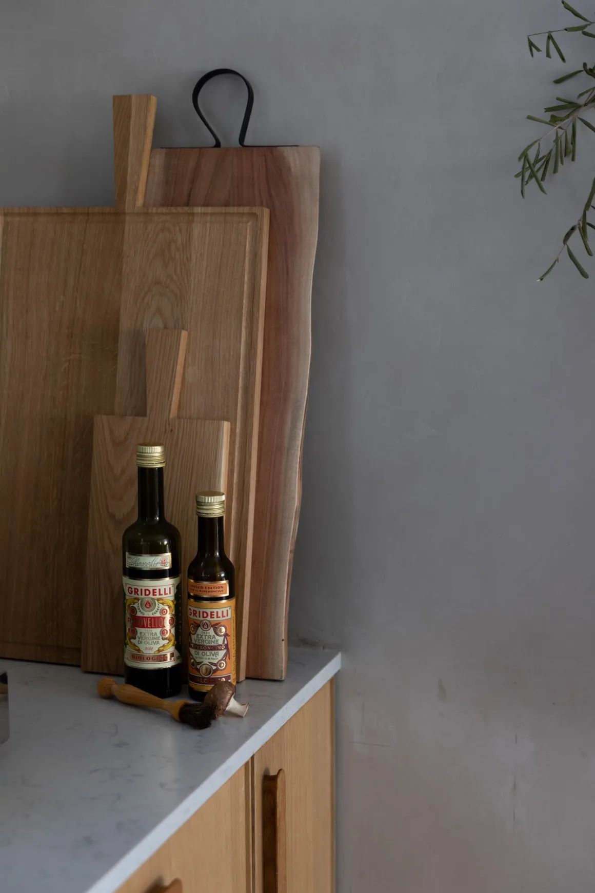 Stort skjærebrett i oljet eik fra Raumgestalt. Brettet har et fint håndtak og en saftrille, perfekt for å unngå søl som ellers havner på benkeplaten. Skjærebrettet vil også være et dekorativt element i kjøkkeninnredningen din og gi et varmt, rustikt utseende. Brettet er også praktisk til servering av ost og kjeks.