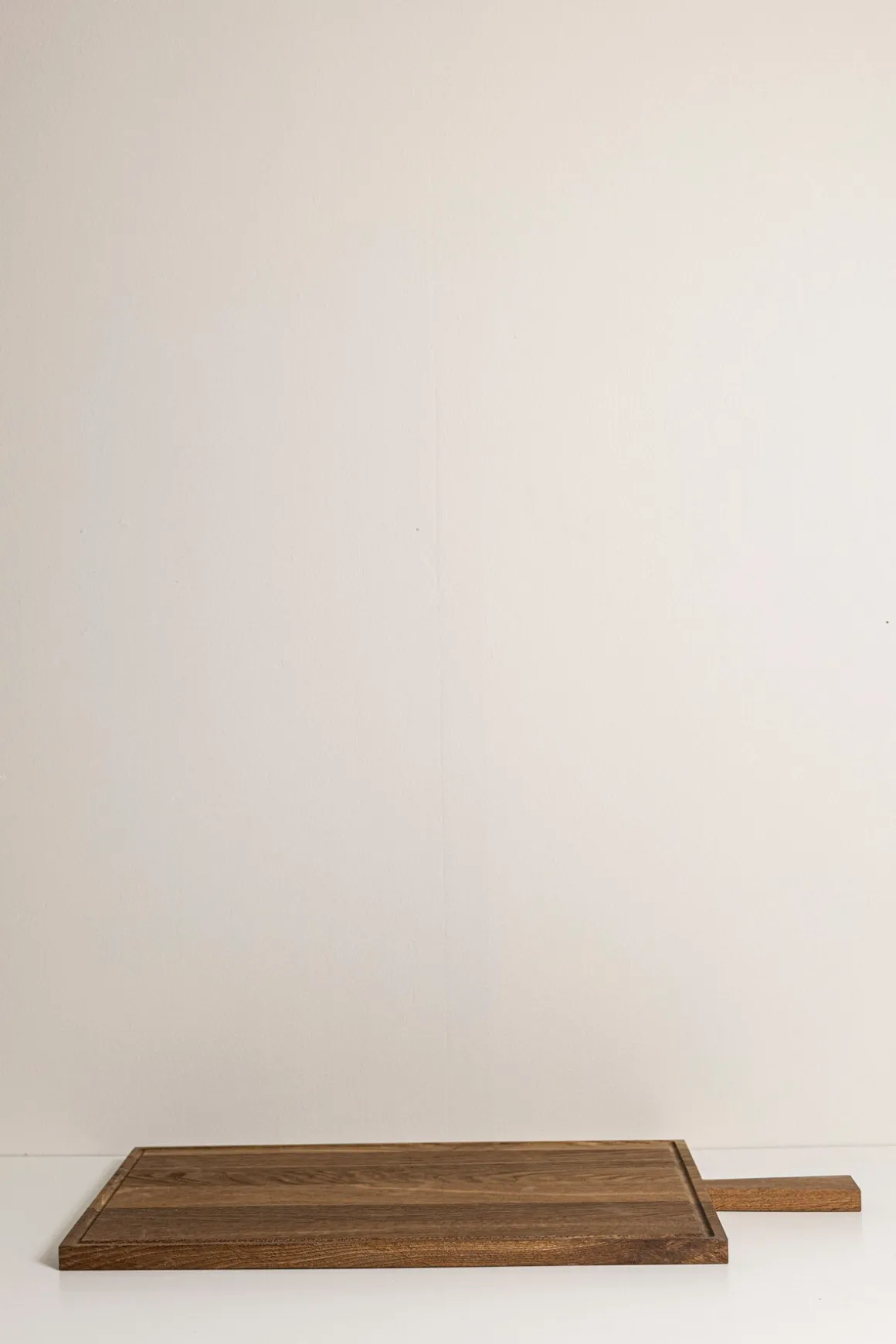 Bredt, rektangulært skjærebrett i naturlig, mørkoljet eik fra Raumgestalt. Brettet har et fint håndtak og en naturlig overflate med saftrille lang kanten. Skjærebrettet vil kunne være et dekorativt element i kjøkkeninnredningen din og gi et varmt, rustikt utseende. Brettet er også praktisk til servering av oster og forskjellig snacks.