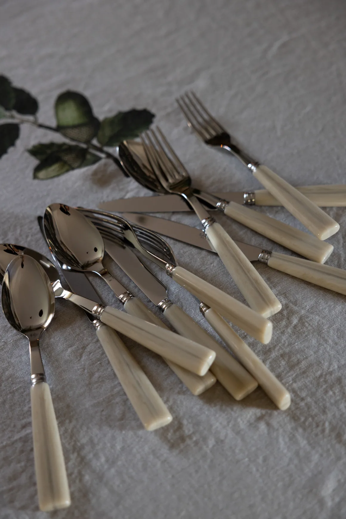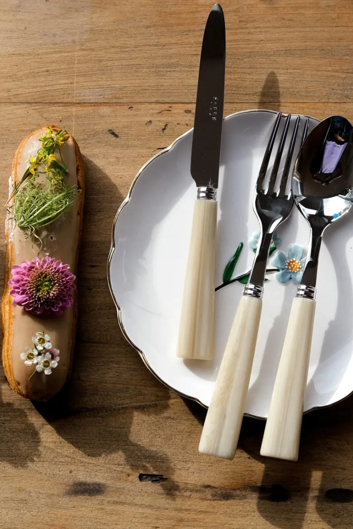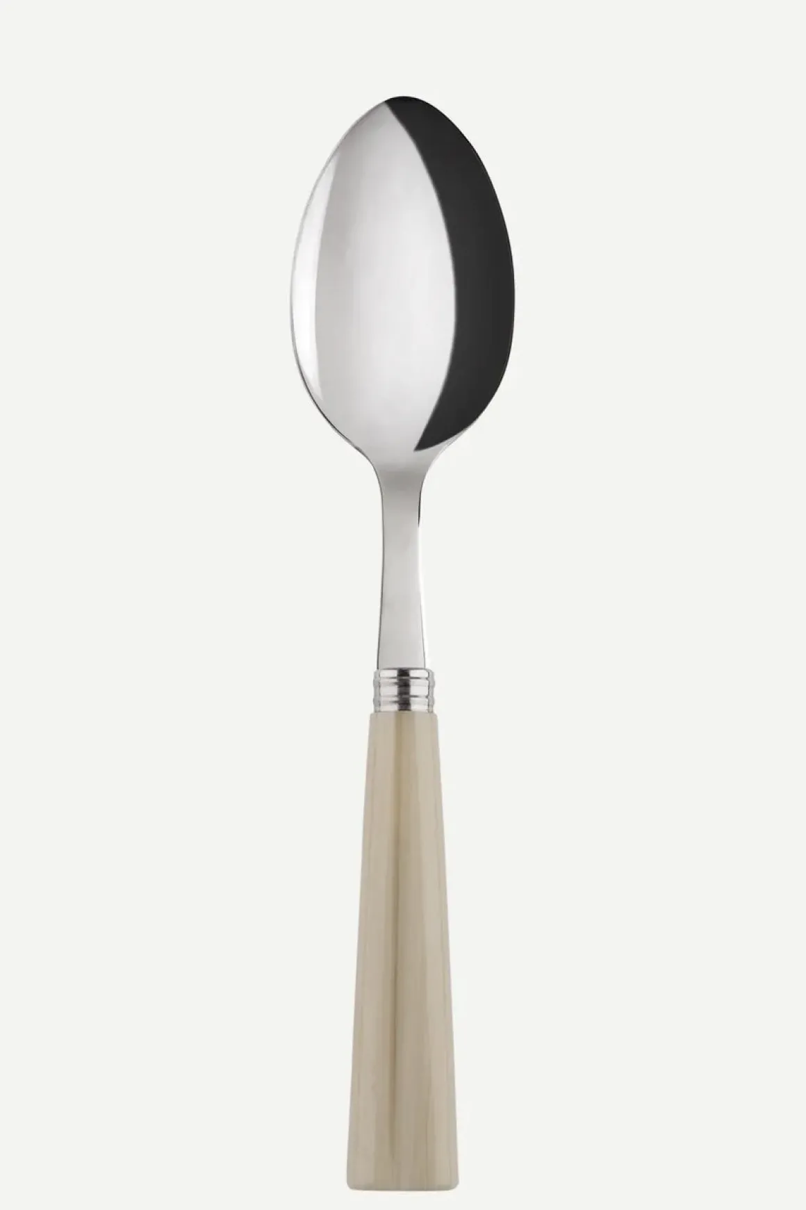 Skje fra franske Sabre, en del av Nature-kolleksjonen som deler det ikoniske designet fra den populære ICÔNE-serien. Med håndtak i et materiale som imiterer horn, får bestikket et varmt og naturlig uttrykk. Den harmoniske kombinasjonen av naturinspirerte detaljer og rustfritt stål gjør Nature-serien til et vakkert tilskudd til enhver borddekking. Enten det er til en enkel hverdagsmiddag eller en spesiell anledning, tilfører Nature-serien en særegen sjarm som gir bordet ditt et personlig preg.