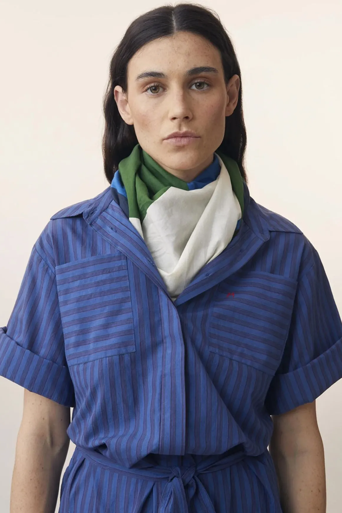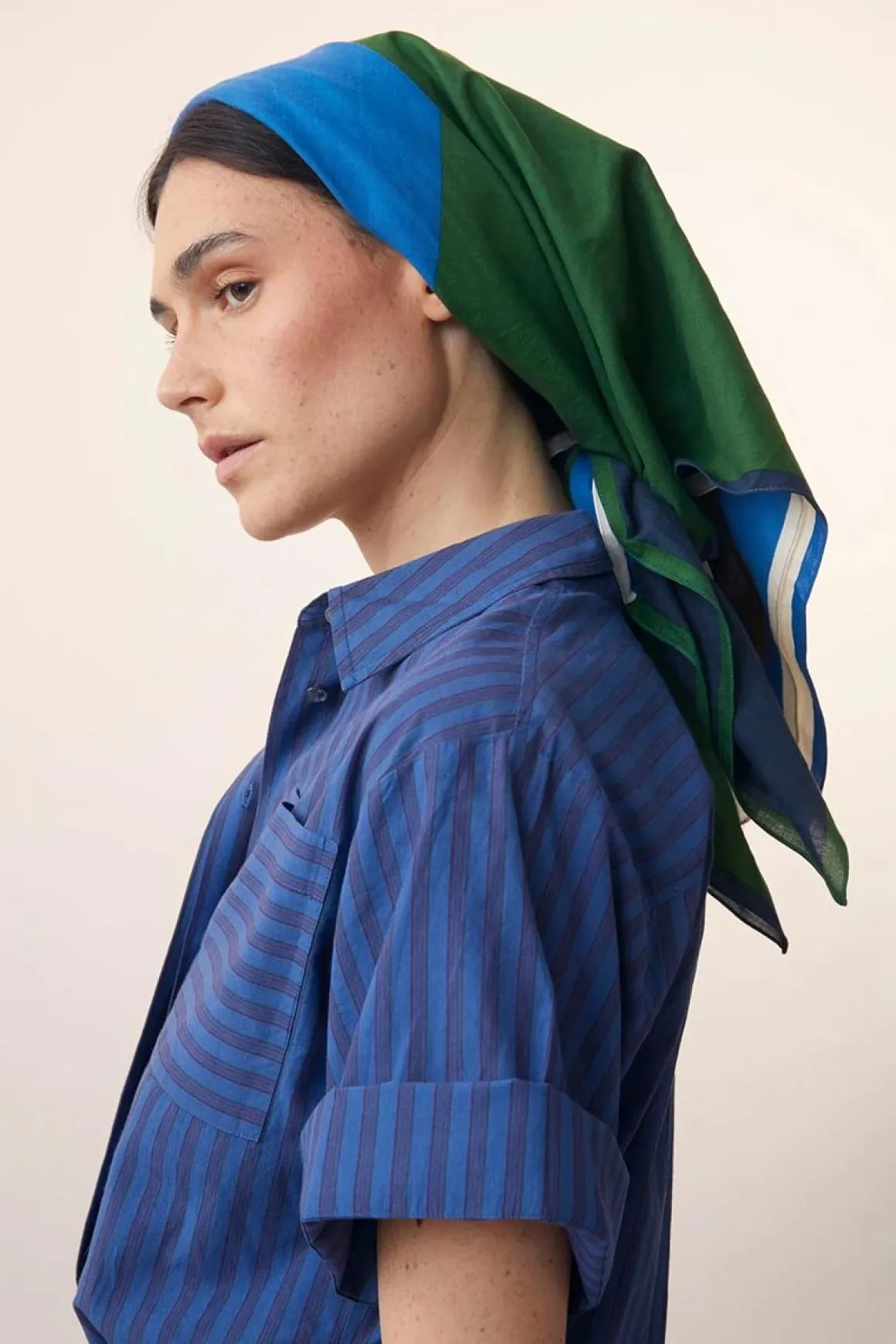 Skjerf N°717 i fargen Bottle Green er laget av lett og myk bomull som føles behagelig mot huden. Det har et grafisk rutemønster i balanserte fargetoner som gir et moderne uttrykk. Den luftige kvaliteten gjør skjerfet allsidig – bruk det rundt halsen, i håret eller som et lett sjal. De rullede kantene gir en fin avslutning og understreker det håndverksmessige preget.