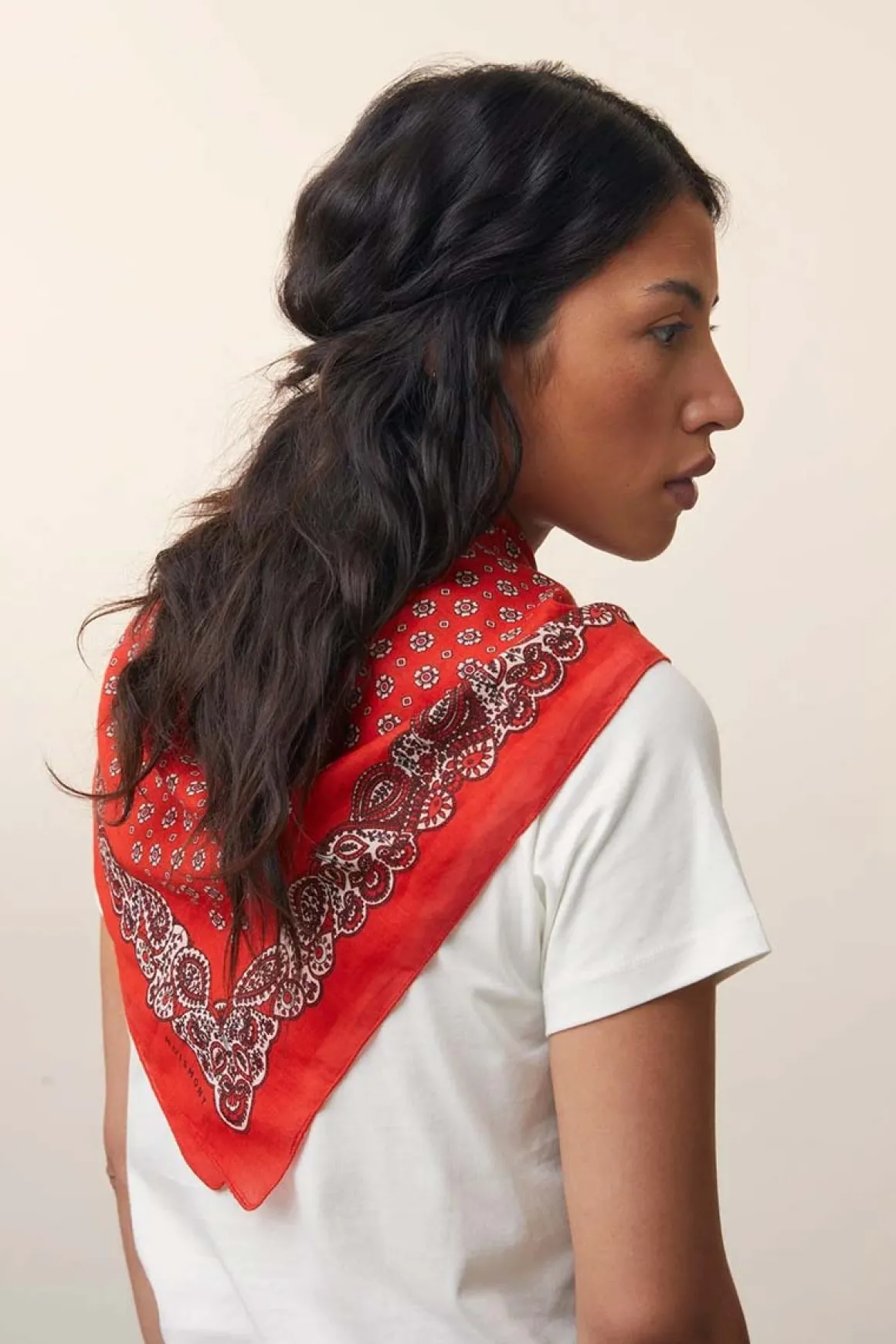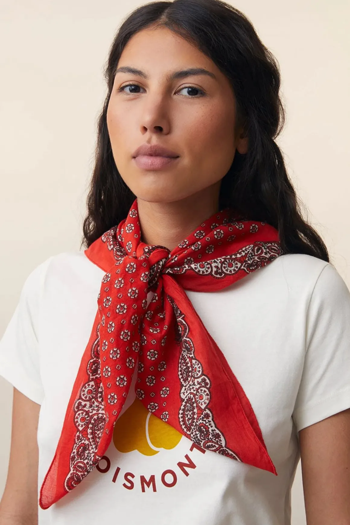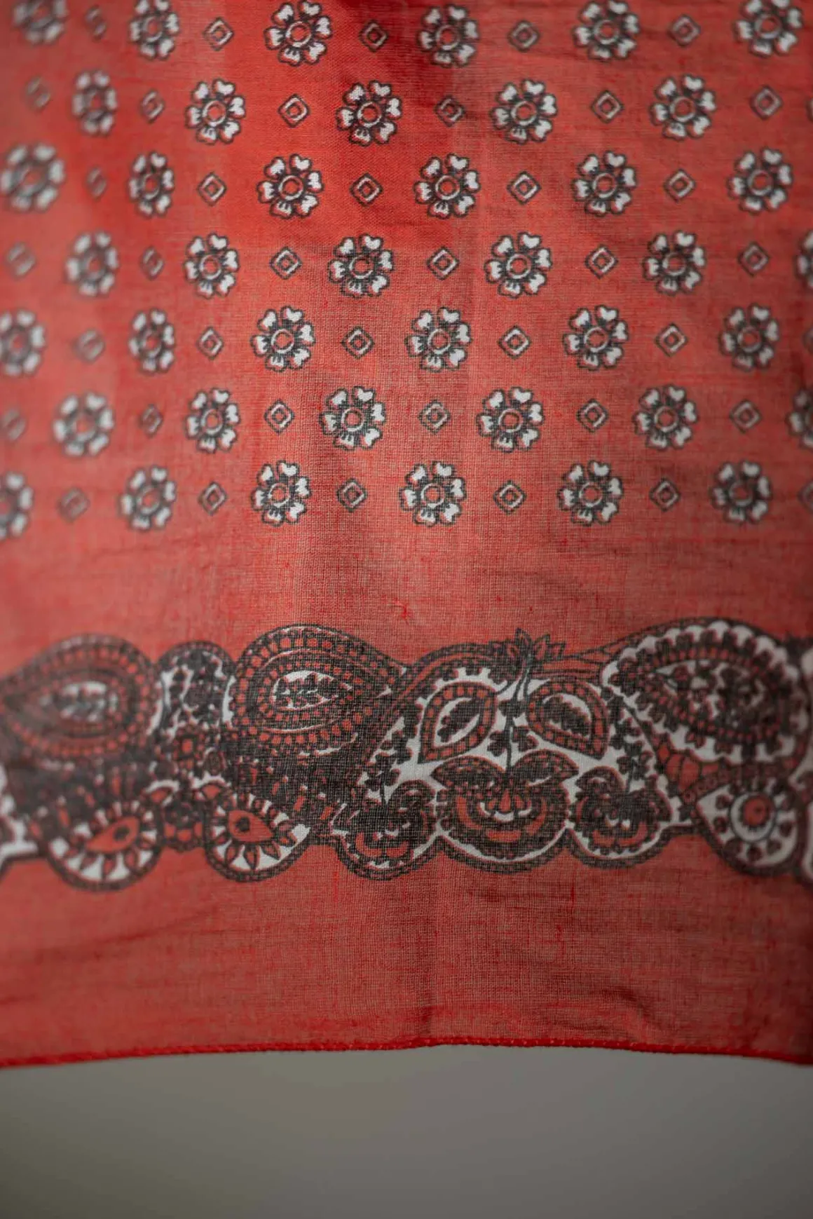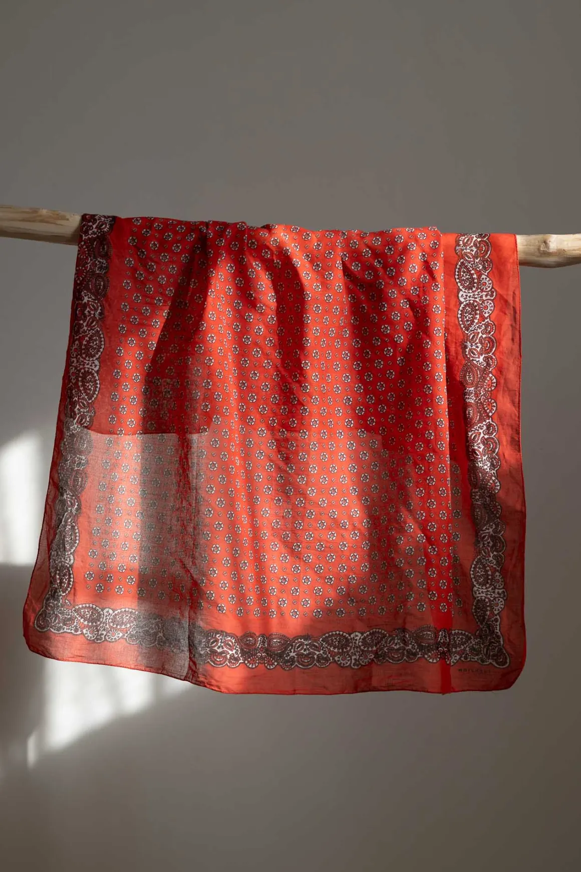 Skjerf N°767 i fargen Tomette er et håndlaget kvadratisk skjerf i 100% bomull. Det måler 90×90 cm og har et klassisk paisleymønster langs kantene, som gir det et tidløst uttrykk. Skjerfet kan styles på mange måter – bruk det som hodeplagg, rundt halsen eller knytt det på vesken for en ekstra detalj. Et allsidig tilbehør med et mykt og lett stoff.