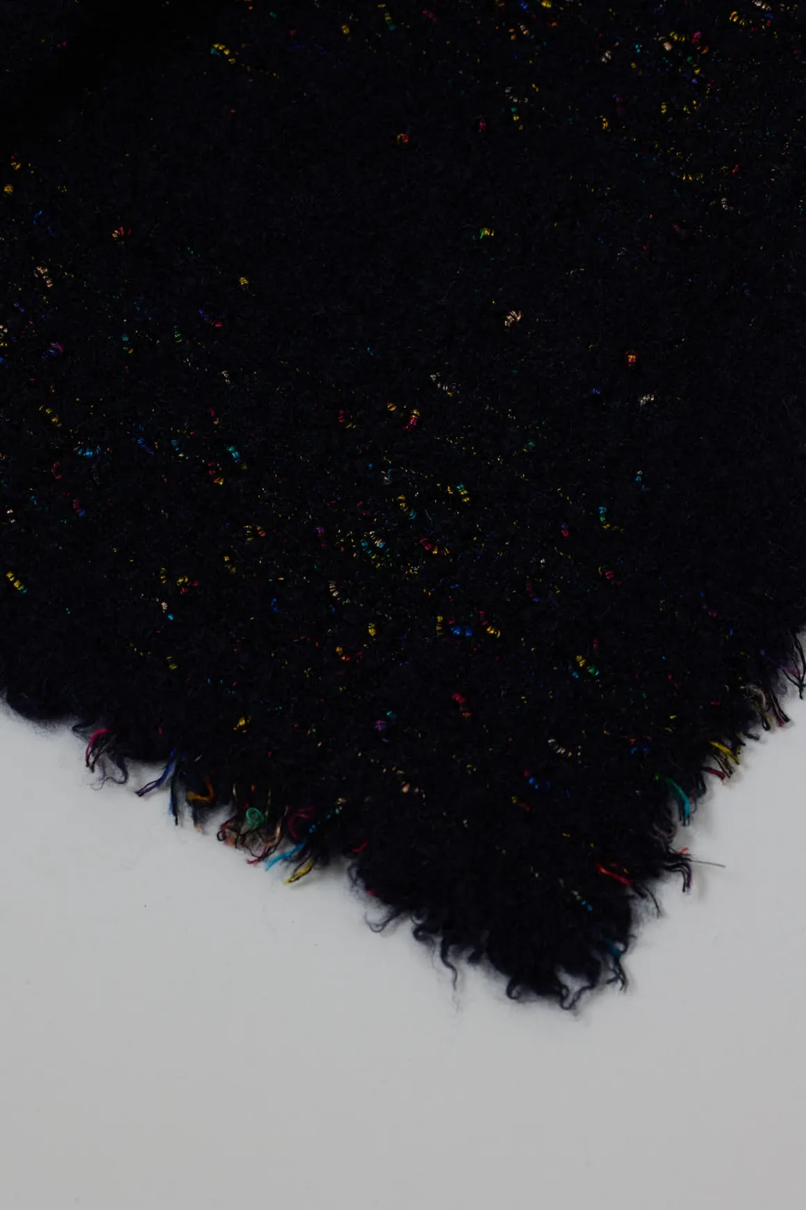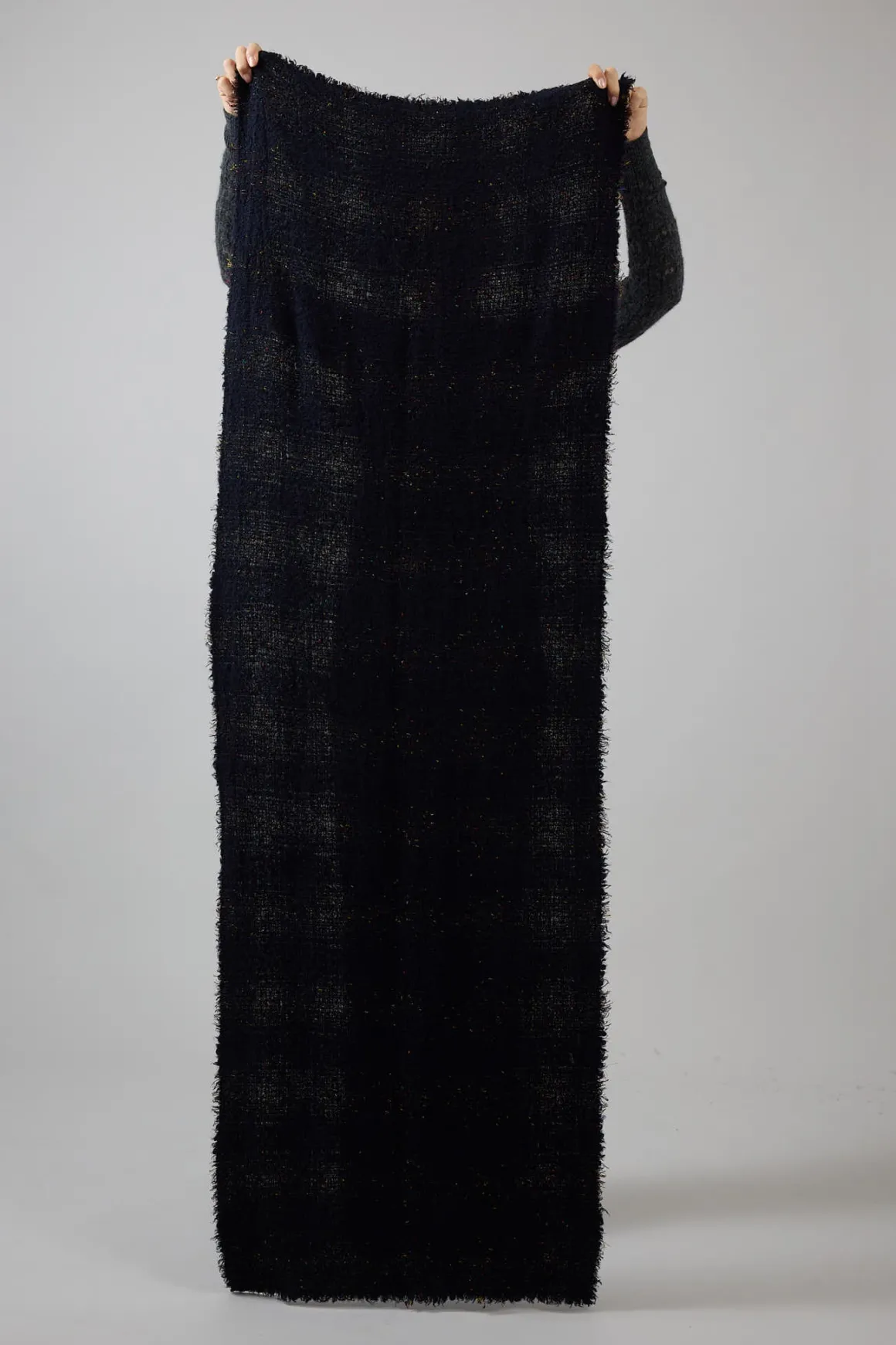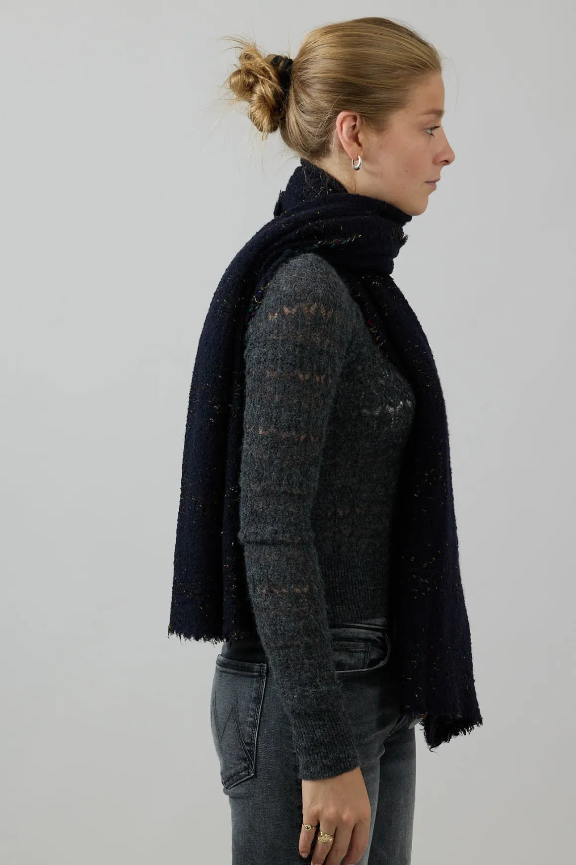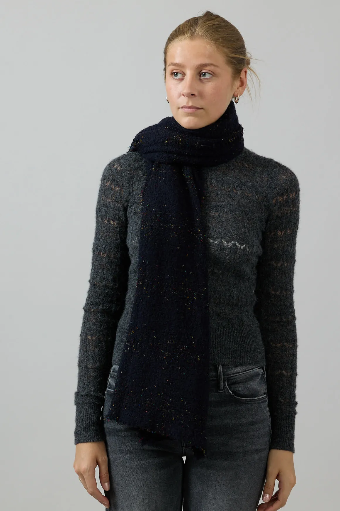 Skjerf fra italienske Faliero Sarti. Dette skjerfet er det perfekte tilbehøret for deg som liker å pakke deg inn ordentlig! Med sin ekstra lange lengde kan du surre det flere ganger rundt halsen eller la det henge løst for en mer avslappet look. Den sorte basen med spettet fargespill gir skjerfet et unikt uttrykk som passer til det meste. Det er både behagelig og lett å style, noe som gjør det til en sikker favoritt på kjølige dager.