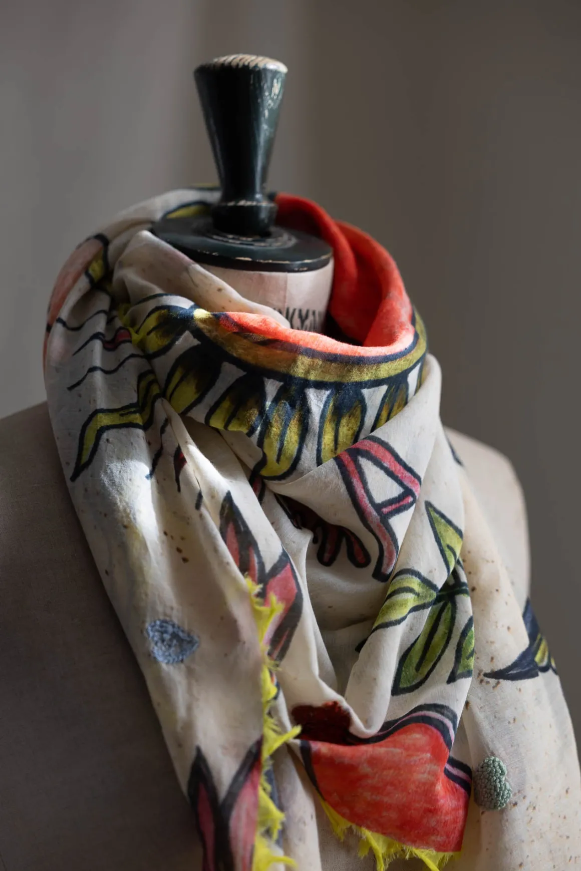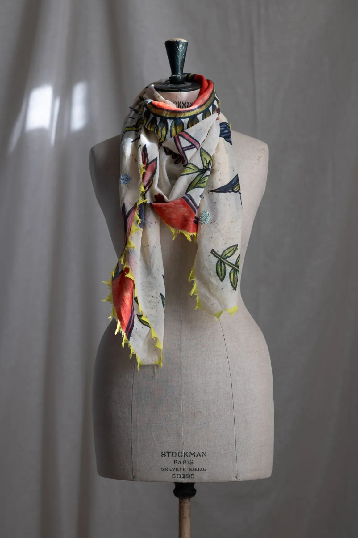 Vida-skjerfet fra Faliero Sarti er et fargerikt blikkfang med livlig print og sterke symboler. Skjerfet er laget i en myk blanding av bomull og silke, og har en dekorativ kant med vekselsvis mønster som gir et lekent og grafisk uttrykk. Bruk skjerfet som bandana, knyt det rundt halsen eller fest det på vesken. Vida er et lite kunstverk av et tilbehør som tilfører personlighet og farge til ethvert antrekk.