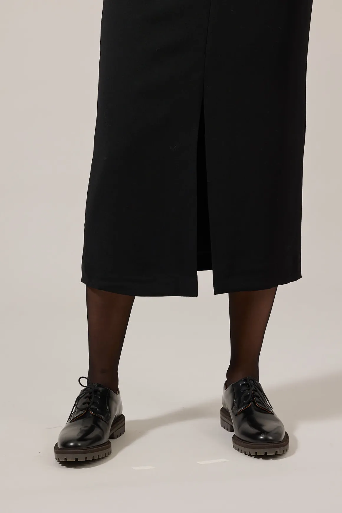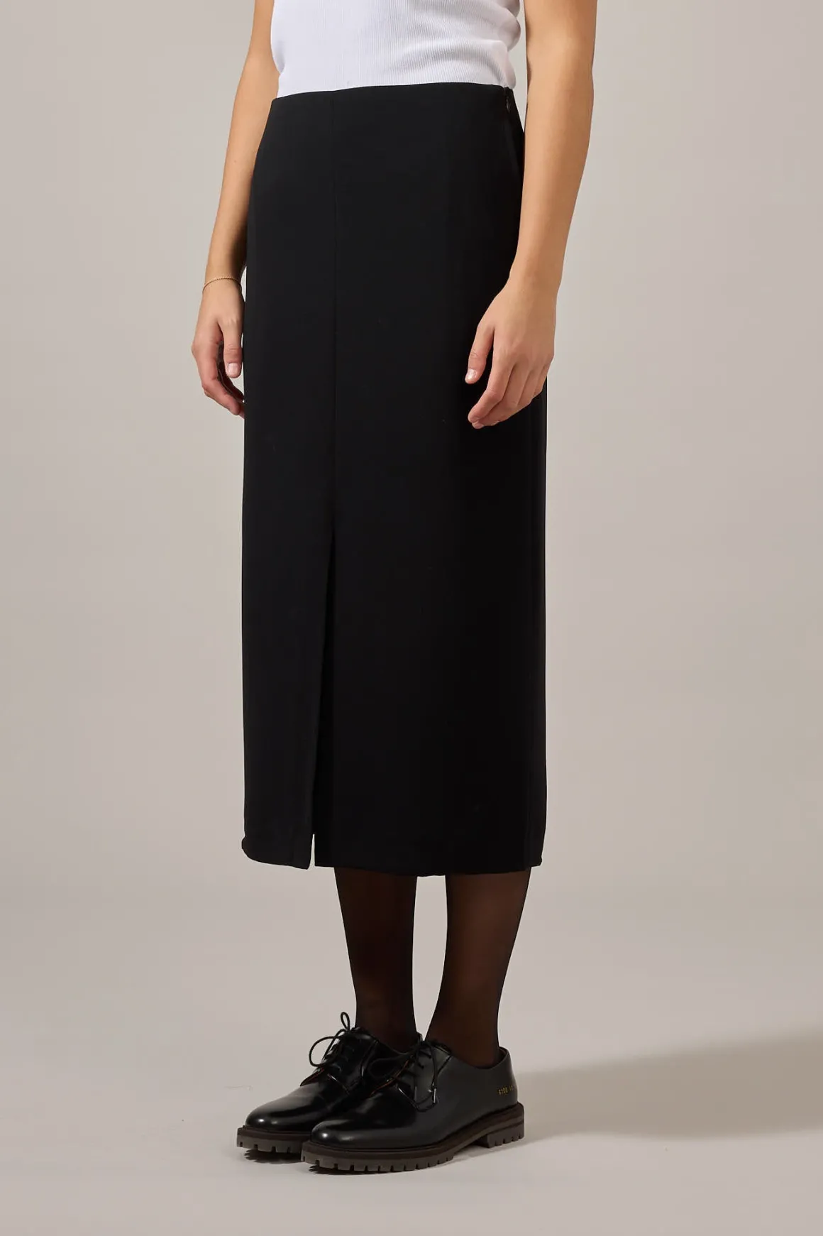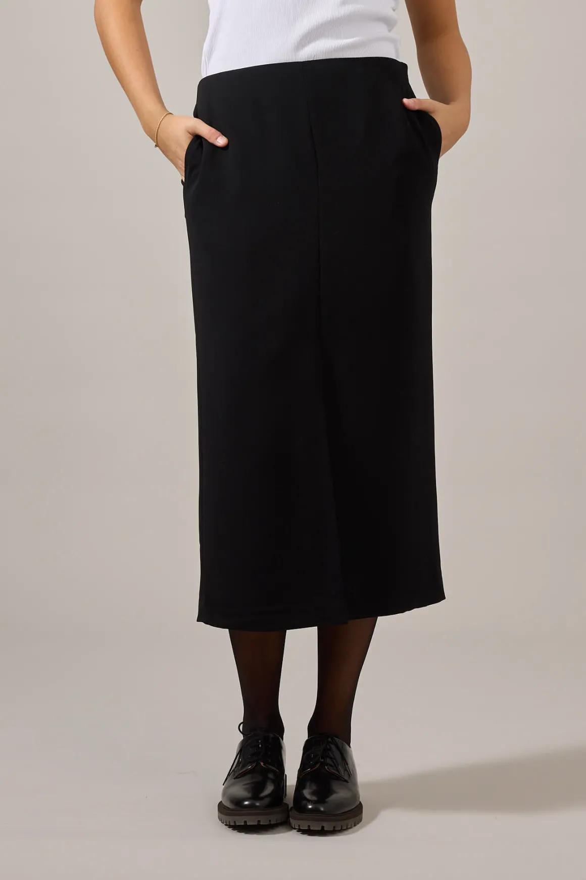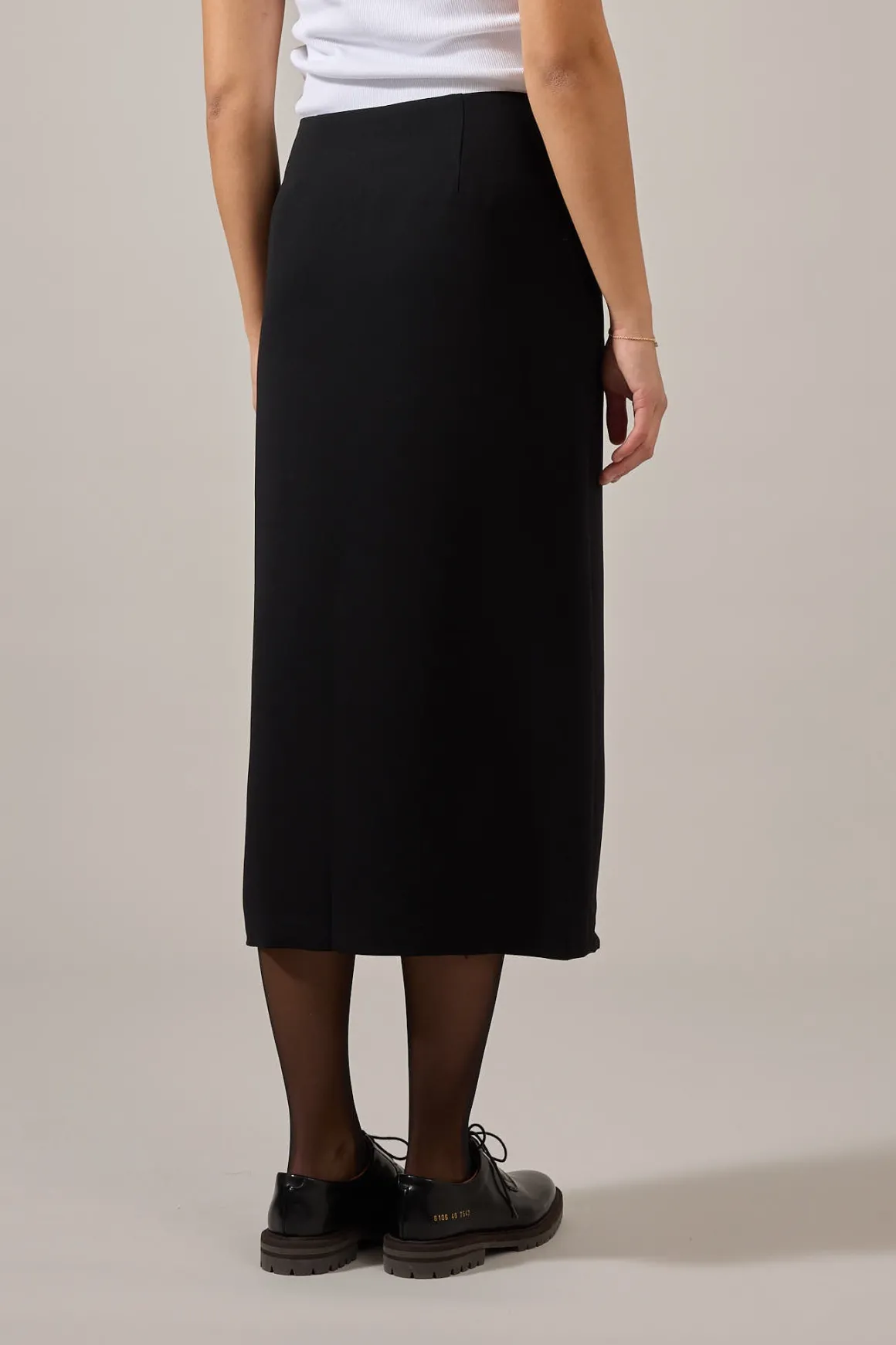 Nishka Black skjørt fra MKDT er et klassisk og tidløst plagg som er utrolig allsidig. Med sitt enkle design og frontsplitt gir det både bevegelsesfrihet og et moderne uttrykk. Skjørtet har en flatterende lengde til midt på leggen, noe som gjør det perfekt for både hverdagsbruk og mer formelle anledninger. Style det med en enkel topp for en avslappet look, eller kombiner det med en bluse eller blazer for en mer sofistikert stil. Nishka-skjørtet er et basisplagg du kan bruke om og om igjen, til enhver anledning.