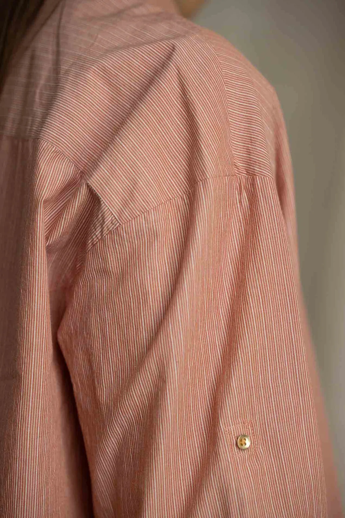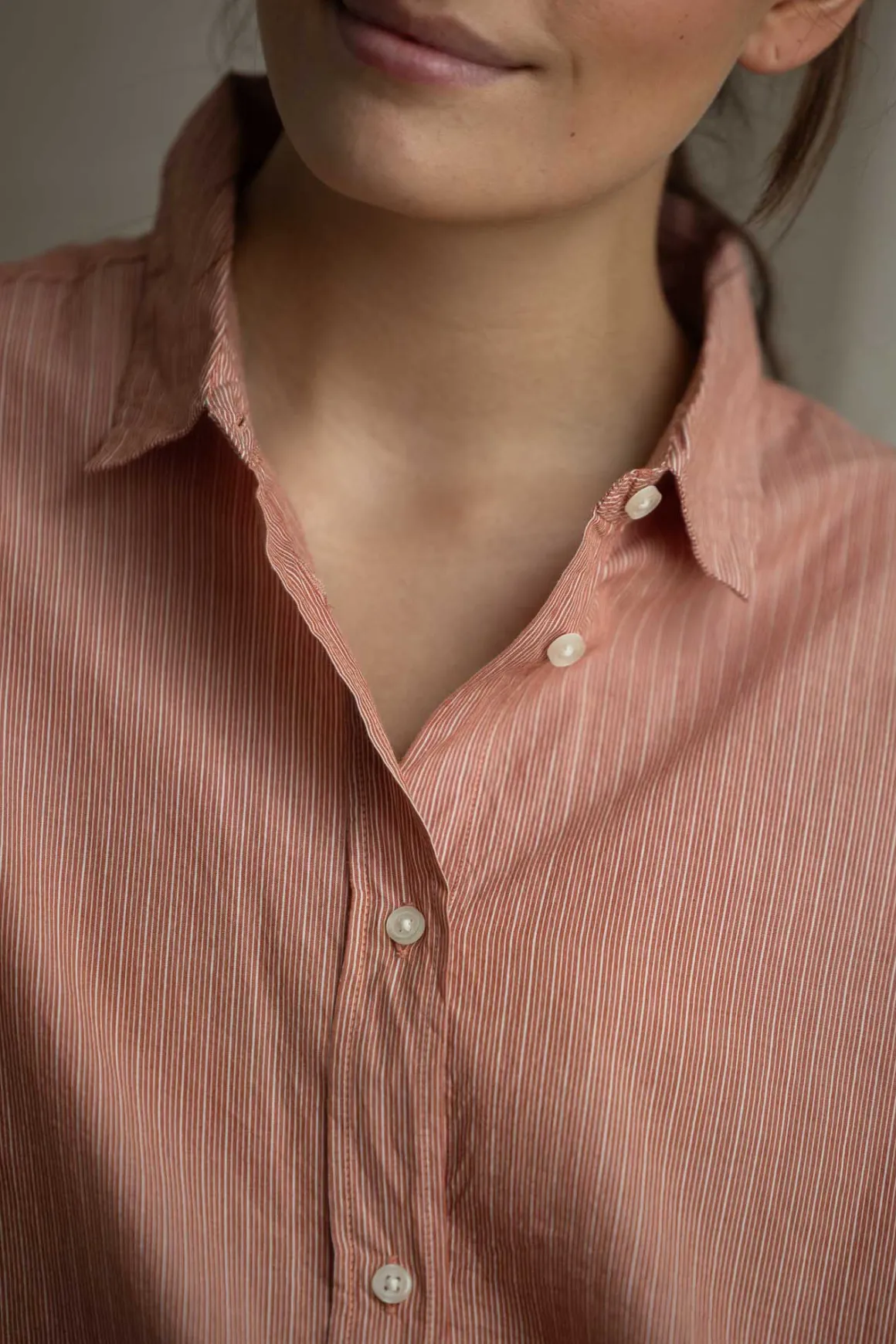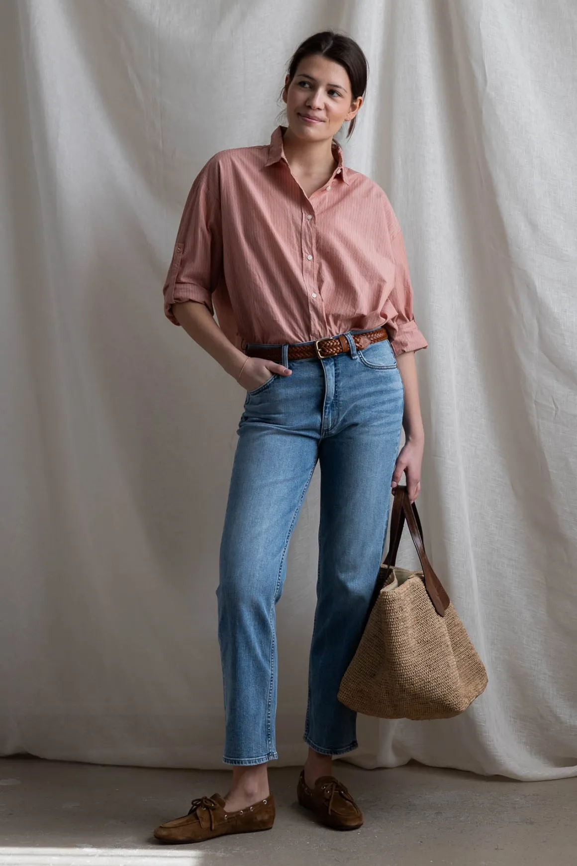 Stripete oversized skjorte fra Aiayu. Skjorten er laget i “crispy” økologisk bomull og har en avslappet stil som går til alt. Designet er minimalistisk med flere gjennomtenkte detaljer som avrundet kant nederst, litt lengre rygg og klassisk krage. Ermene har også en liten stropp med knapp så du enkelt kan rulle de opp på varme dager. Bruk den tucket inn i jeans, skjørt eller shorts.
