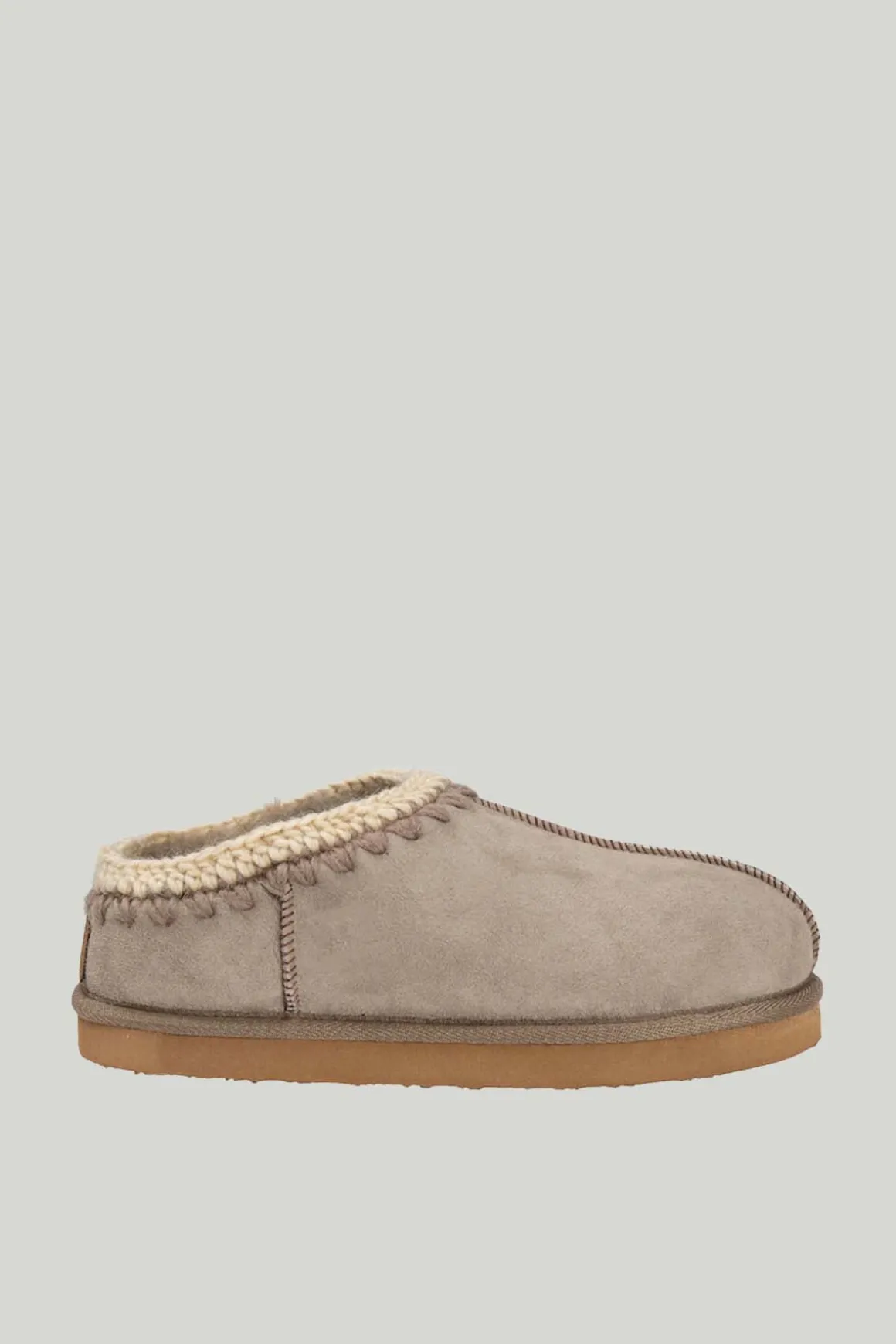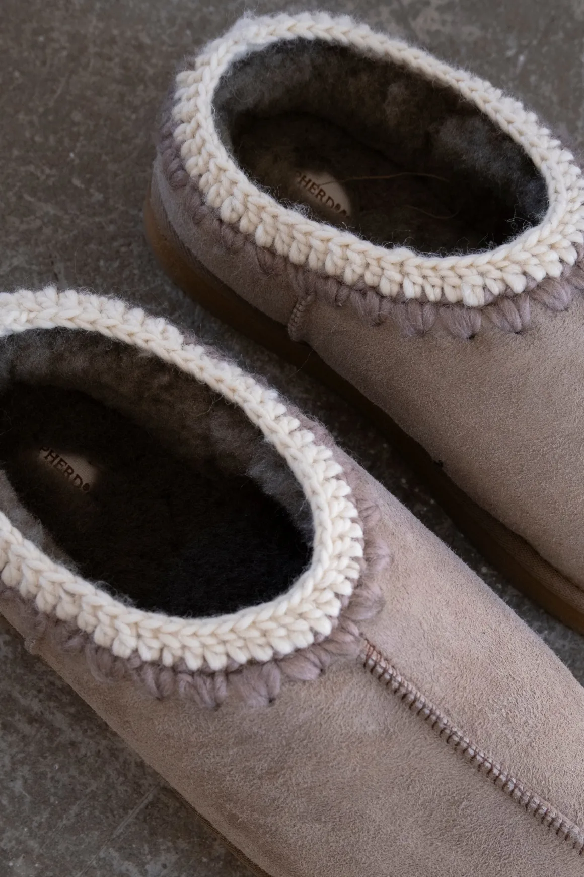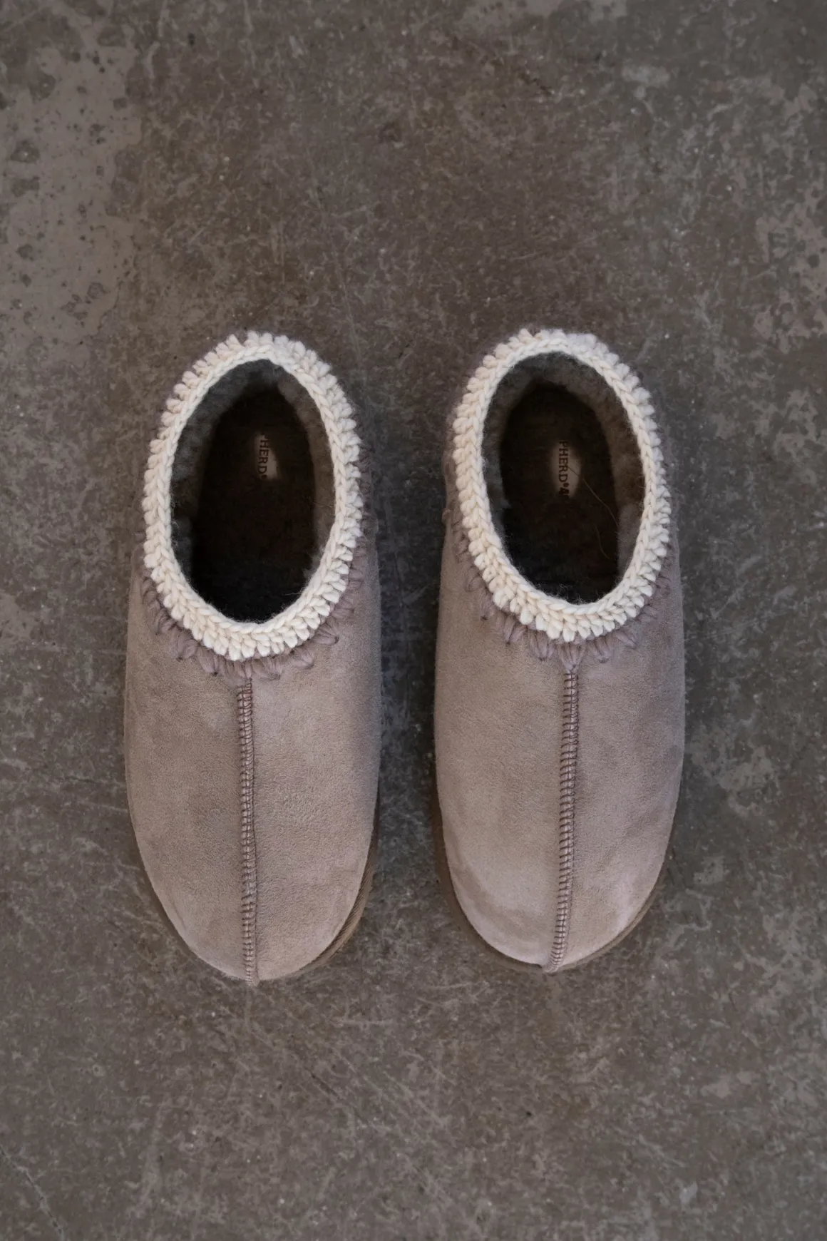 Myke tøfler i saueskinn fra Shepherd. Tøffelen er designet med brodert søm på oversiden, en myk seng av saueull og kantebånd i lys tekstil. Super deilige på hytta, hjemme og på verandaen i sommer.