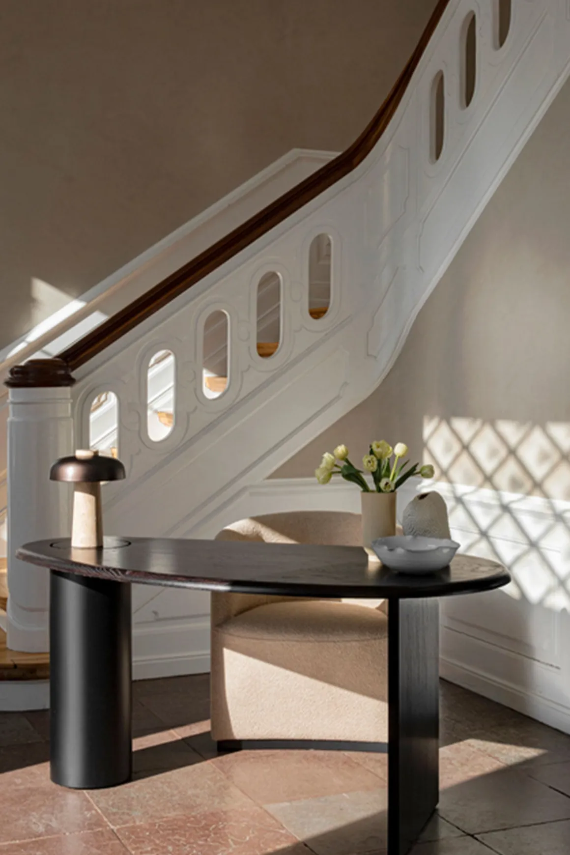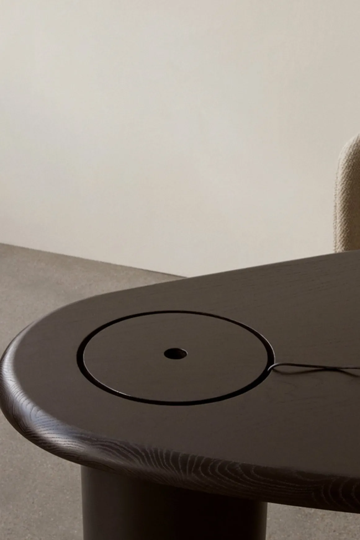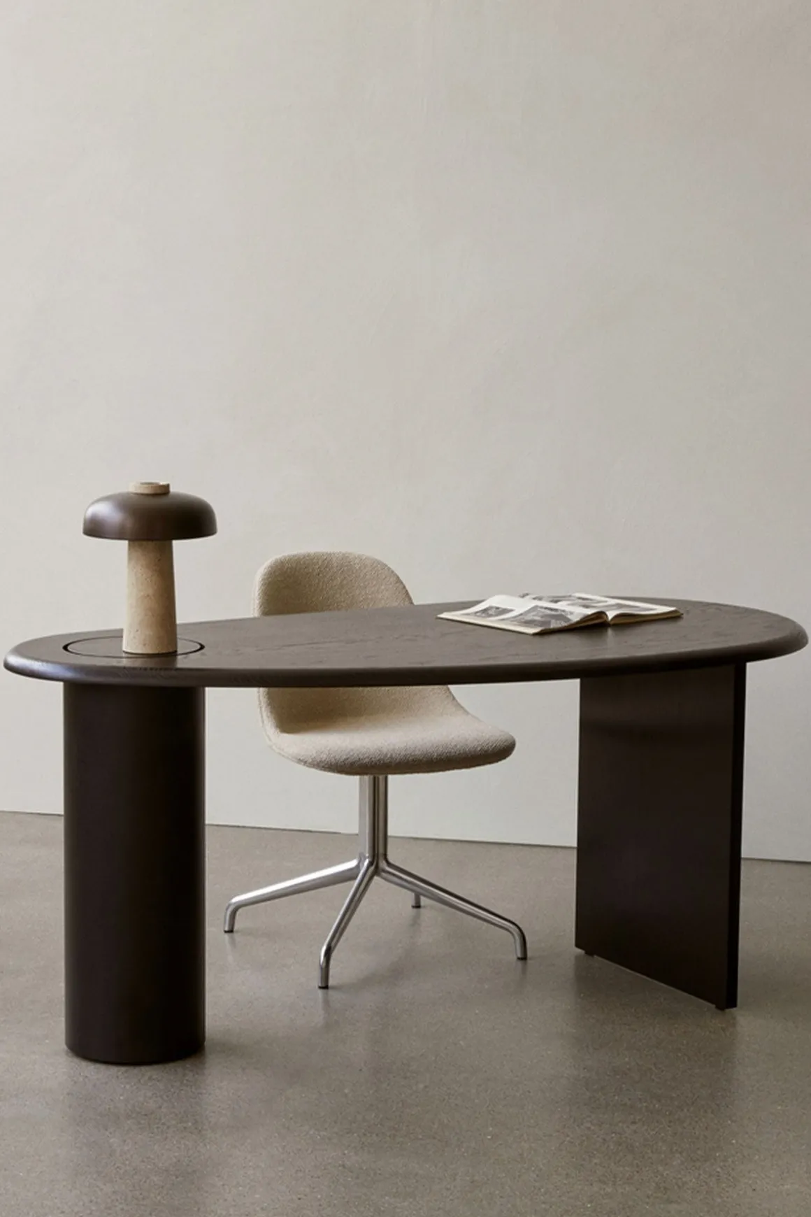 Hvem har sagt at et hjemmekontor må se kjipt ut? Eclipse Desk skrivebord i mørkoljet eik er en skulpturell og gjennomtenkt variant av det praktiske og vante møbelet. Eclipse Desk er en feiring av materialer og form. Oppkalt etter sin konkave og konvekse form som ligner den opplyste passasjen av himmellegemer på himmelen, har Fred Rigby designet en særegen, asymmetrisk silhuett. Skrivebordet er tilgjengelig i massiv eik, mørkoljet eik og naturlig, oljet eik med svartmalte ben. Bordplaten er utstyrt med et lokk som kan løftes opp og benyttes som en skjult lagringsplass i den støttende stålsøylen, noe som sikrer at skrivebordsplassen forblir fri for rot. Eclipse er designet for å stå alene som et midtpunkt i rommet eller plassert langs en vegg for et mer konvensjonelt hjemmekontor. Uansett vil skrivebordets spennende forme fungere som et blikkfang.