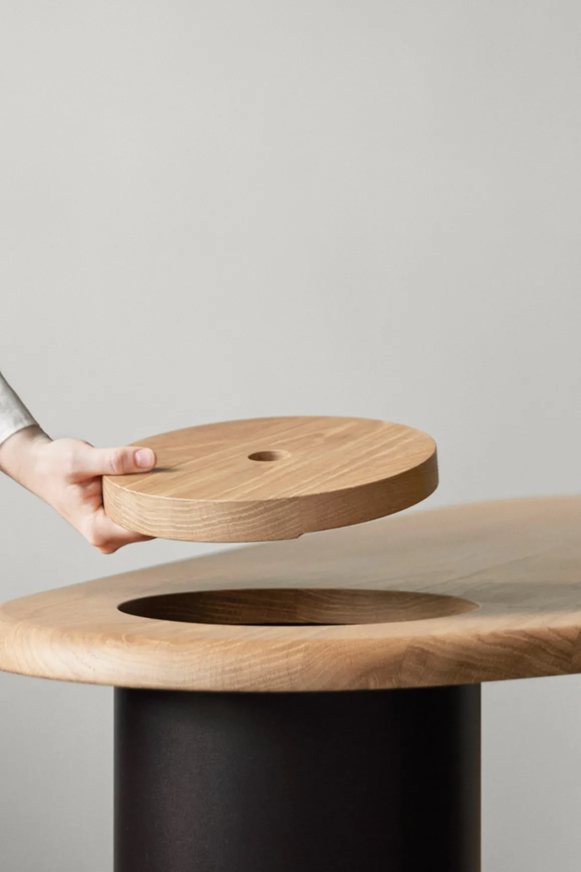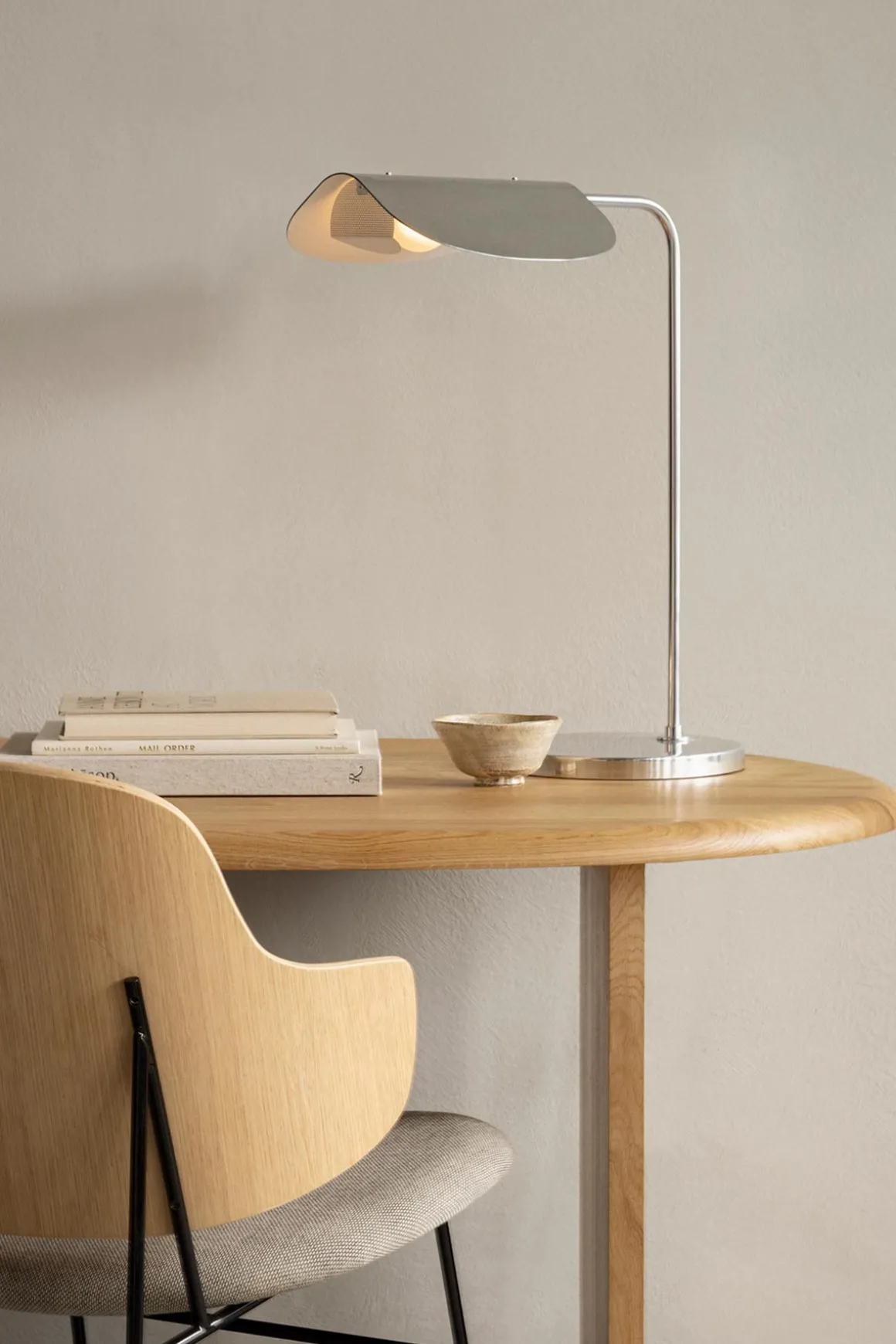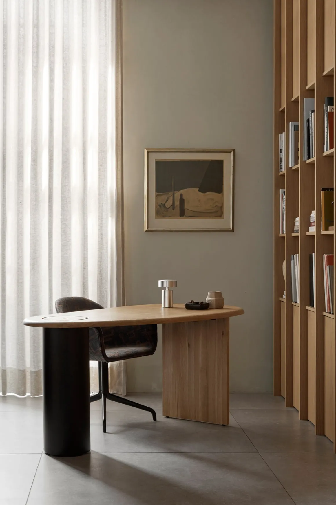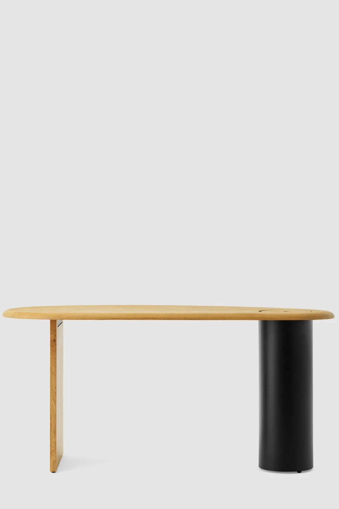 Hvem har sagt at et hjemmekontor må se kjipt ut? Eclipse Desk skrivebord i naturlig, oljet eik er en skulpturell og gjennomtenkt variant av det praktiske og vante møbelet. Eclipse Desk er en feiring av materialer og form. Oppkalt etter sin konkave og konvekse form som ligner den opplyste passasjen av himmellegemer på himmelen, har Fred Rigby designet en særegen, asymmetrisk silhuett. Skrivebordet er tilgjengelig i massiv eik, mørkoljet eik og naturlig, oljet eik med svartmalte ben. Bordplaten er utstyrt med et lokk som kan løftes opp og benyttes som en skjult lagringsplass i den støttende stålsøylen, noe som sikrer at skrivebordsplassen forblir fri for rot. Eclipse er designet for å stå alene som et midtpunkt i rommet eller plassert langs en vegg for et mer konvensjonelt hjemmekontor. Uansett vil skrivebordets spennende forme fungere som et blikkfang.